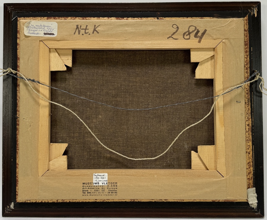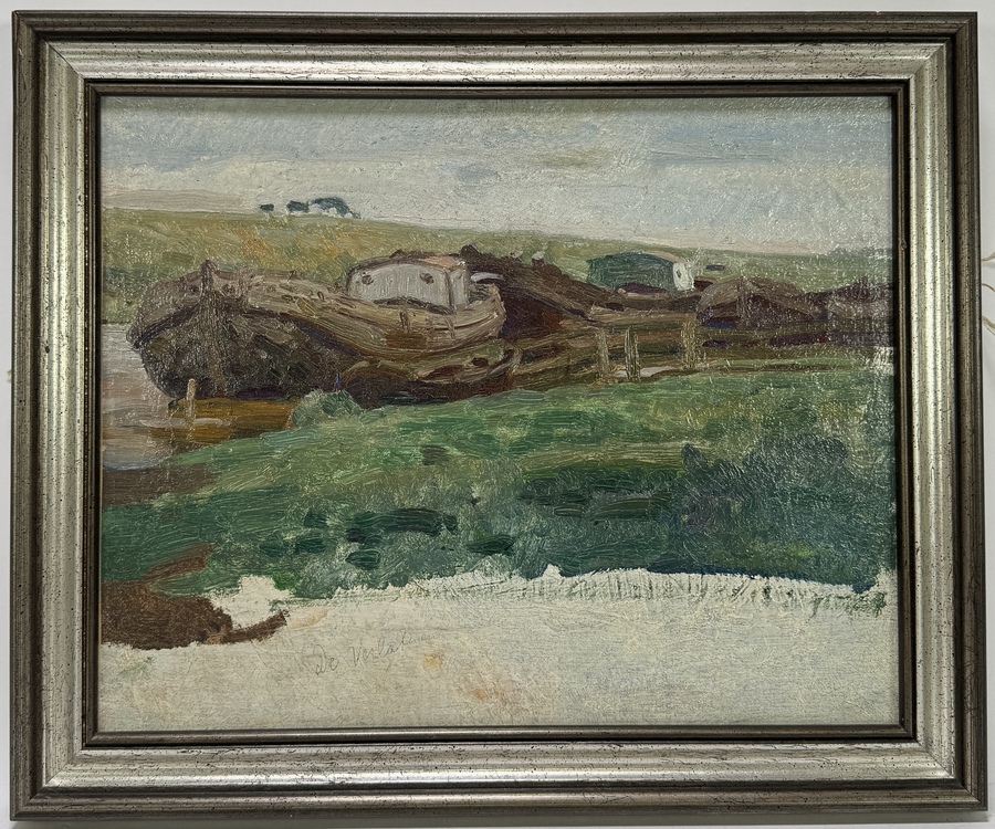 Schilderij getiteld "De Verlatenen" door Reinhart Dozy (Nijmegen, 28 september 1880 – Elp, 27 januari 1947) met een rivierlandschap en afgemeerde schepen. Olieverf op doek, geschilderd in impressionistische stijl, Nederland, eerste helft 20e eeuw. Het werk bevindt zich in een zilverkleurige lijst en draagt op de achterzijde een label van Museum Vledder met registratienummer “N.T.K. 284”.