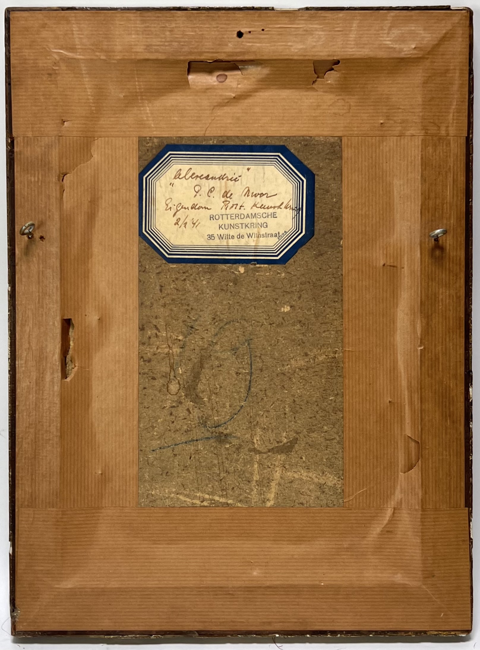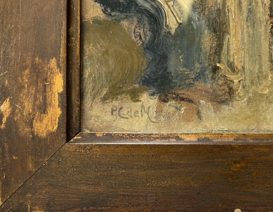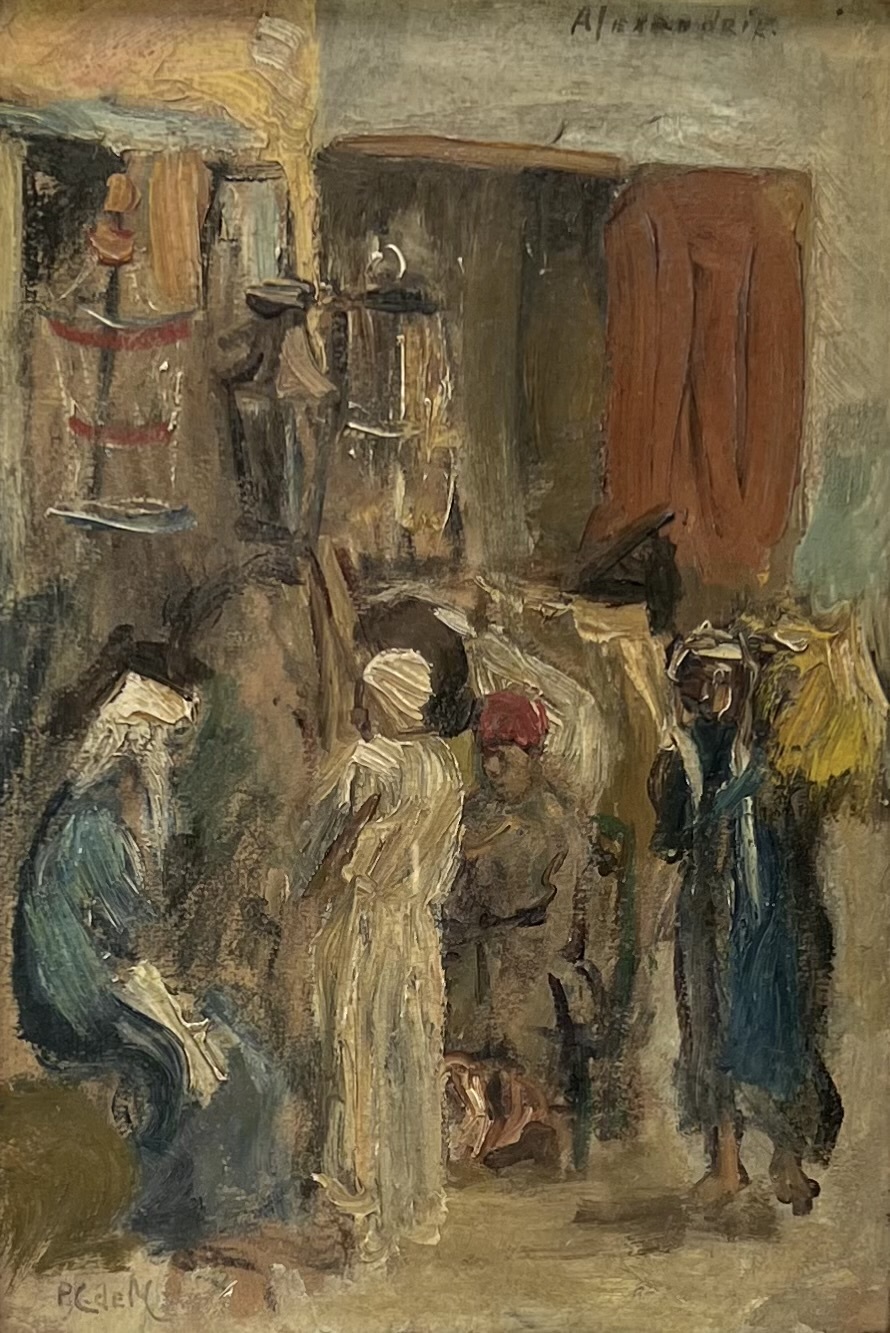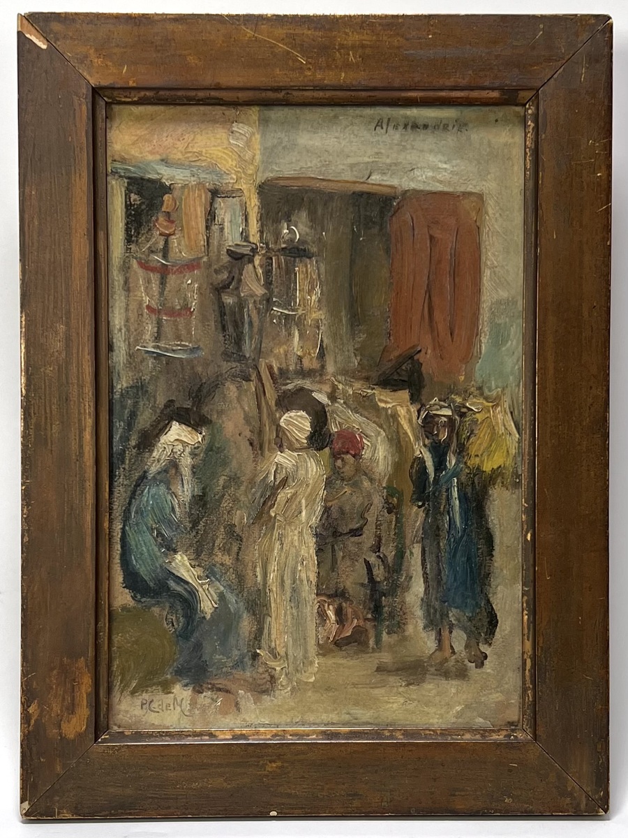 Olieverf op schilderskarton in impressionistische stijl met oriëntalistische invloeden door Pieter Cornelis de Moor (1866–1953), getiteld “Alexandrië”, eerste helft 20e eeuw. Het toont een straattafereel met figuren in traditionele kledij in warme aardetinten en blauw. Gesigneerd linksonder en getiteld bovenaan, met Rotterdamsche Kunstkring-etiket op de achterzijde. Geïnteresseerd? Bezoek onze kijkdagen op 28, 29 of 30 november van 11:00 tot 17:00 uur! |