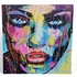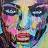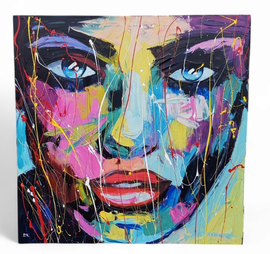 Acrylverf op doek, uitgevoerd in hedendaags expressionisme, circa 1990–2020, Europa. Het werk is een geabstraheerd vrouwelijk portret met felle, contrasterende kleuren. Kenmerkend is de dikke impasto verfapplicatie en de dynamische verfspatten (dripping) over de gehele voorstelling. De helderblauwe ogen vormen het centrale figuratieve element in dit expressieve schilderij. Linksonder gesigneerd E.R.