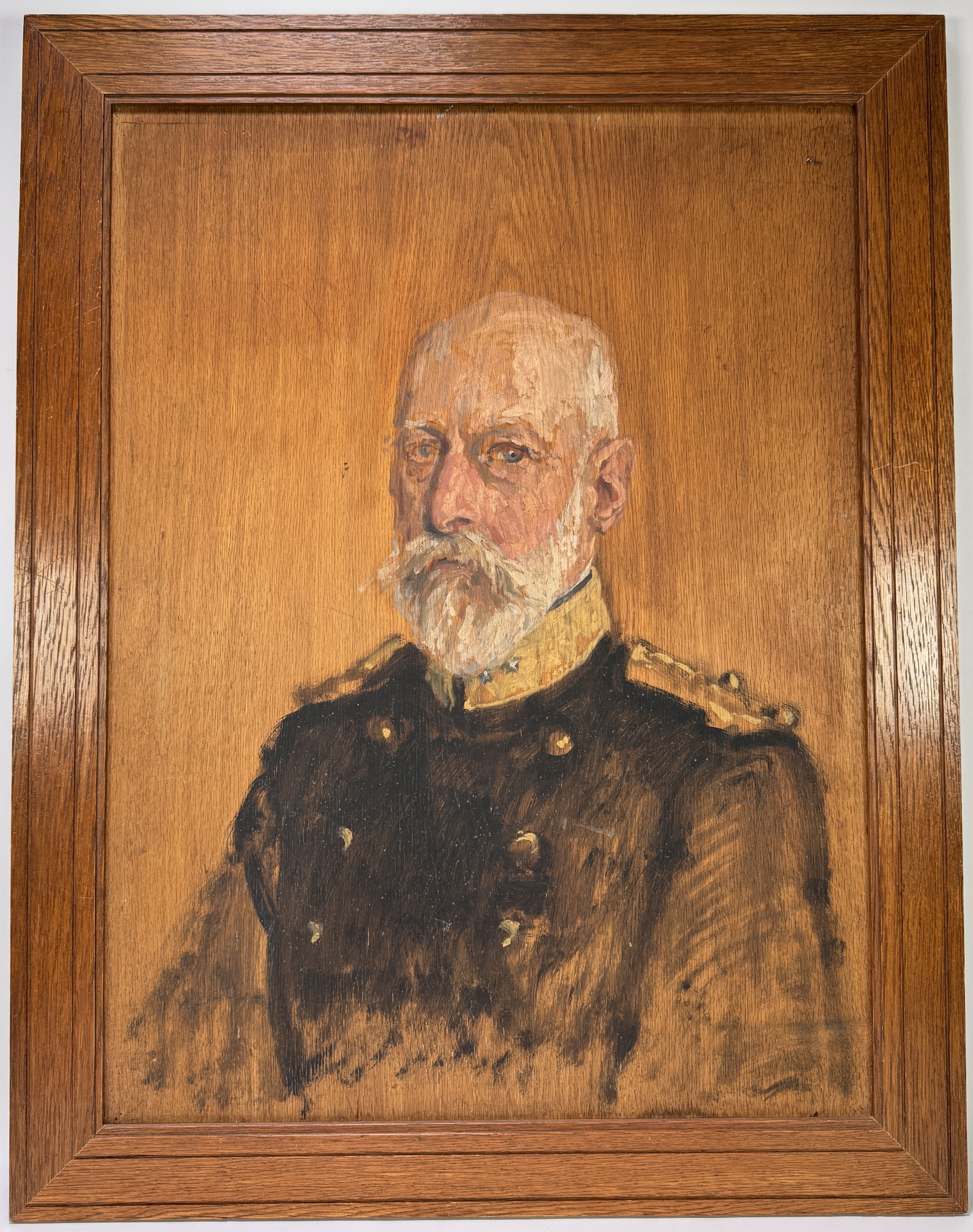 Olieverf op paneel, begin 20e eeuw. Portret van een oudere man met witte baard in donker militair uniform met details, uitgevoerd in een laat-realistische stijl met impressionistische penseelvoering. De sobere achtergrond en het zichtbare hout versterken de expressieve uitstraling van het portret. Het werk is voorzien van een bijpassende houten lijst. Klaar om te bieden? Registreer je nu en doe mee aan de veiling! |