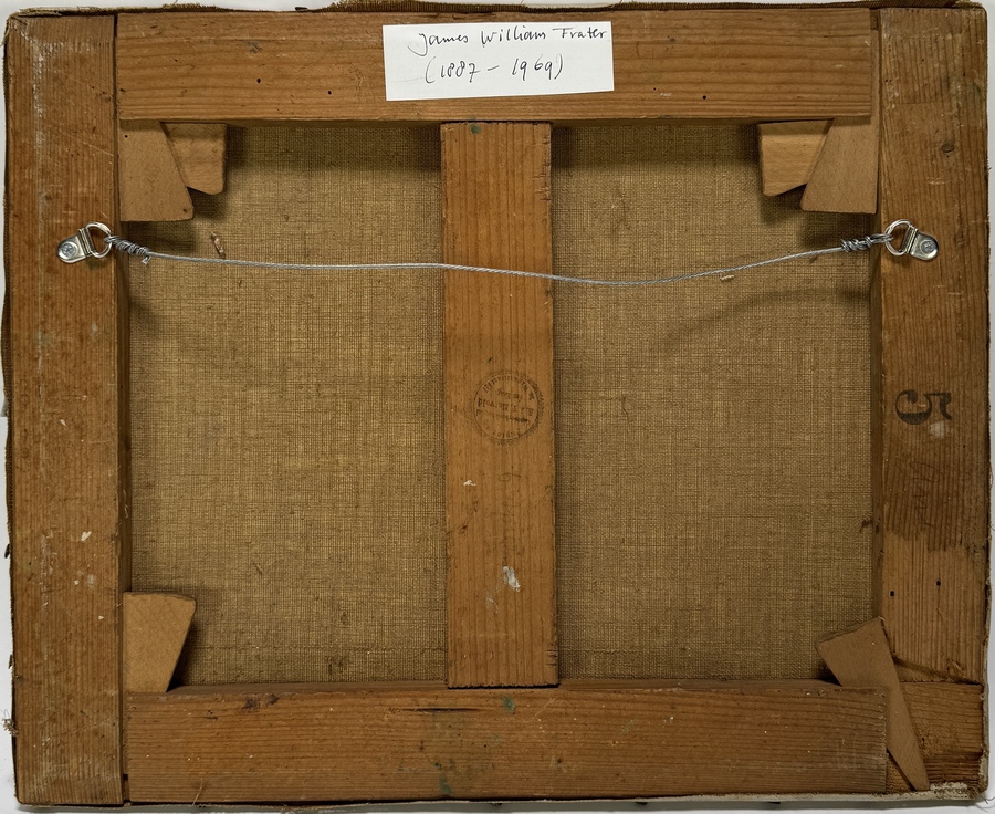 Olieverfschilderij, James William Frater – doorgang met karren, eerste helft 20e eeuw