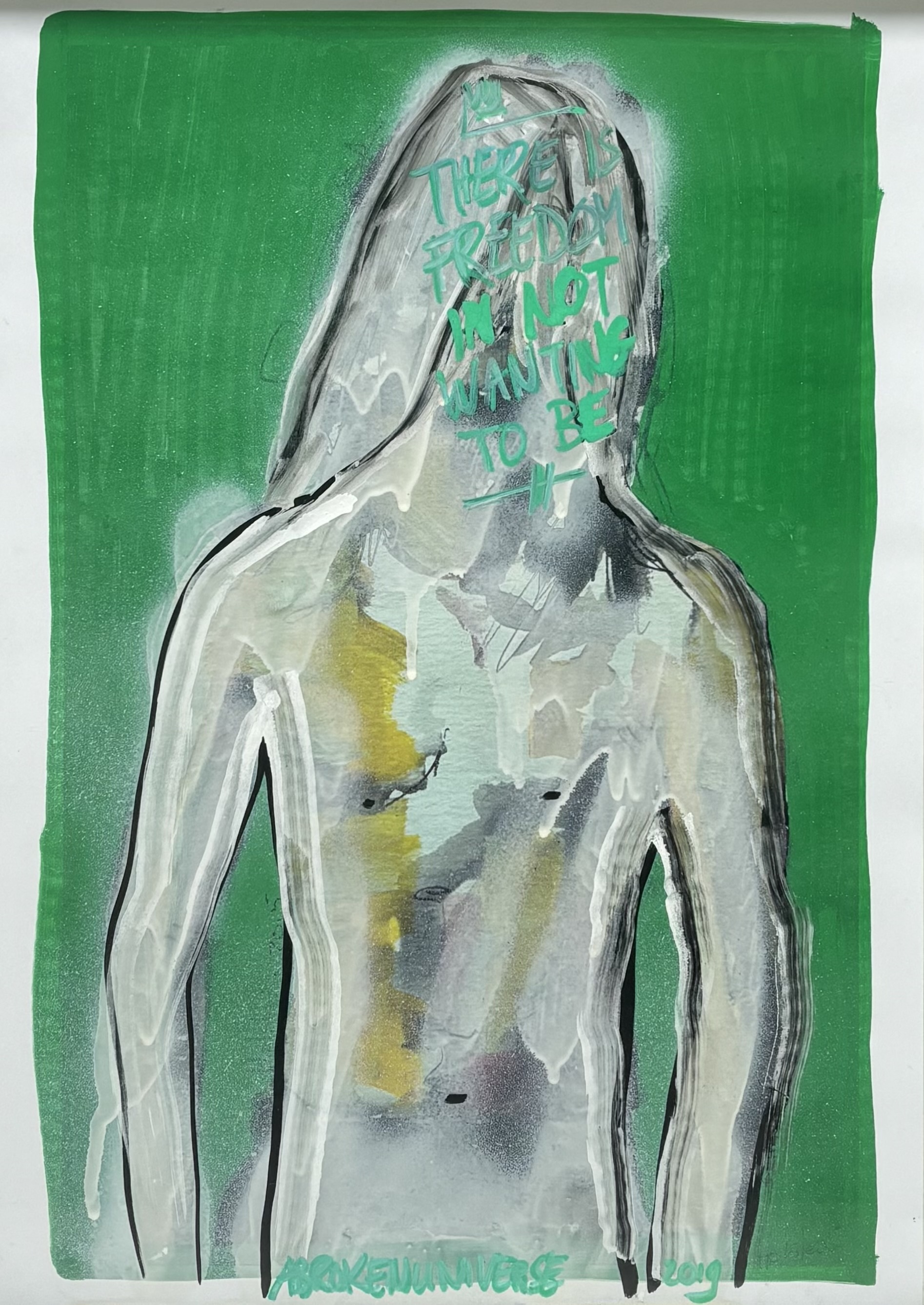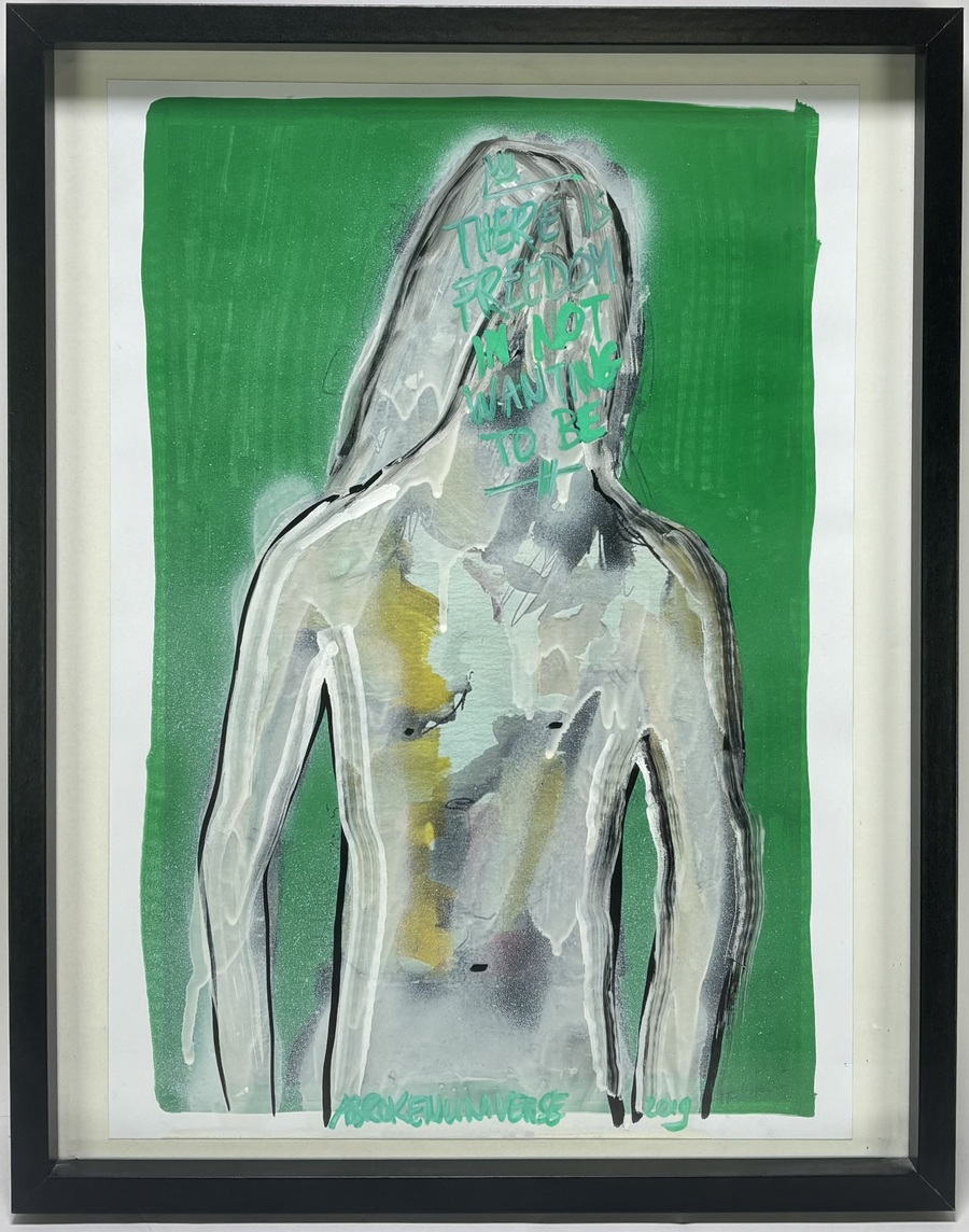 Mixed media op papier door A BROKEN UNIVERSE (Ecuadoraanse kunstenaar, gevestigd in Nederland), gedateerd 2019, in een hedendaagse figuratieve straatkunststijl met popart invloeden. De voorstelling toont een vooraanzicht van een lichaam tegen een groene achtergrond, met in de compositie geïntegreerde tekst "There is freedom in not wanting to be". Het werk combineert acrylverf, signatuur “ABROKENUNIVERSE 2019” onderaan. Registreer nu en bied eenvoudig online mee op dit werk! |