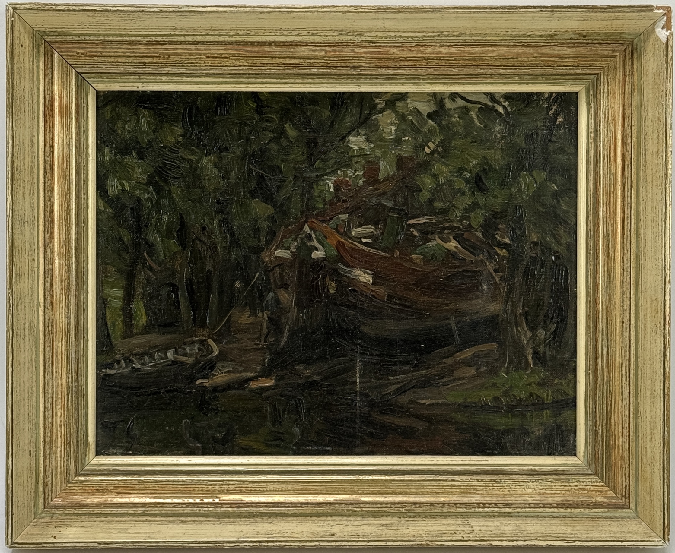 Olieverfschilderij – boslandschap met boten, Nederland, ca. 1930