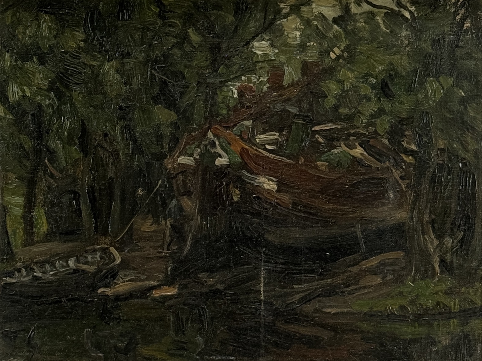 Schilderij in impressionistische stijl, uitgevoerd in olieverf op doek, eerste helft 20e eeuw. De voorstelling toont een bosrijk landschap met twee boten aan de oever, weergegeven met losse penseelstreken, pasteuze verfopbouw en donker kleurgebruik. Het werk is uitgevoerd door een anonieme schilder uit de Nederlandse school en bevindt zich in een houten lijst met profielrand. Wil je dit schilderij in het echt bekijken? Kom naar de kijkdagen op 28, 29 en 30 november! |
