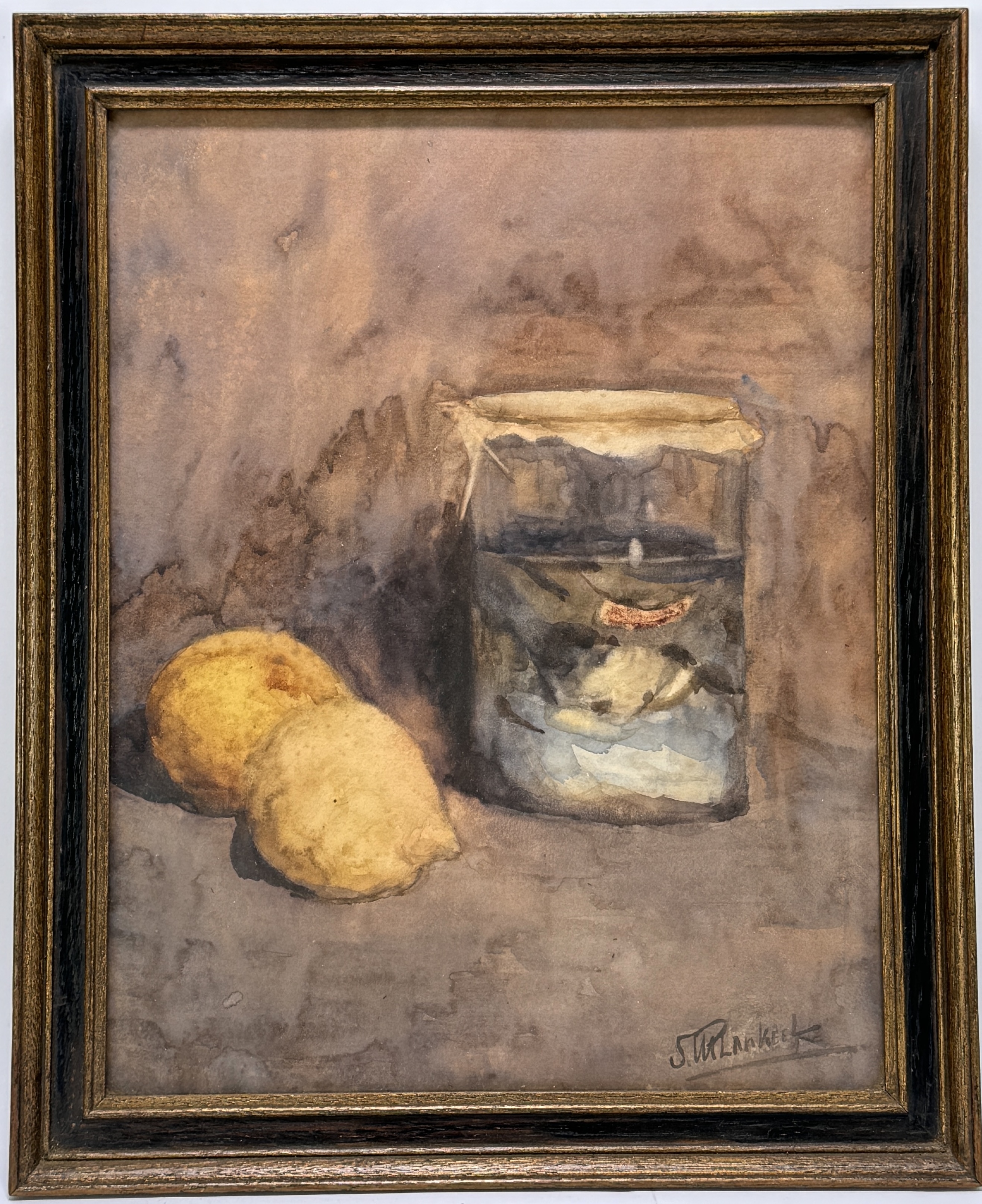 Aquarel op papier toont een stilleven, gesigneerd rechtsonder, uitgevoerd in een impressionistische stijl uit de eerste helft 20e eeuw. Het werk toont in gedempte aardetinten een compositie van een glazen pot met vis, vergezeld van twee gele citroenen op een donkere ondergrond. Jouw kans op deze aquarel begint met registreren – bied live of online mee! |