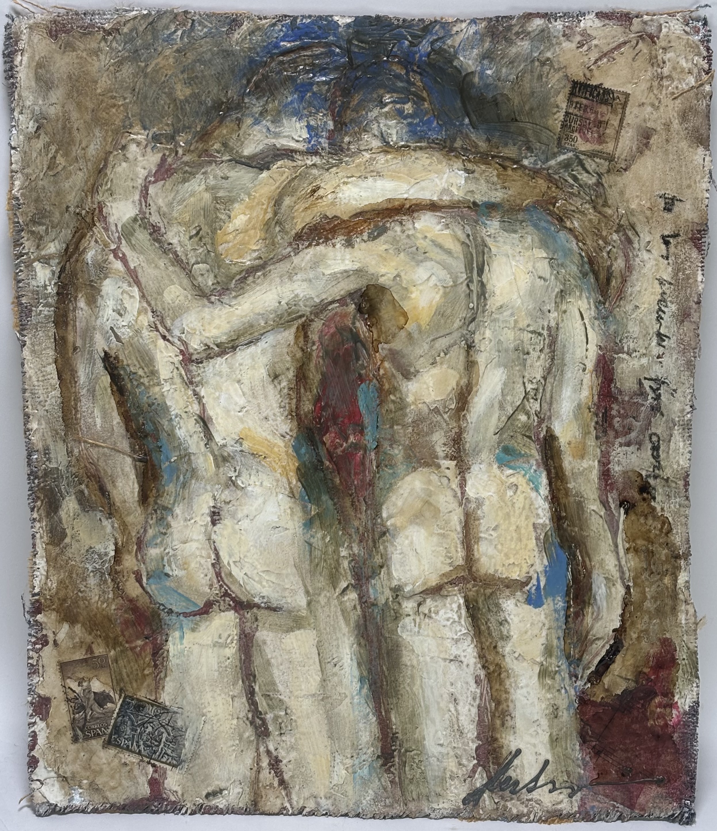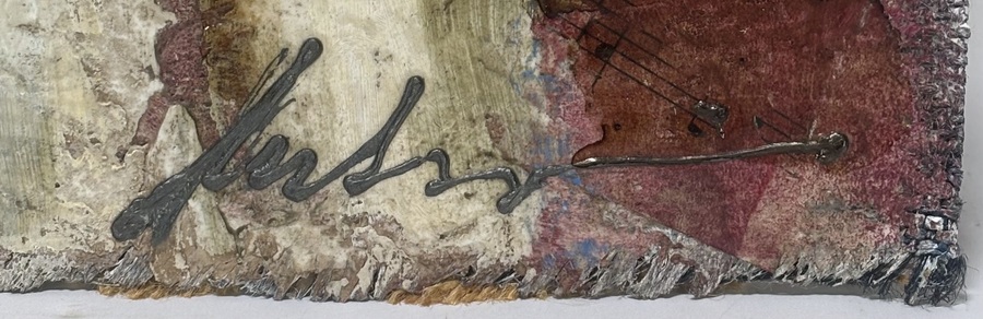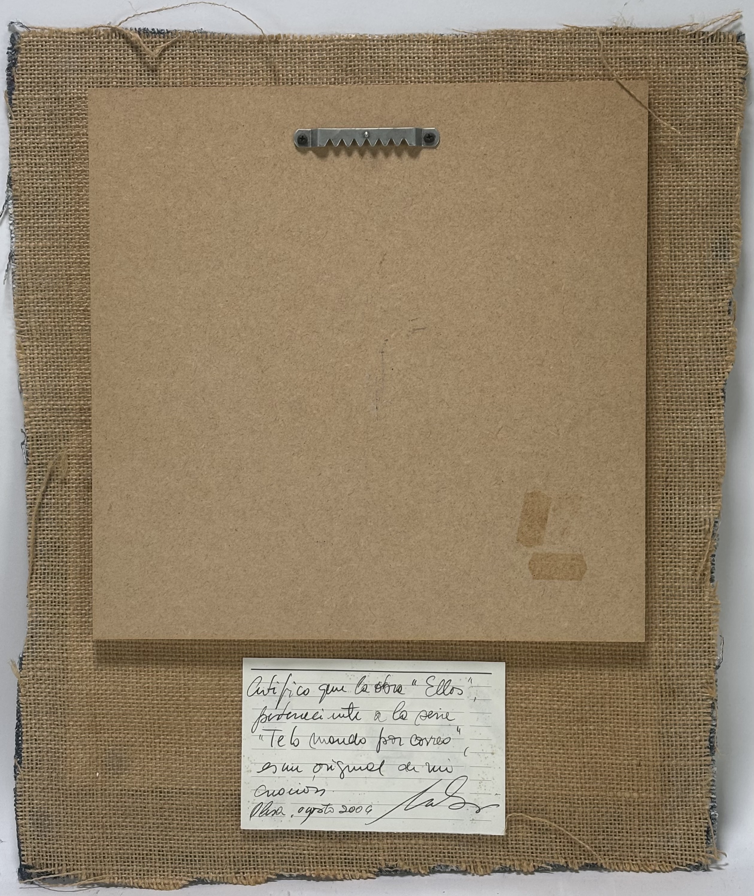 Olieverf in mixed media op grof linnen doek door Andrés, getiteld “Ellos” en gedateerd 2006. In abstract-expressionistische stijl toont het schilderij overlappende menselijke figuren in rug aanzicht met aardse kleuren en accenten in rood en blauw. Het werk bevat collage-elementen zoals postzegels. Rechtsonder gesigneerd “Andrés” en vergezeld van een handgeschreven verklaring op de achterzijde. Dit schilderij zelf beoordelen? Je bent welkom op onze kijkdagen op 28, 29 en 30 november! |