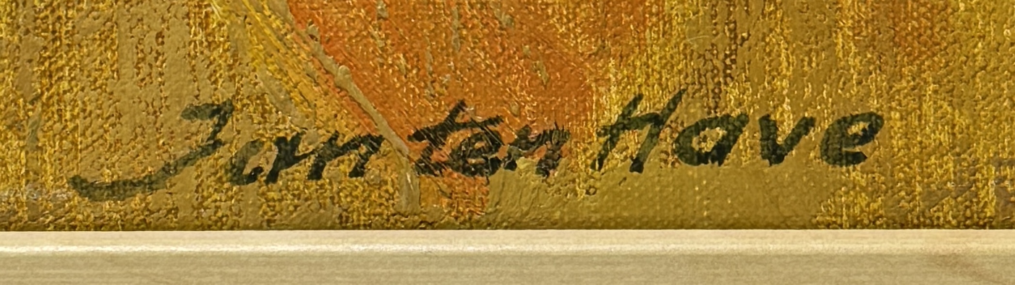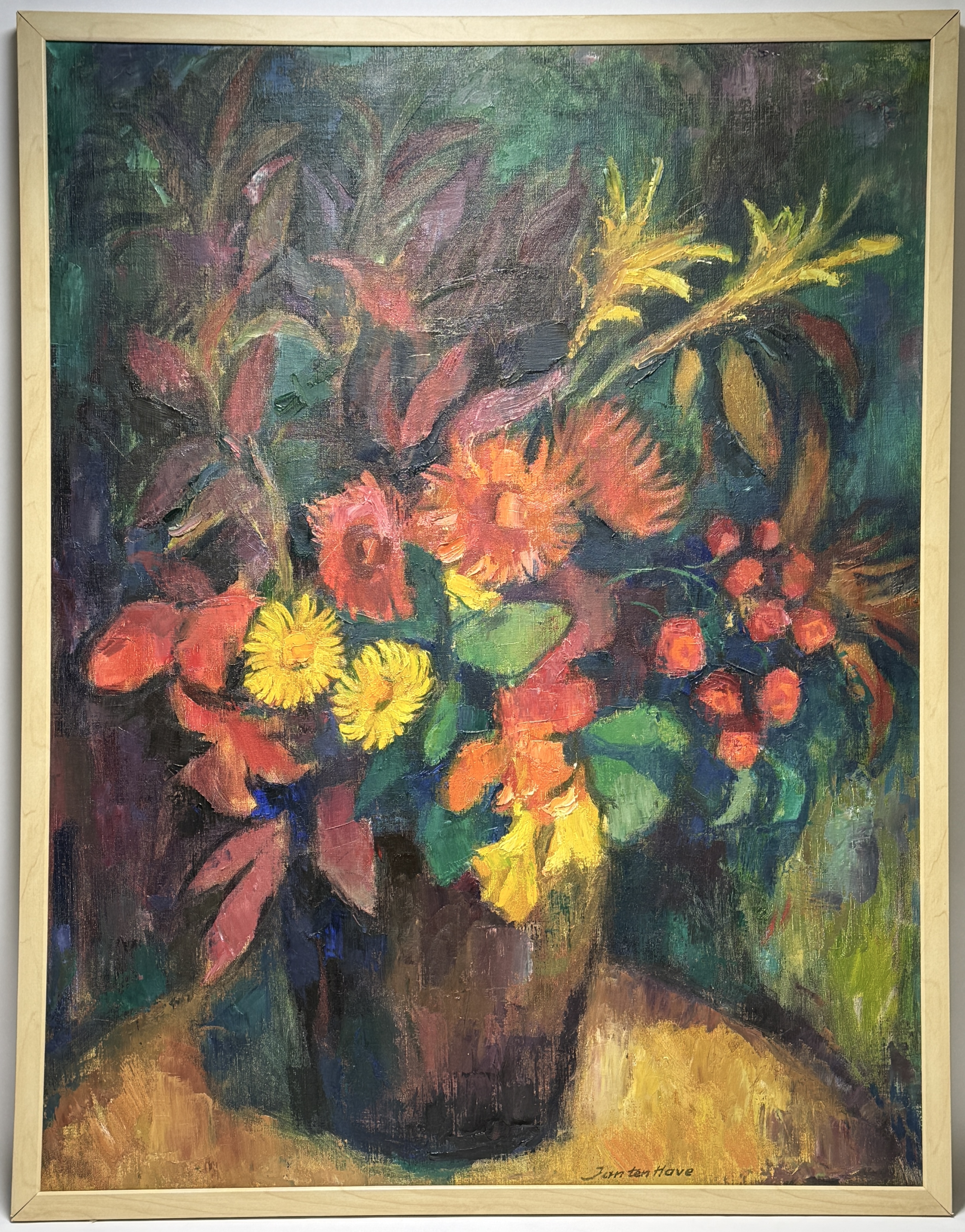 Olieverfschilderij op doek door Jan ten Have (1903–1991), circa 1940–1955, uitgevoerd in een krachtige expressionistische stijl. De voorstelling is een bloemstilleven met felle herfstkleuren rood, oranje en geel tegen een donkergroene achtergrond. Ten Have was lid van de Groninger kunstenaarsvereniging De Ploeg. Gesigneerd "Jan ten Have" rechtsonder. Wil je dit schilderij in het echt bekijken? Kom naar de kijkdagen op 28, 29 en 30 november! |