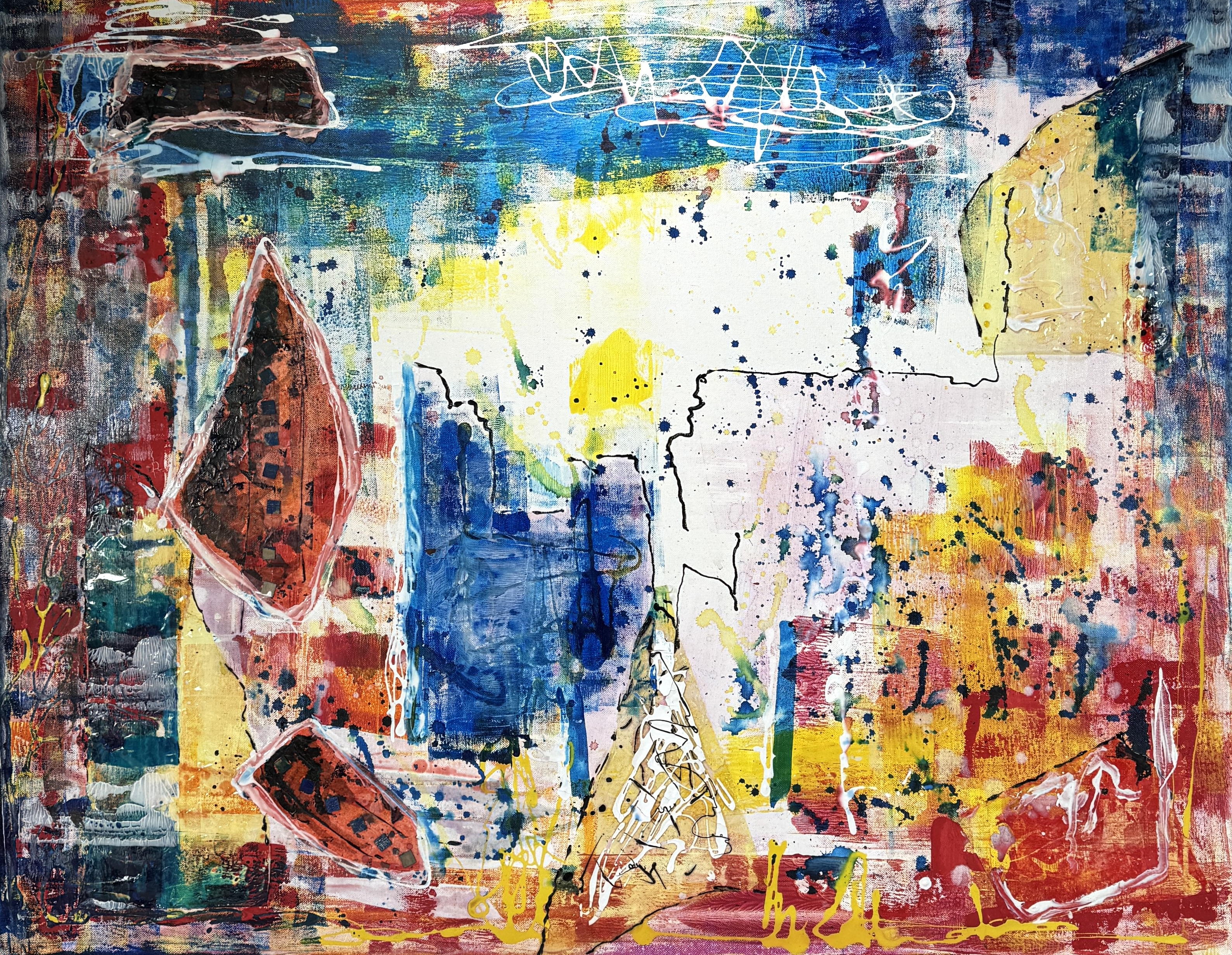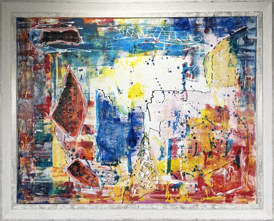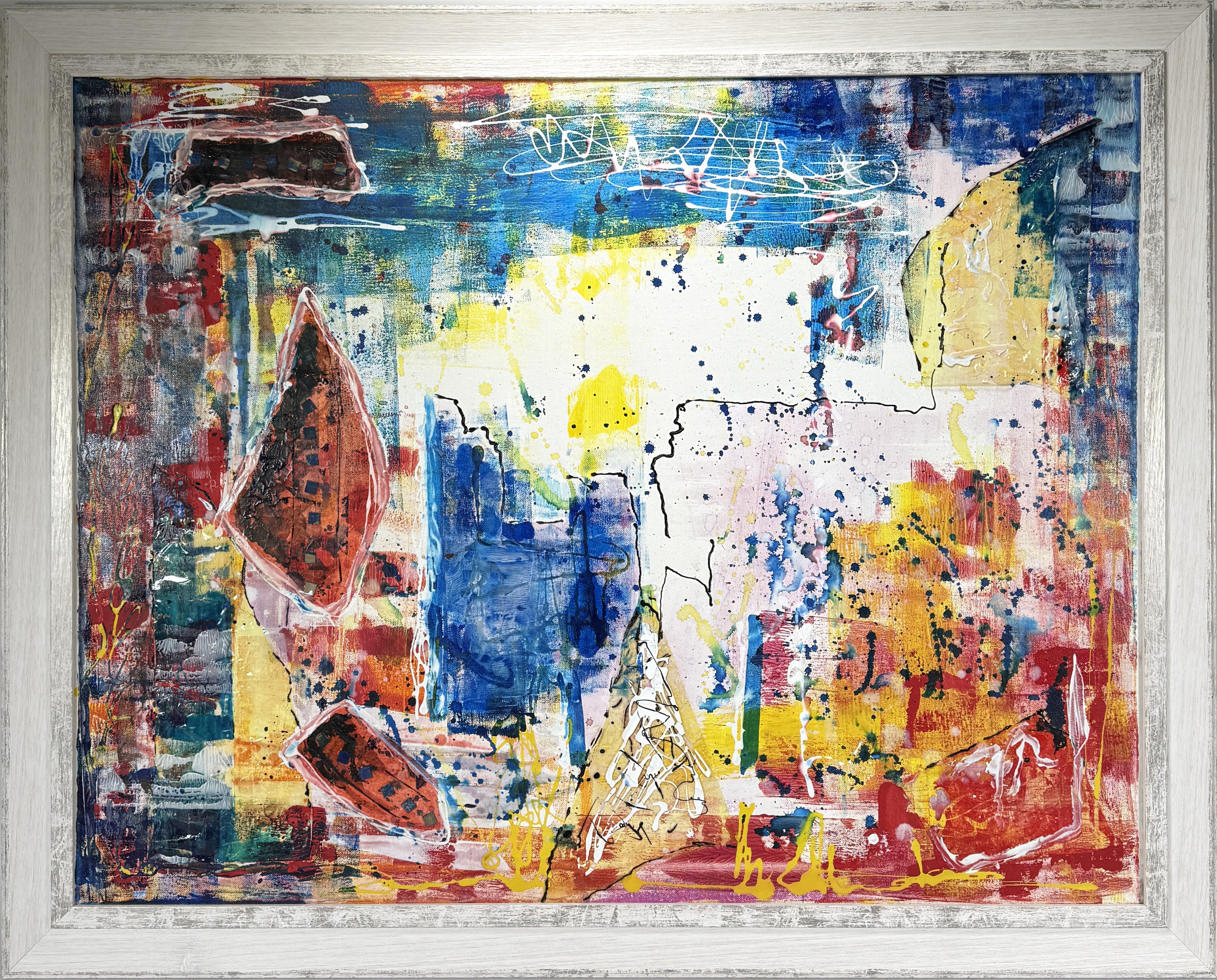 Abstract schilderij op doek met gemengde techniek van acrylverf, plastic folie en stukjes karton op doek, uitgevoerd in abstract expressionistische stijl en gedateerd 21e eeuw. De non-figuratieve compositie wordt gekenmerkt door een dynamisch kleurpalet van rood, geel en blauw, met een gelaagde verfopbouw en toevoeging van witte spatten en krassen. Gebruik van repen plastic folie en uitgeknipte stukjes karton. Dit schilderij zelf beoordelen? Je bent welkom op onze kijkdagen op 28, 29 en 30 november |