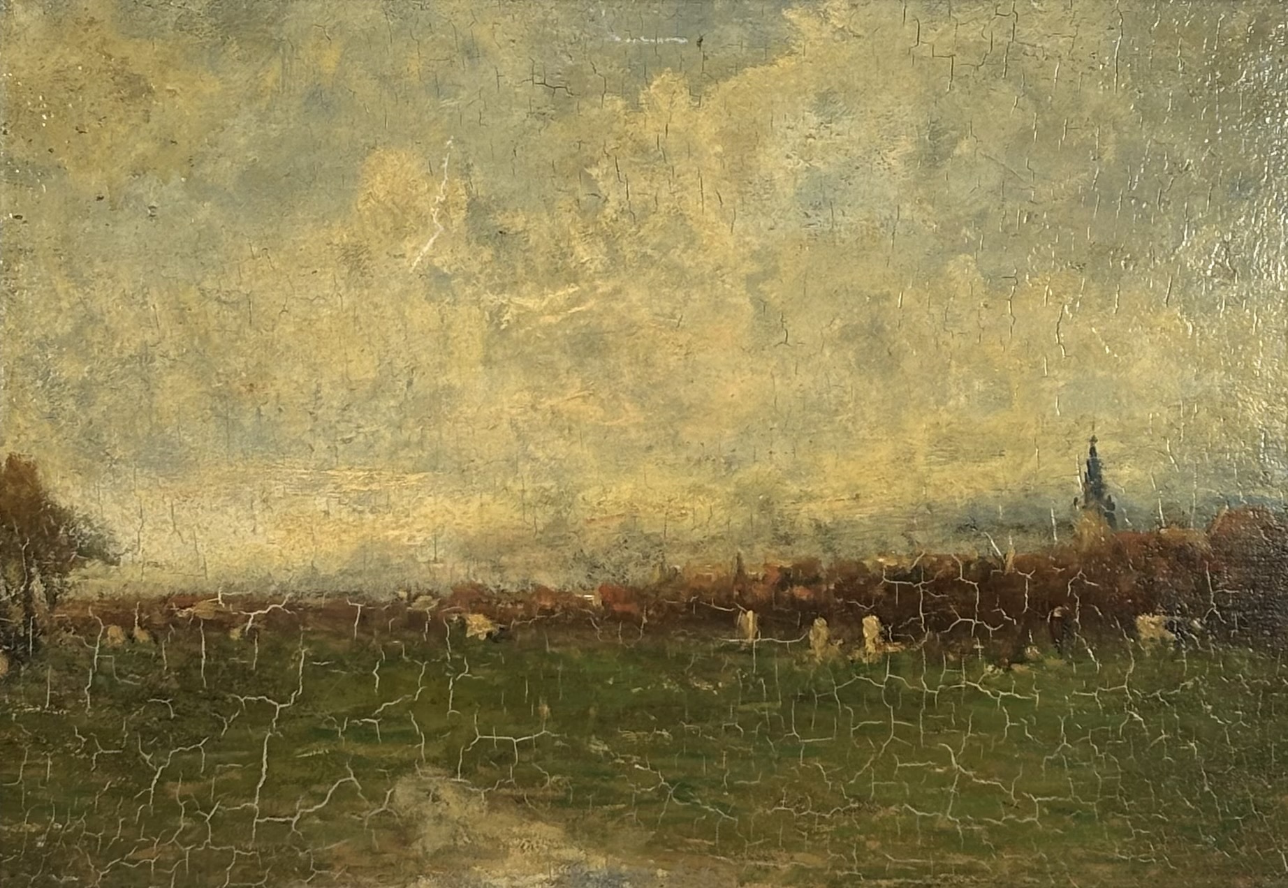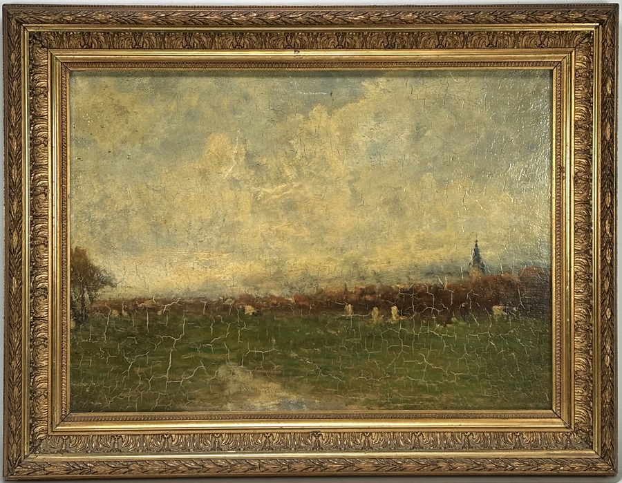 Schilderij uit de tweede helft van de 19e eeuw, in Haagse School, olieverf op paneel. Het toont een Hollands weidelandschap met grazende koeien en een dorp met kerktoren aan de horizon, onder een brede bewolkte lucht. Uitgevoerd in sobere groentinten en okergeel met realistische lichtwerking en vertoont sterke craquelure. Het werk bevindt zich in een goudkleurige lijst. Geïnteresseerd? Bezoek onze kijkdagen op 28, 29 of 30 november van 11:00 tot 17:00 uur! |