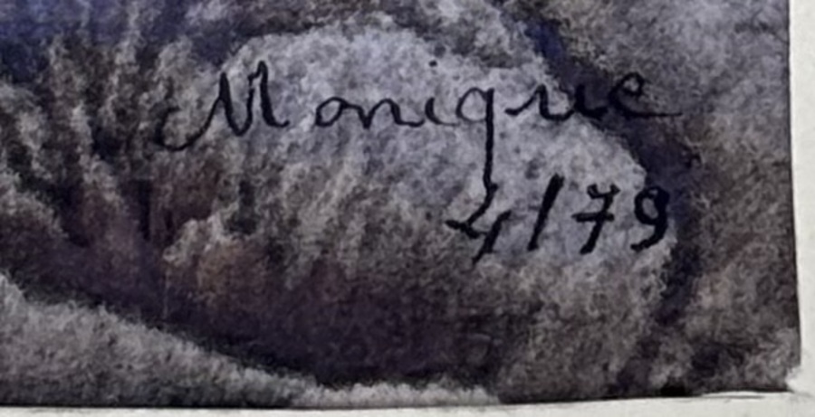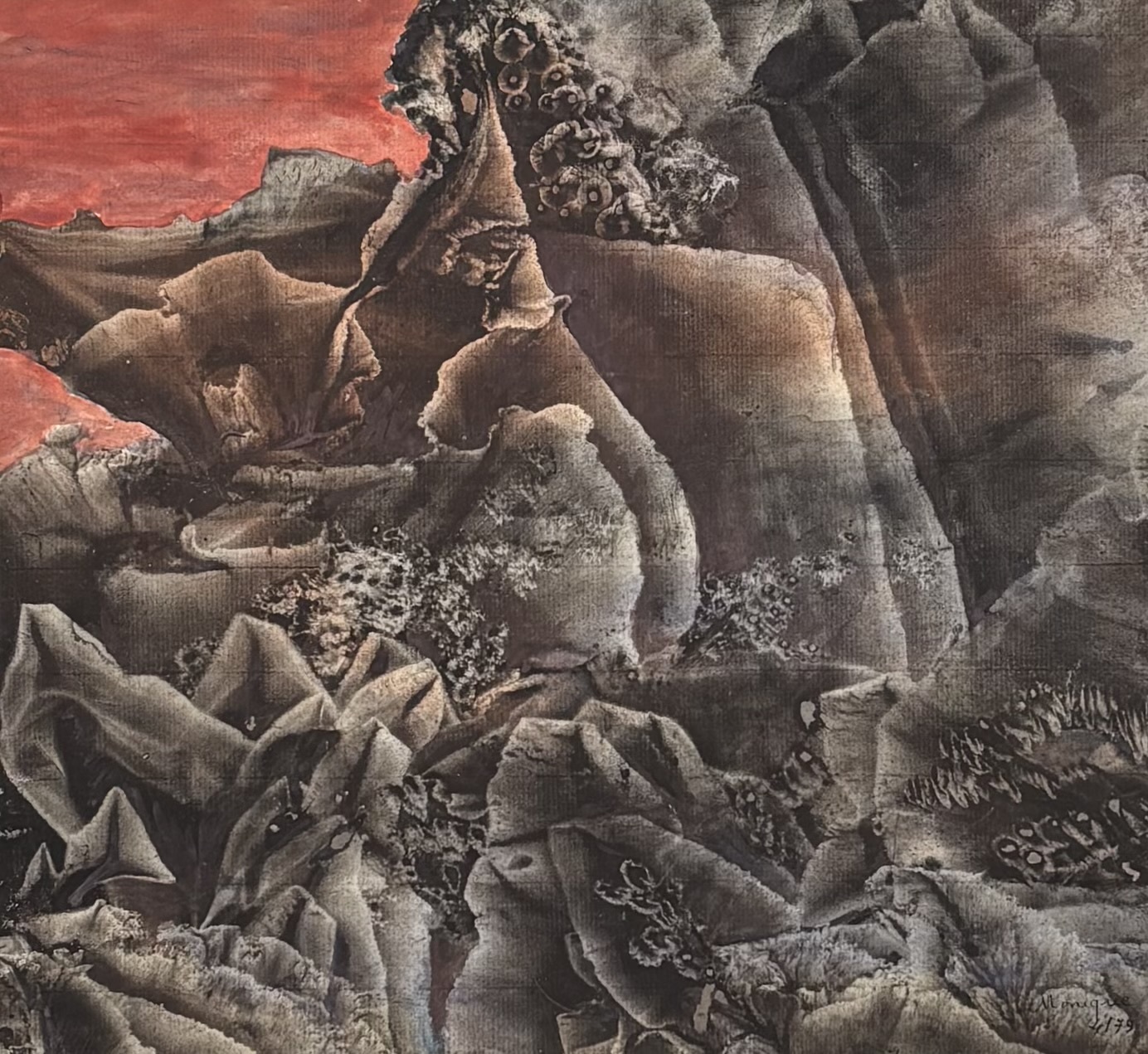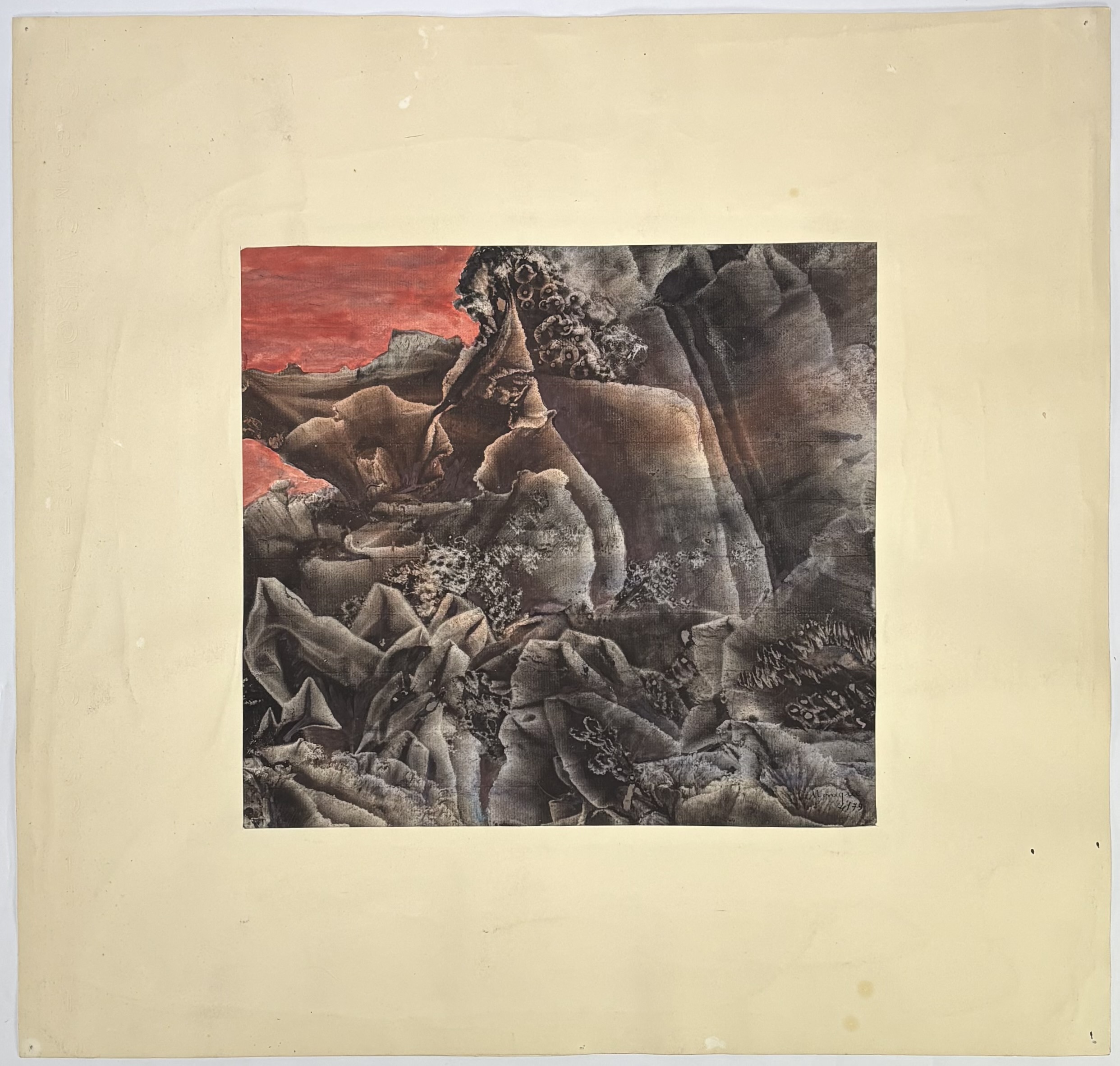 Aquarel op papier, gesigneerd Monique rechtsonder en genummerd 4/79, uitgevoerd in surrealistisch-abstracte stijl. De voorstelling toont een dramatisch rotsachtig landschap met diepe schaduwpartijen en een rode lucht. Europese herkomst, tweede helft 20e eeuw. Geïnteresseerd? Bezoek onze kijkdagen op 28, 29 of 30 november van 11:00 tot 17:00 uur! |