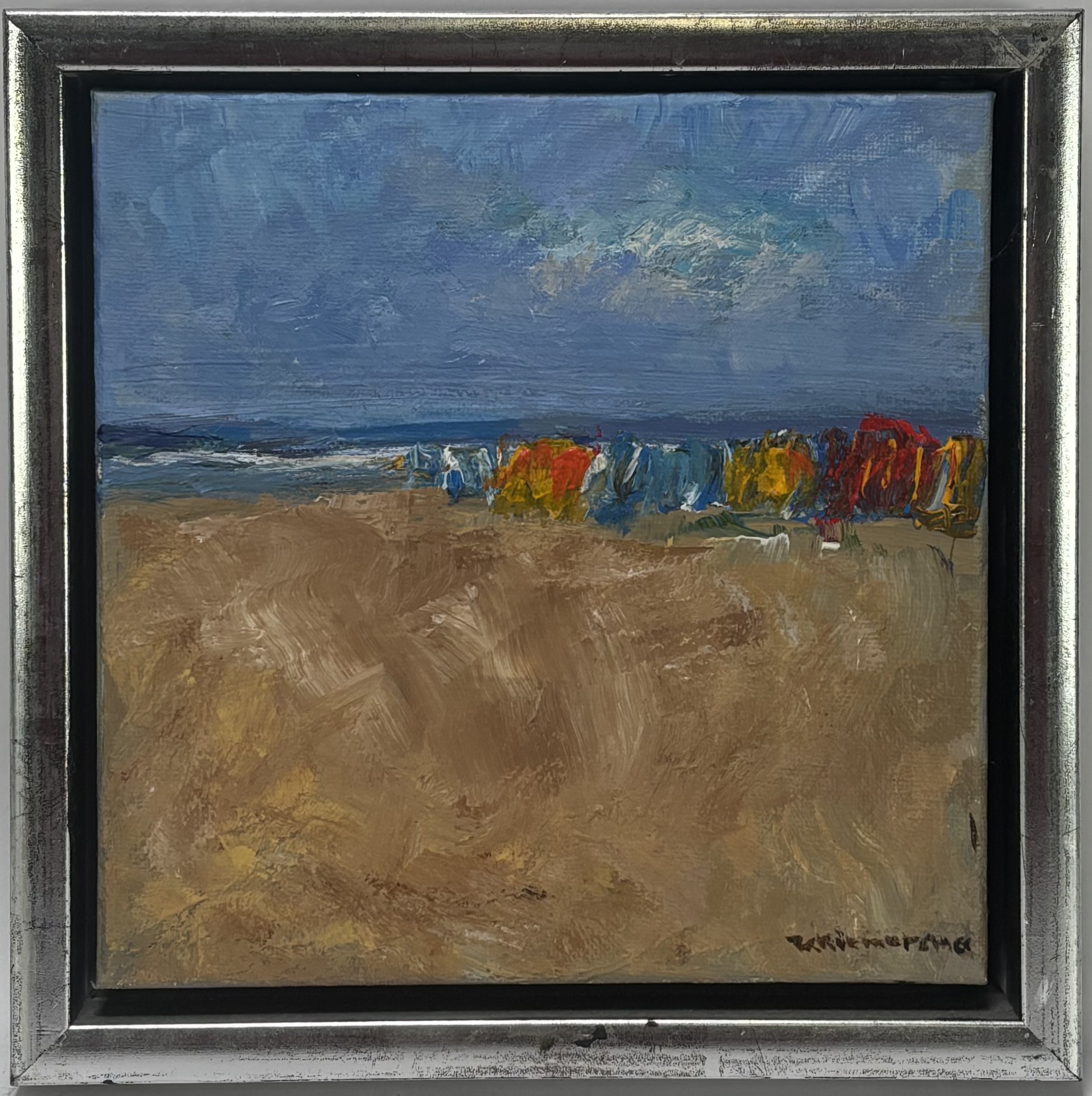 Schilderij, olieverf op doek, onduidelijk gesigneerd rechtsonder, tweede helft van de 20e eeuw. Het expressionistische strand tafereel toont een strand met op de achtergrond een rij felgekleurde windschermen in rood, geel en blauw langs de kust. Het werk bevindt zich in een zilverkleurige lijst. Jouw kans op dit olieverfschilderij begint met registreren – bied live of online mee! |
