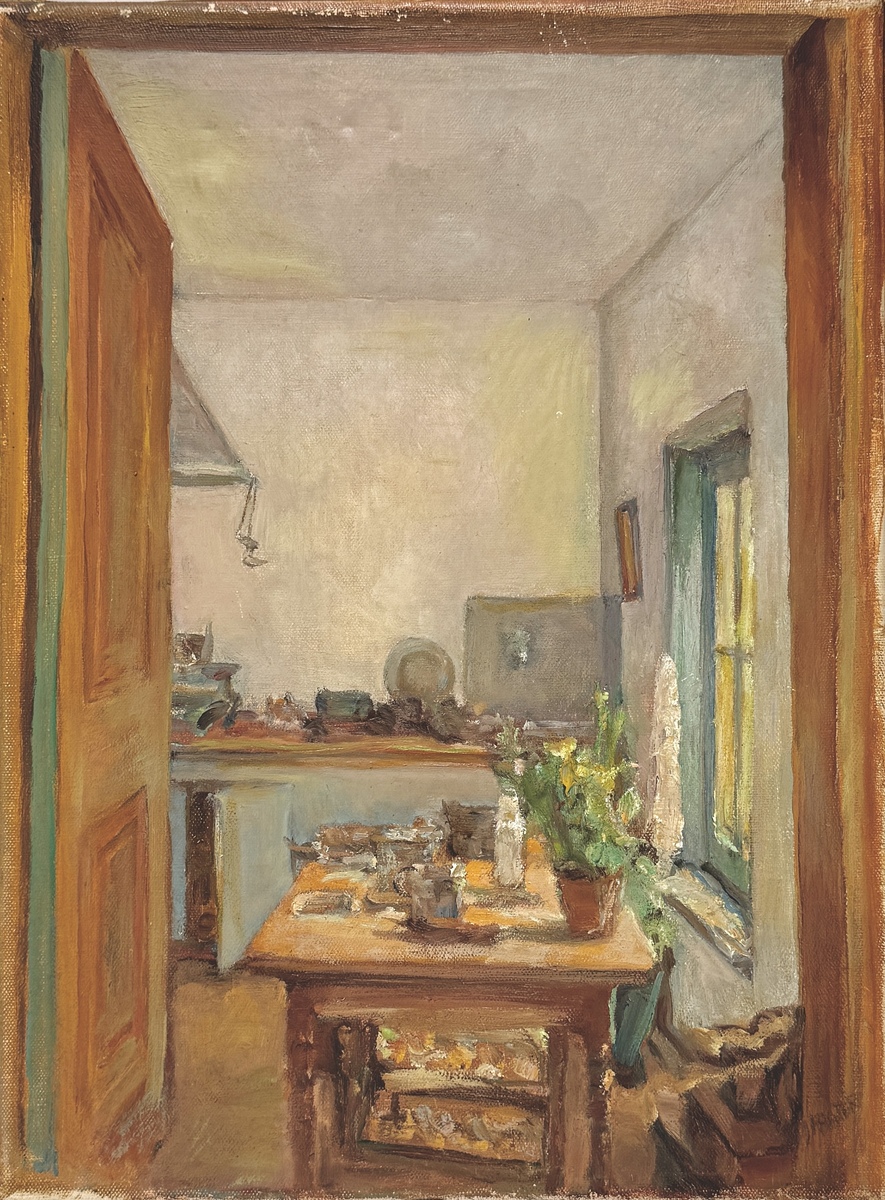 Dubbelzijdig schilderij, olieverf op doek door James William Frater (1887–1969), uitgevoerd in impressionistische stijl en gedateerd ca. 1920–1940. De voorzijde toont een keukeninterieur met tafel en raam, de keerzijde een gang met trapopgang, spiegel en planten. Het werk is kenmerkend door losse penseelvoering, warme aardetinten en sfeervolle lichtinval. Kom langs tijdens de kijkdagen (28 t/m 30 november) en ontdek dit schilderij zelf! |
