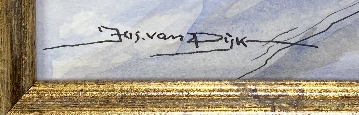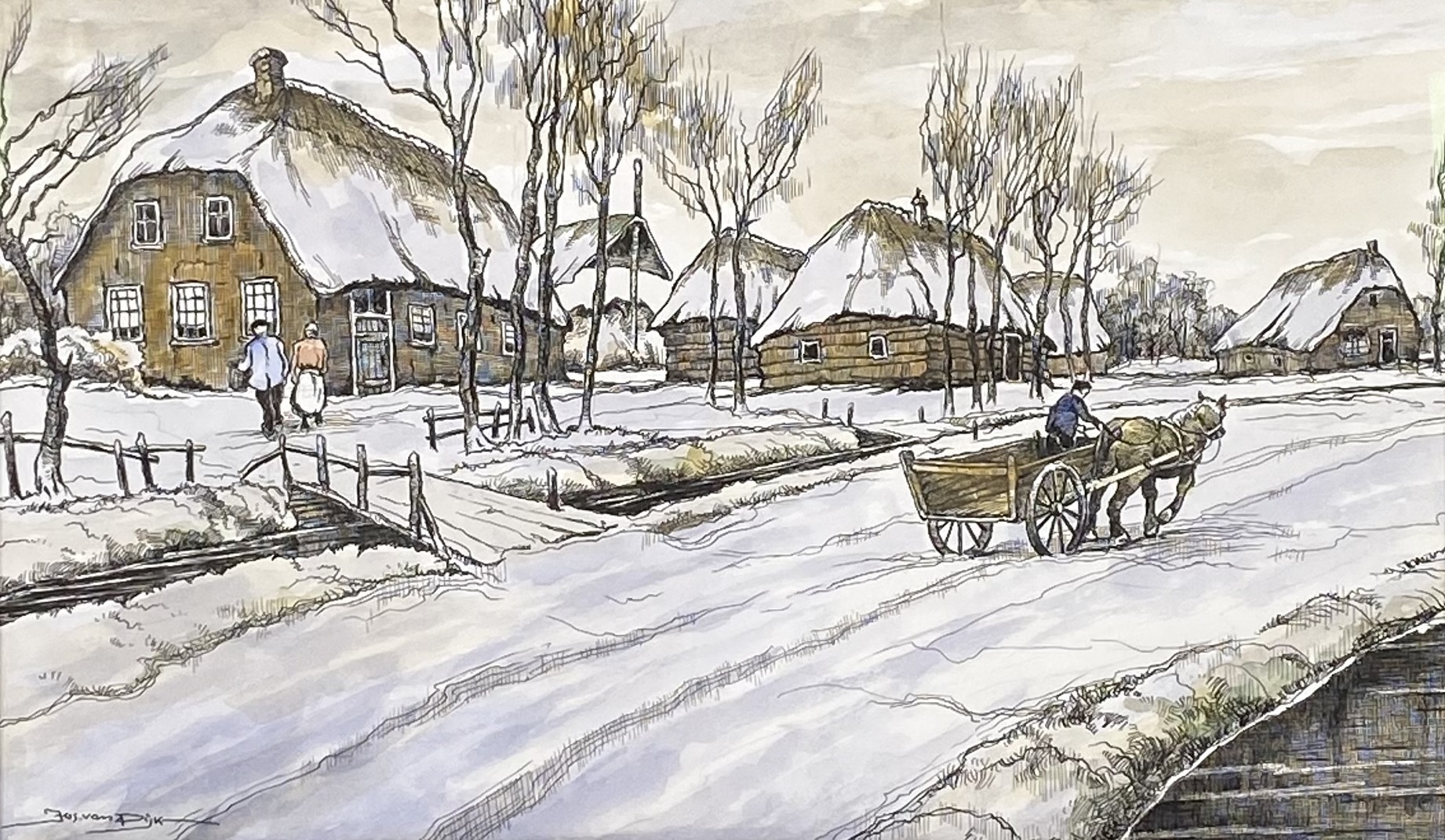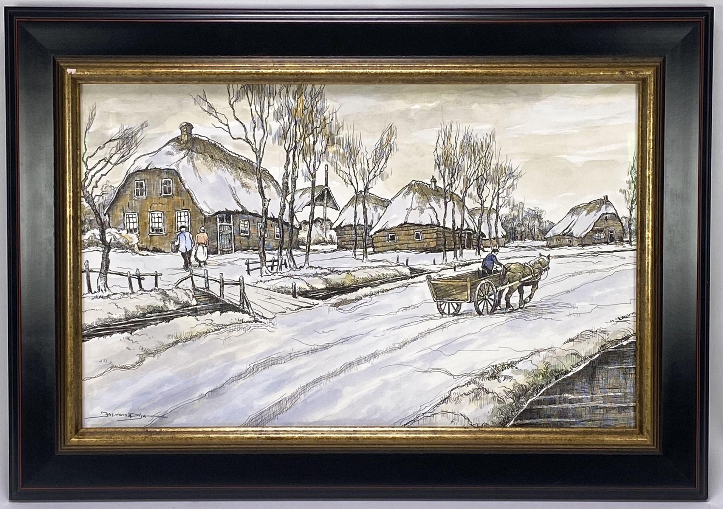 Aquarel door Johannes (Jos) van Dijk (1913–1998) op papier, gesigneerd linksonder "Jos. van Dijk", daterend circa 1950–1970. De voorstelling toont een realistisch Nederlands winterlandschap met rietgedekte boerderijen, figuren en een paard en wagen, uitgevoerd in inkt en aquarelverf met losse penvoering. Ontdek deze aquarel en voeg het toe aan jouw collectie! Registreer nu voor de veiling. |