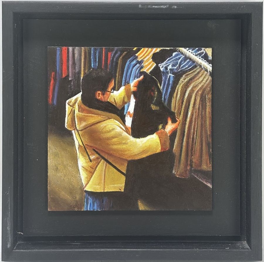 Acrylverfschilderij op paneel, getiteld “Inspectie” door Gerard Boersma (1976), gedateerd 2009. In hyperrealistische stijl toont dit schilderij een man die een kledingstuk inspecteert tussen een rij jassen. Het werk is zorgvuldig uitgevoerd met subtiele licht- en kleurnuances en is voorzien van een label van CBK Groningen. Geïnteresseerd? Bezoek onze kijkdagen op 28, 29 of 30 november van 11:00 tot 17:00 uur! |