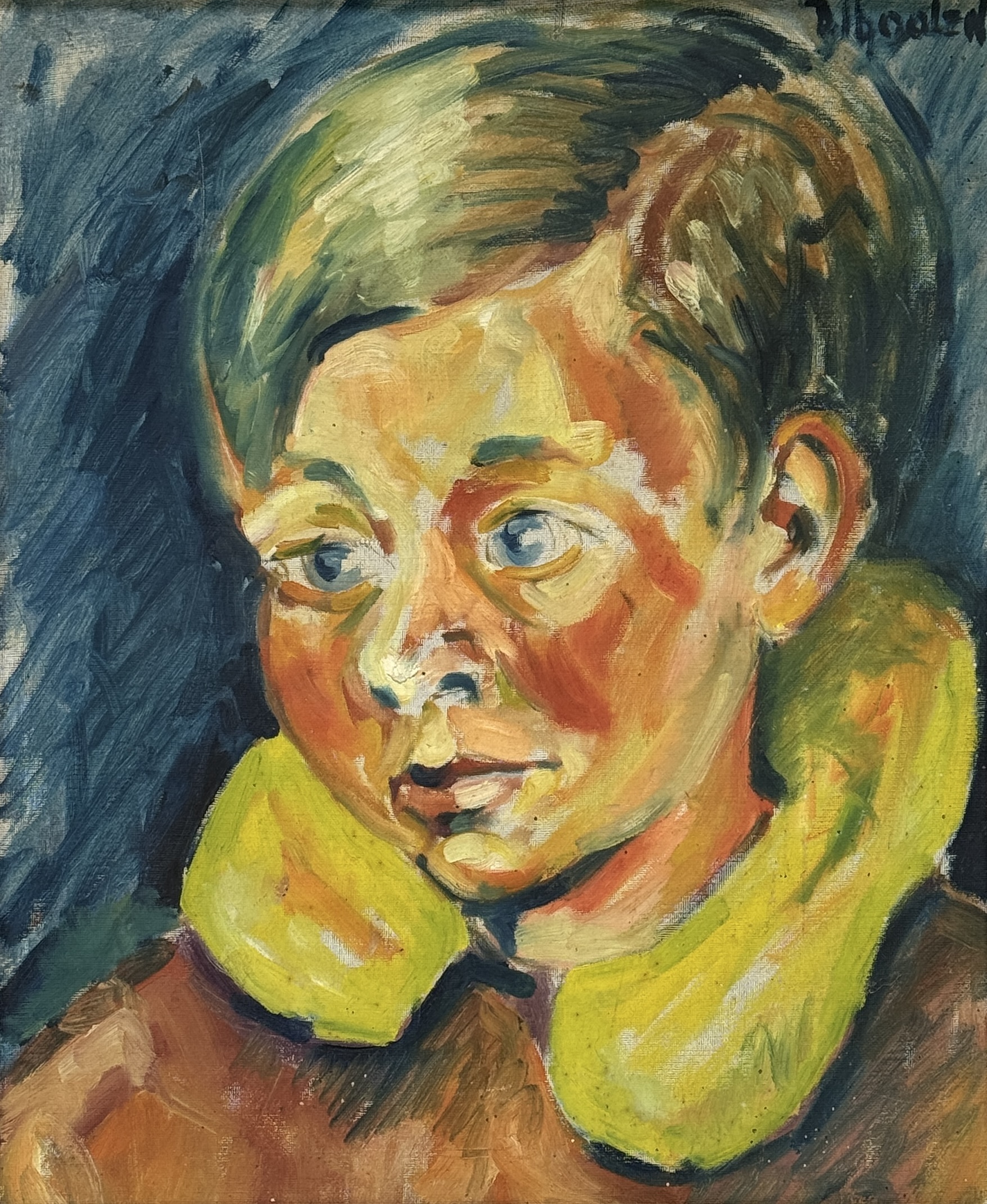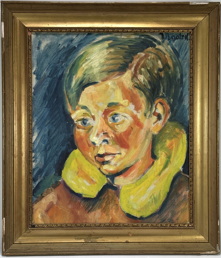 Olieverfschilderij op doek, portret door van Bernard Joseph Cornelis Franssens (1936–2023), Het schilderij toont een jeugdige figuur in expressieve stijl, met los penseelwerk en sterke kleurcontrasten. Het werk draagt een signatuur rechtsboven en is omlijst in een goudkleurige lijst. De achterzijde bevat inscriptie Schipborg. Dit olieverf op doek zelf beoordelen? Je bent welkom op onze kijkdagen op 28, 29 en 30 november! |