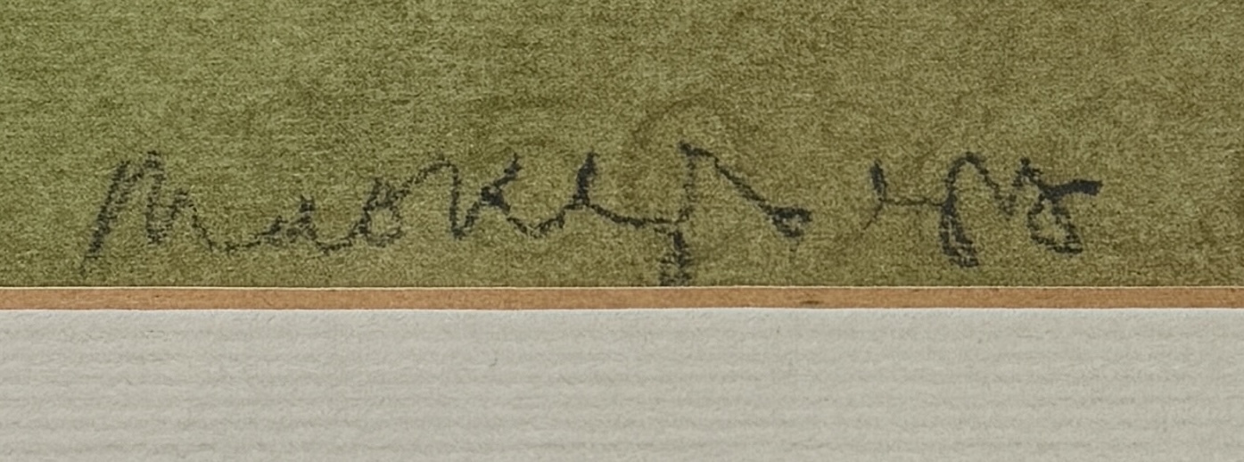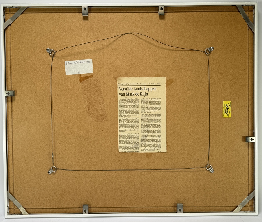 Aquarel op papier door Mark de Klijn (1939), gesigneerd Mark de Klijn en gedateerd ’90”. In een gestileerde abstract-landschappelijke stijl zijn horizon en diagonaal geplaatste vormen met kleuren zoals groen, oranje en blauwgrijs. Het werk is tentoongesteld en voorzien van een krantenbijlage op de achterzijde. Eerst deze aquarel zien voordat je biedt? Bezoek onze kijkdagen op 28, 29 en 30 november van 11:00 tot 17:00 uur! |