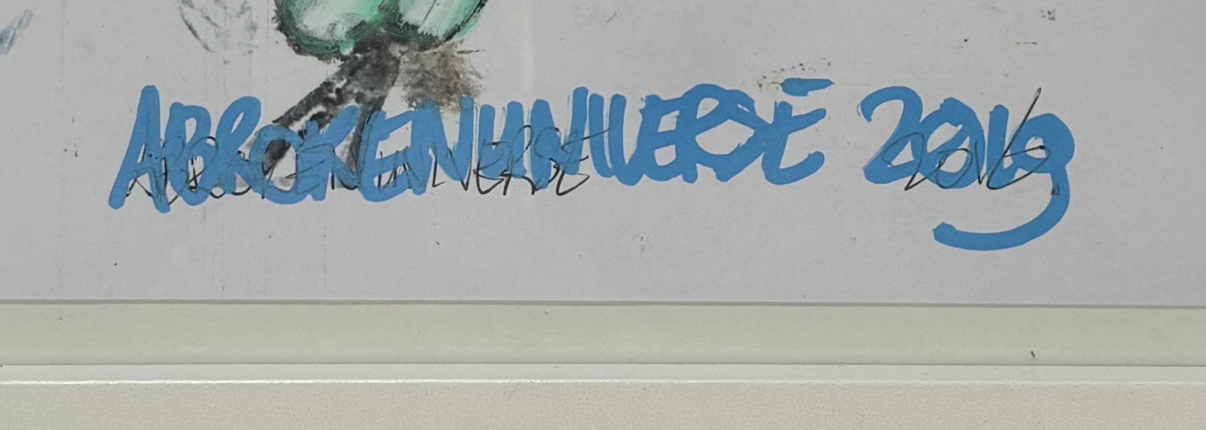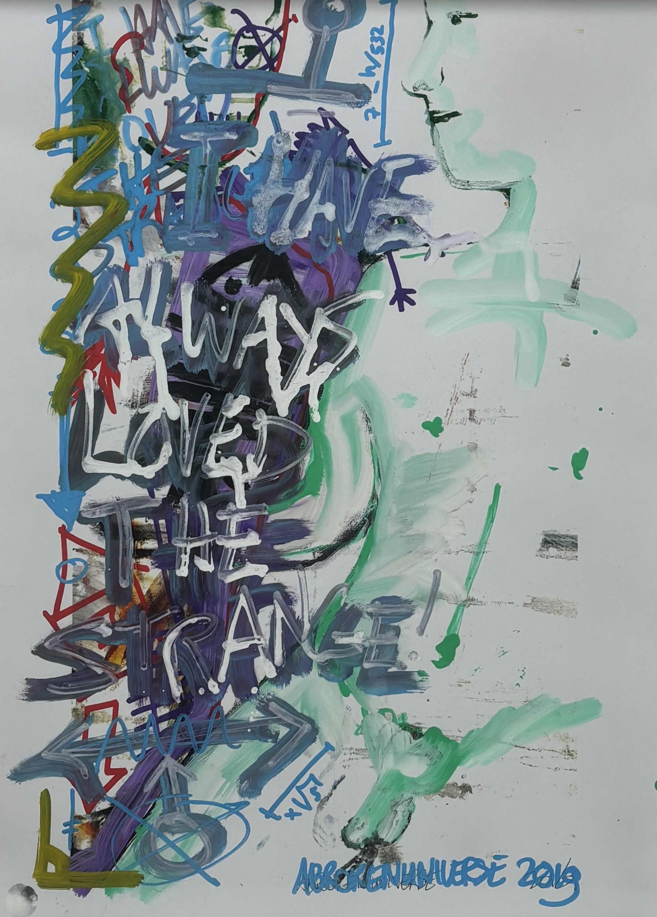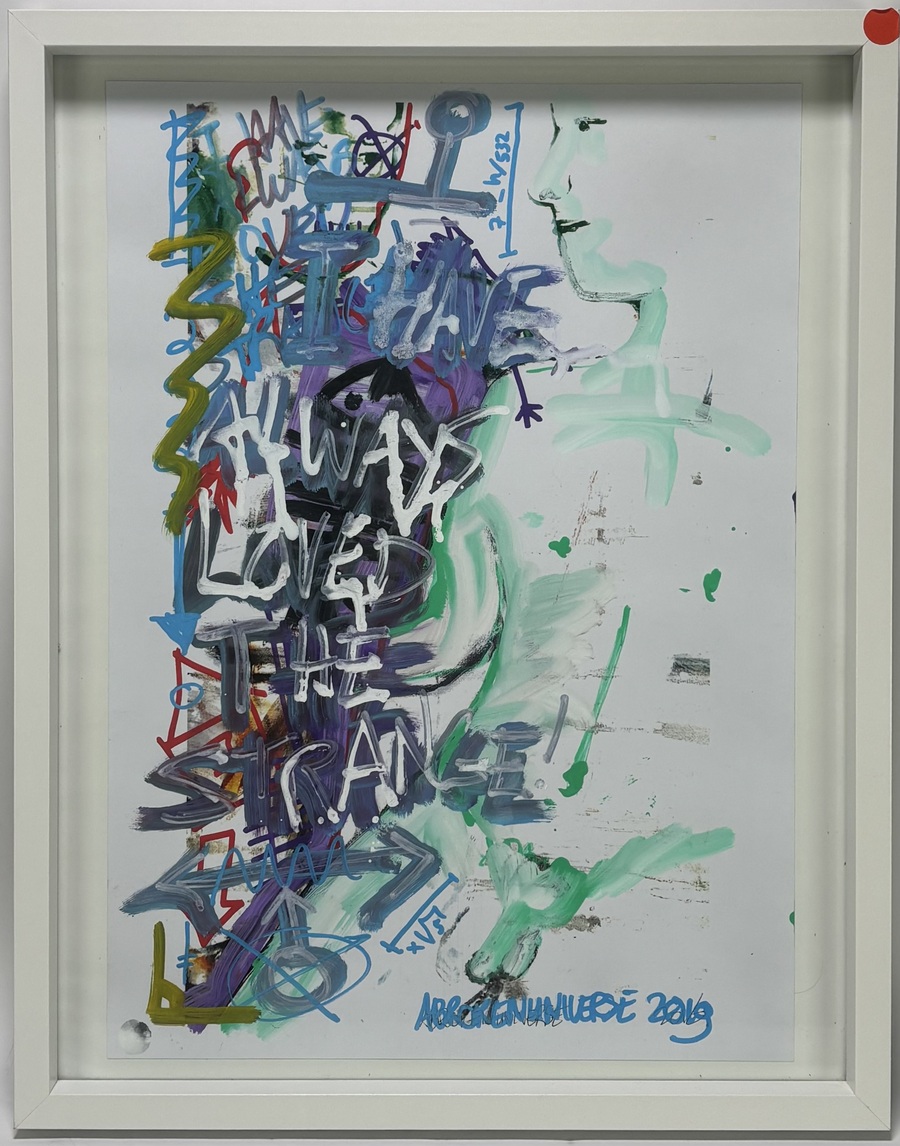Gemengde techniek op papier, uit 2019, door A BROKEN UNIVERSE (Ecuadoraanse kunstenaar, gevestigd in Nederland). Het abstract-expressionistische schilderij toont een chaotische, gelaagde compositie in levendige kleuren met een centrale boodschap: "I HAVE ALWAYS LOVED THE STRANGE". Het werk, gesigneerd en gedateerd in blauwe verf, past binnen de moderne Urban Art en Expressionistische stijl van de in Nederland gevestigde kunstenaar. Jouw kans op dit schilderij begint met registreren – bied live of online mee! |