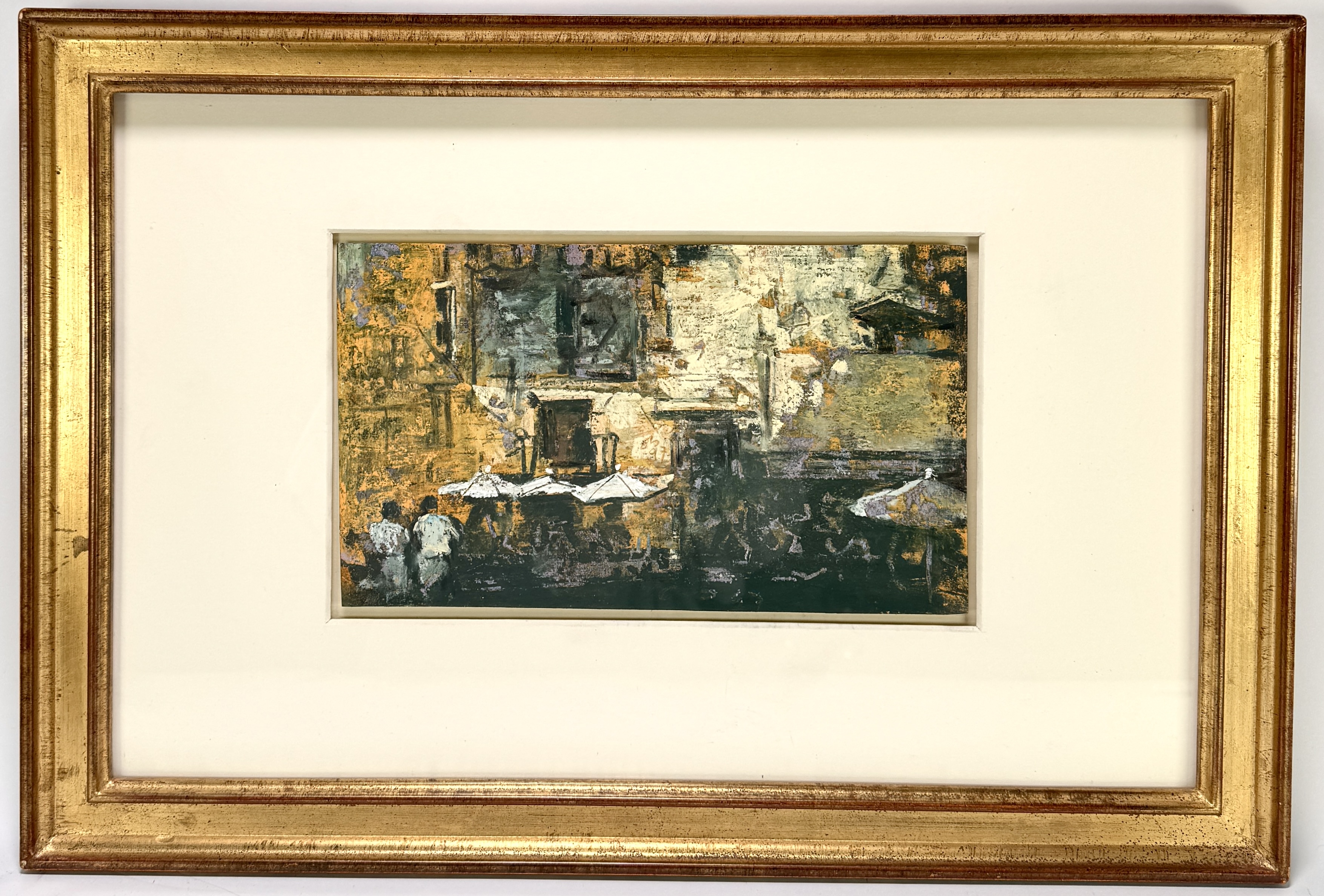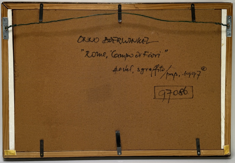 Gemengde techniek op papier door Onno Boerwinkel (1950), getiteld “Rome, Campo di’ Fiori”, 1997. Expressionistisch stadsgezicht in acryl en sgraffito met warme aardtinten en figuratieve details van terrasfiguren en gevels. Handgeschreven titel, signatuur en jaartal verso, genummerd 97086. Het werk bevindt zich in een goudkleurige lijst met passe-partout. Dit schilderij zelf beoordelen? Je bent welkom op onze kijkdagen op 28, 29 en 30 november! |