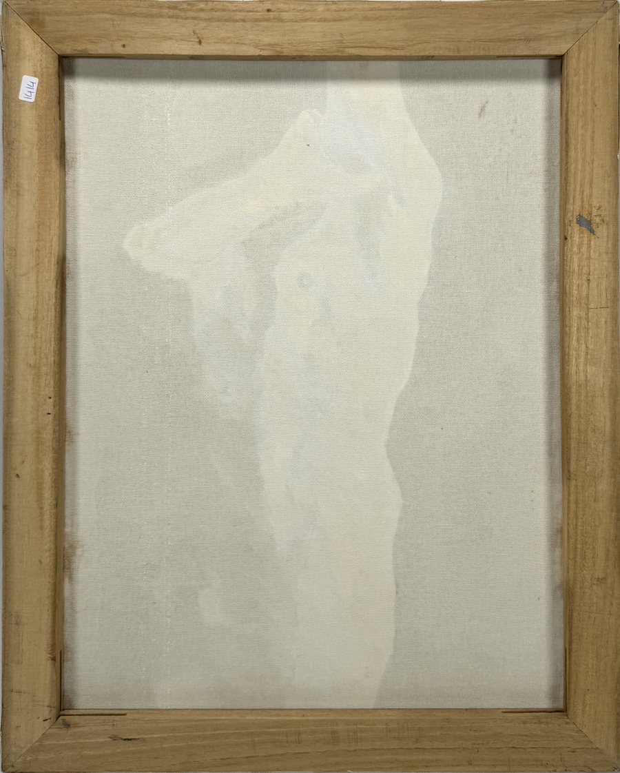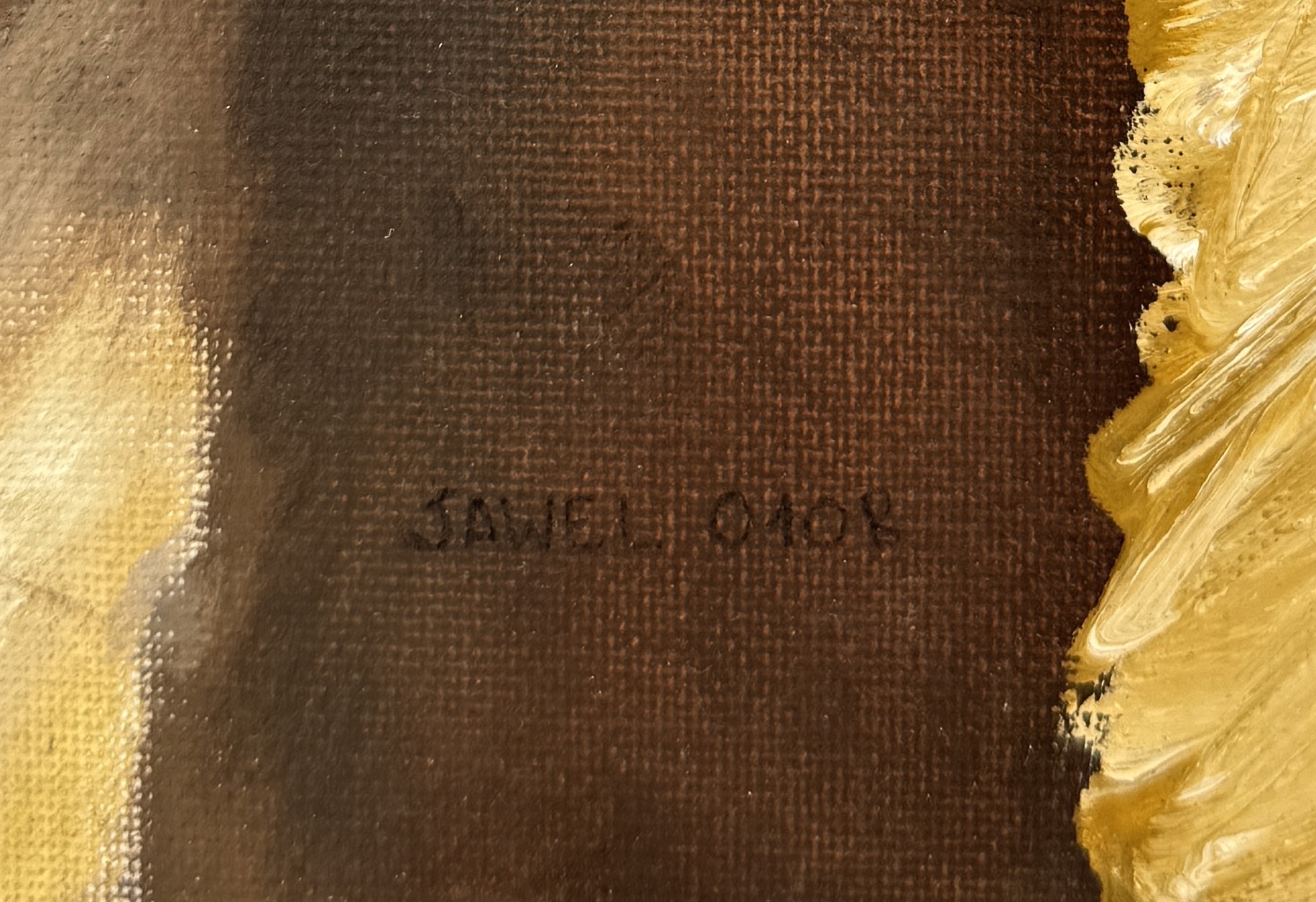 Olieverfschilderij op doek, gesigneerd met "JAWEL 0408" en gedateerd omstreeks begin 21e eeuw. Het figuratieve werk uit toont een staande naakte tors, uitgevoerd in een clair-obscur contrast. Het doek wordt aan de zijkanten ingekaderd door impasto verfbanen in goudkleurige tinten. Wil je dit schilderij in het echt bekijken? Kom naar de kijkdagen op 28, 29 en 30 november! |