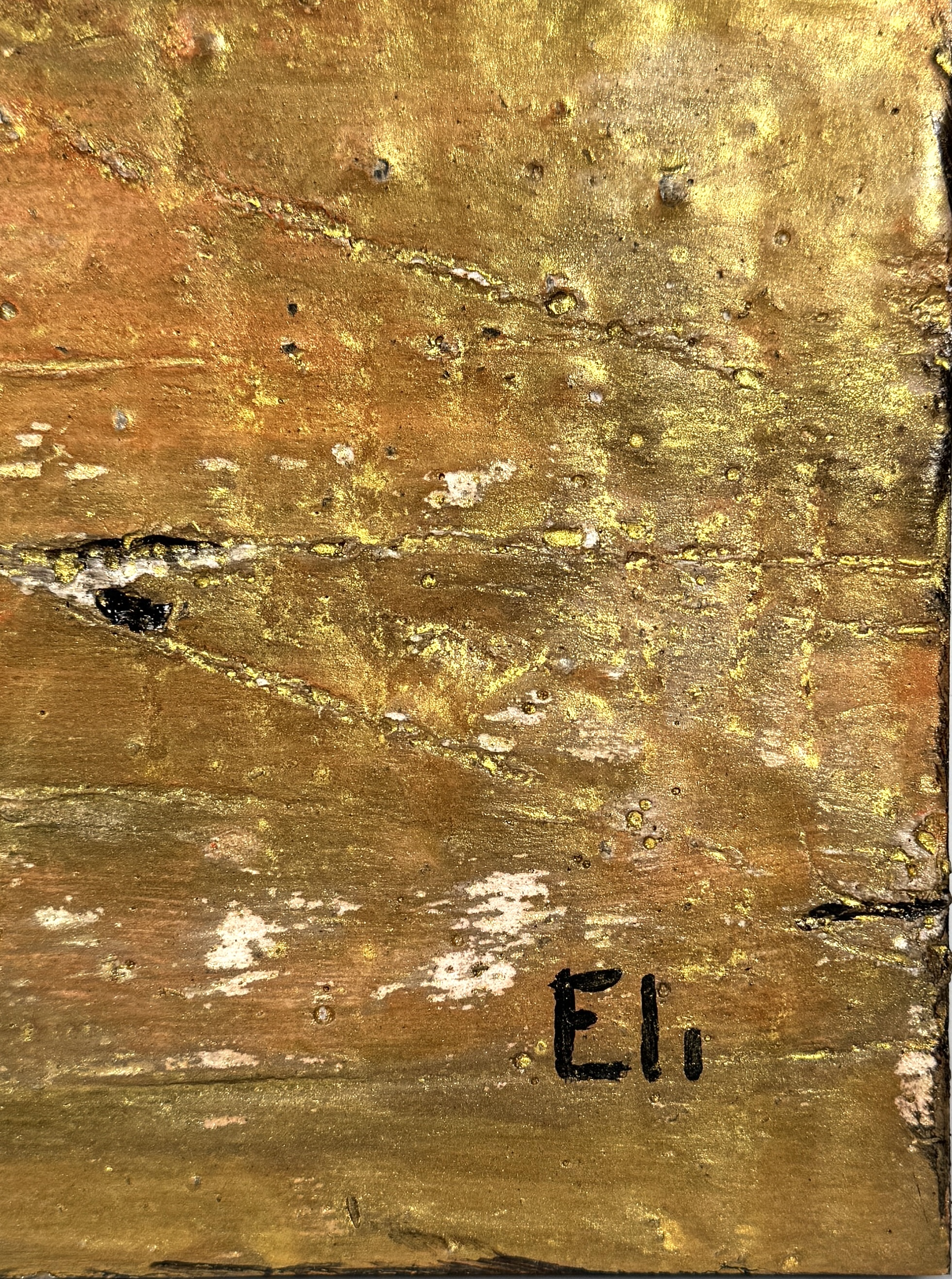 Abstract schilderij uitgevoerd in gemengde techniek met acrylverf en metaalpigmenten op paneel door de Italiaanse kunstenaar Elisa Sanacore. Het werk uit 2016 heeft de titel "The wounded Earth", en kenmerkt zich door een lyrisch abstracte stijl. Rechtsonder gesigneerd: Eli, en verso getiteld, gesigneerd en gedateerd. Voeg dit schilderij toe aan je verzameling en doe een bod! |