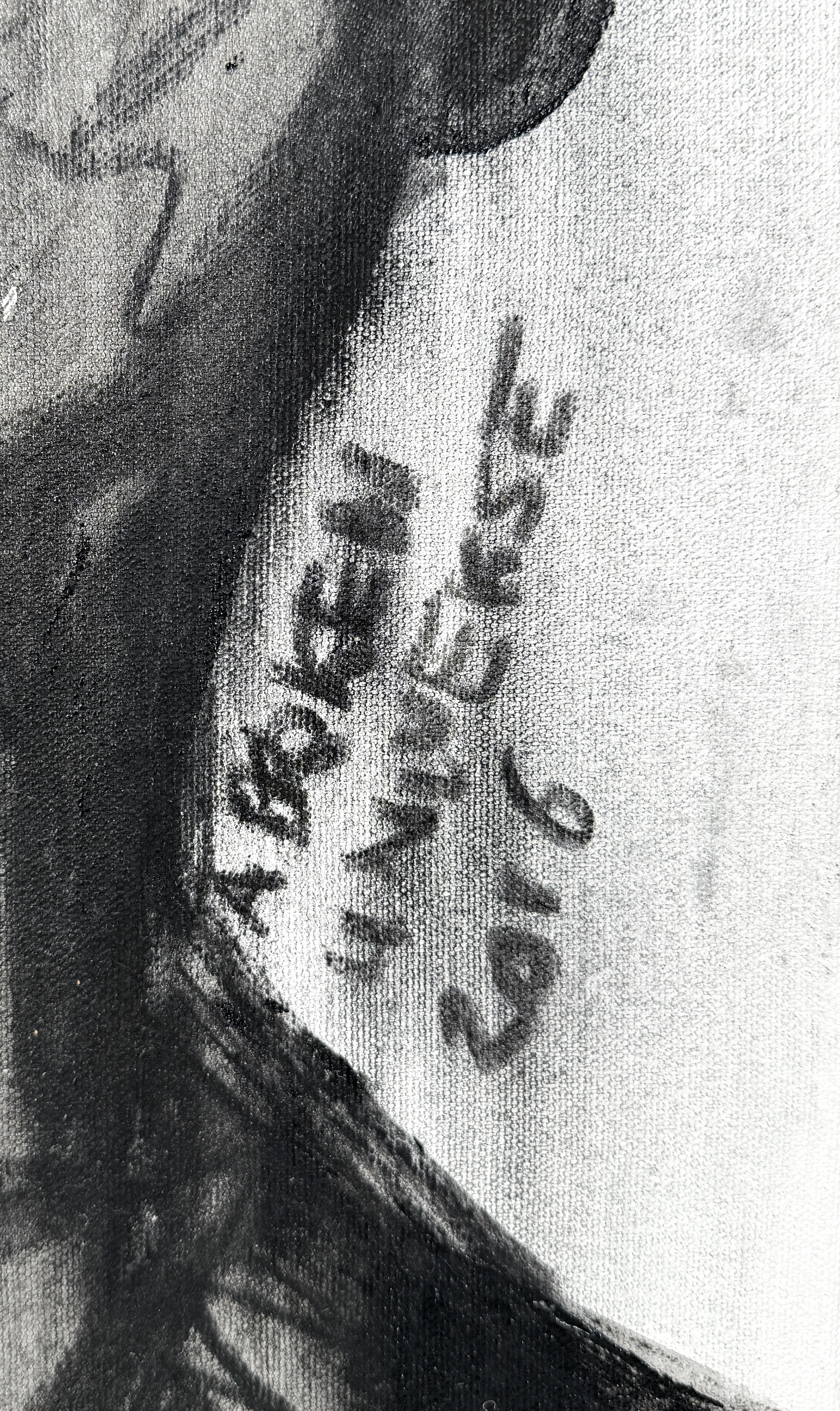 Acrylverfschilderij op doek door A BROKEN UNIVERSE (Ecuadoraanse kunstenaar, gevestigd in Nederland), gedateerd 2016. Het expressieve monochrome portret toont een jonge man met pet, opgebouwd uit losse penseelstreken en druiplijnen in grijs- en zwarttinten. Recht in het midden gesigneerd en gedateerd, verso gemerkt. Eerst dit schilderij zien voordat je biedt? Bezoek onze kijkdagen op 28, 29 en 30 november van 11:00 tot 17:00 uur! |
