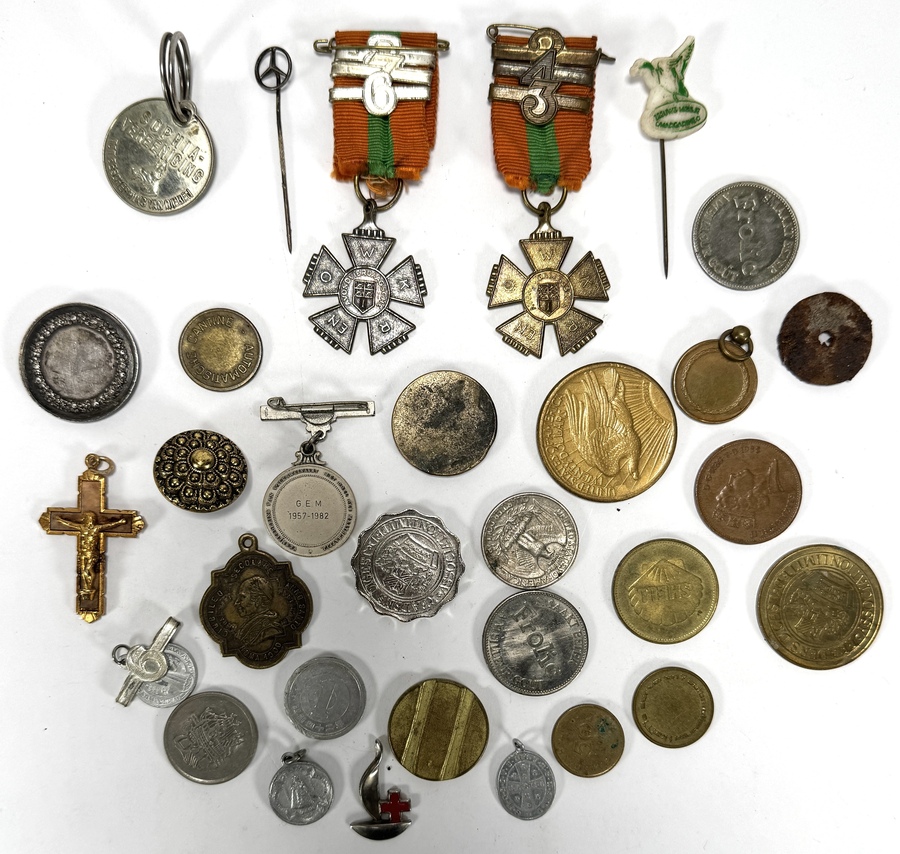 Lot curiosa met diverse metalen penningen en medailles, waaronder twee kruismedailles aan lint. Een rechthoekige tinnen shagdoos met Art Nouveau-lithografie, waarop een leeuw door een ring springt en een messing kruisbeeld, diverse herdenkingsmunten en symbolische broches. Wil je direct deelnemen? Plaats vanaf 21 november alvast een schriftelijk bod via onze website! |