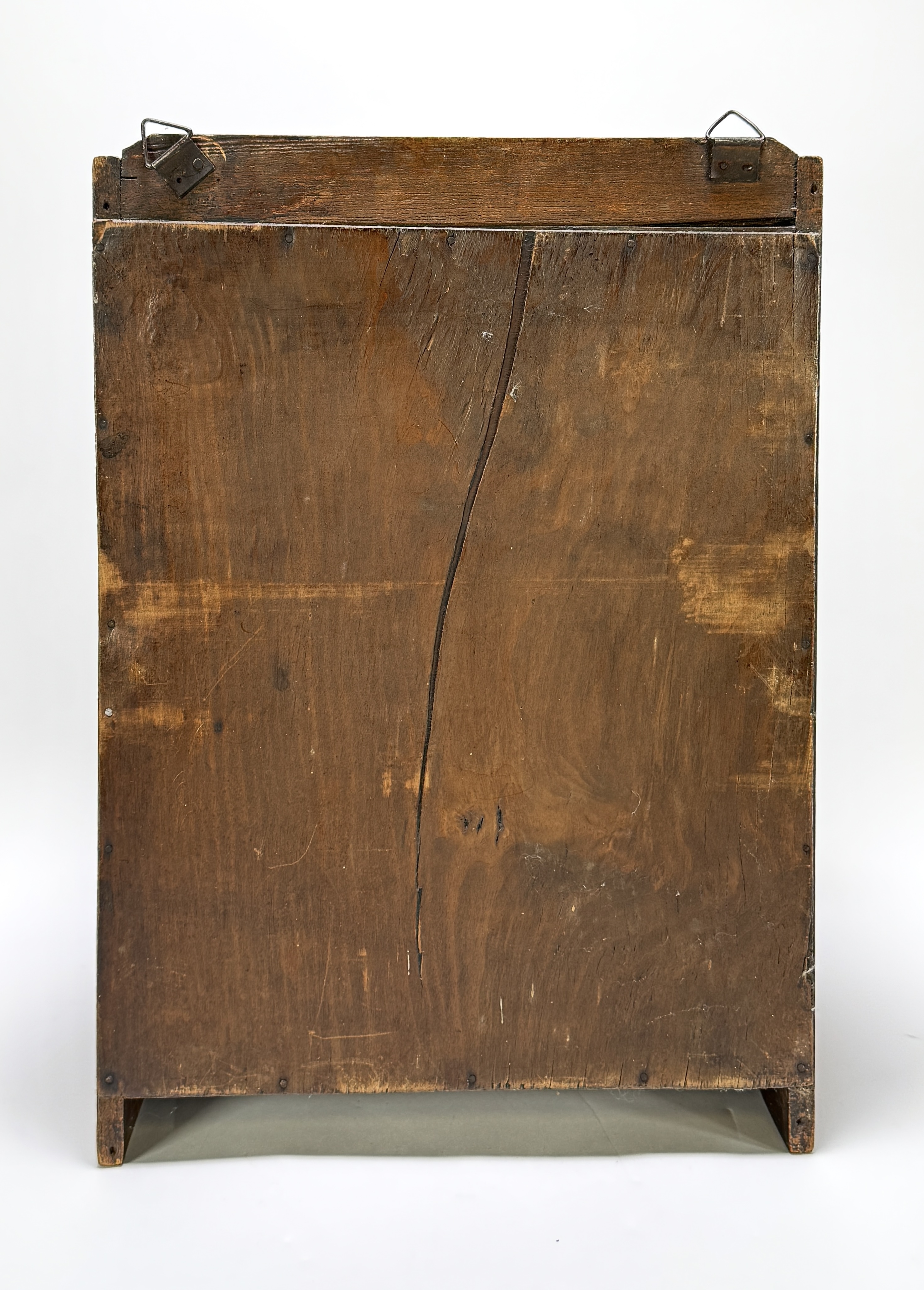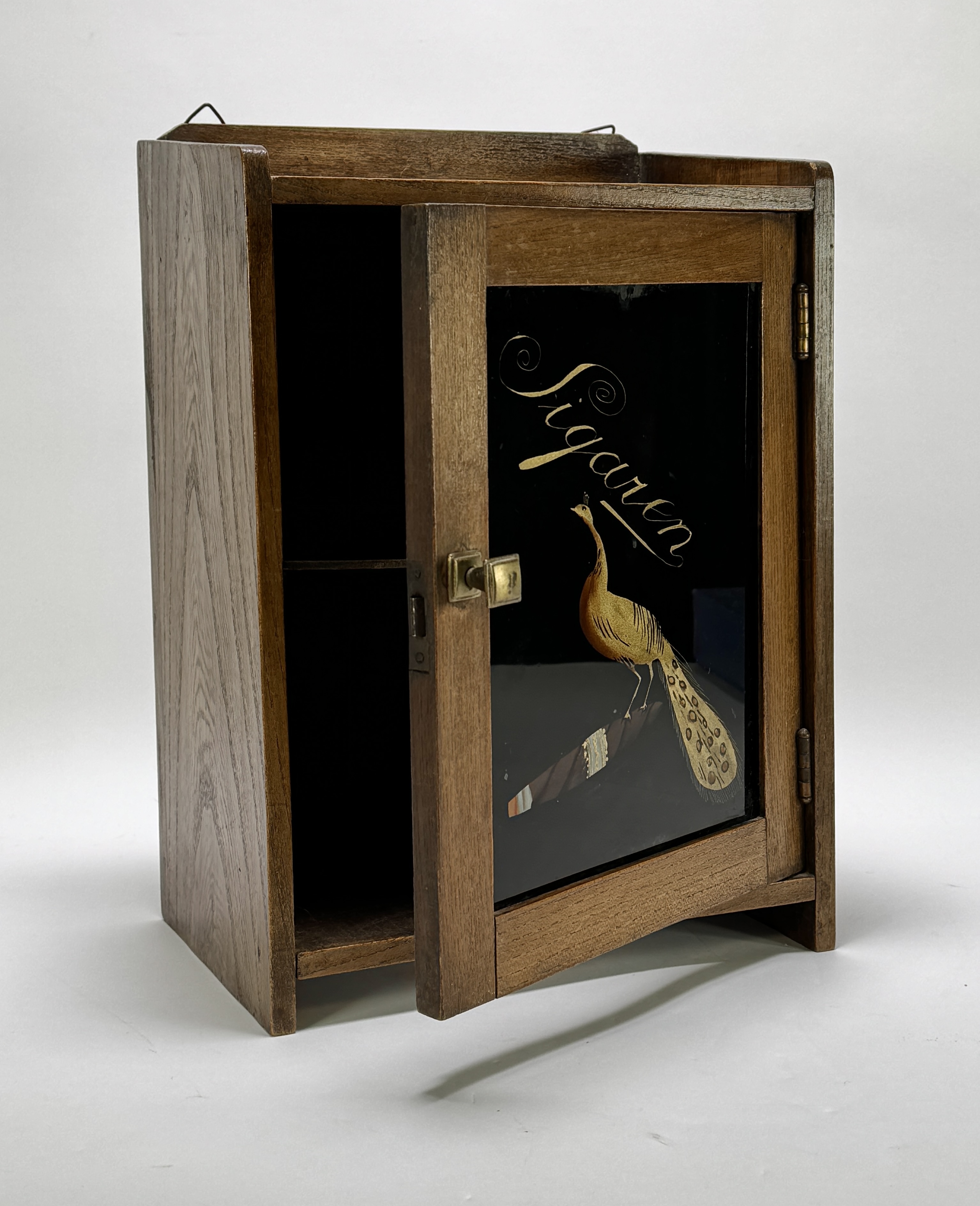 Houten sigarenkastje uit Nederland, eerste helft 20e eeuw, uitgevoerd in notenhout met glazen deurtje. Achter het glas bevindt zich een polychrome voorstelling met de tekst Sigaren en een pauw op een sigaar. De techniek omvat houtbewerking, montage en achter glas geschilderde voorstelling. Jouw kans op dit sigarenkastje begint met registreren – bied live of online mee! |