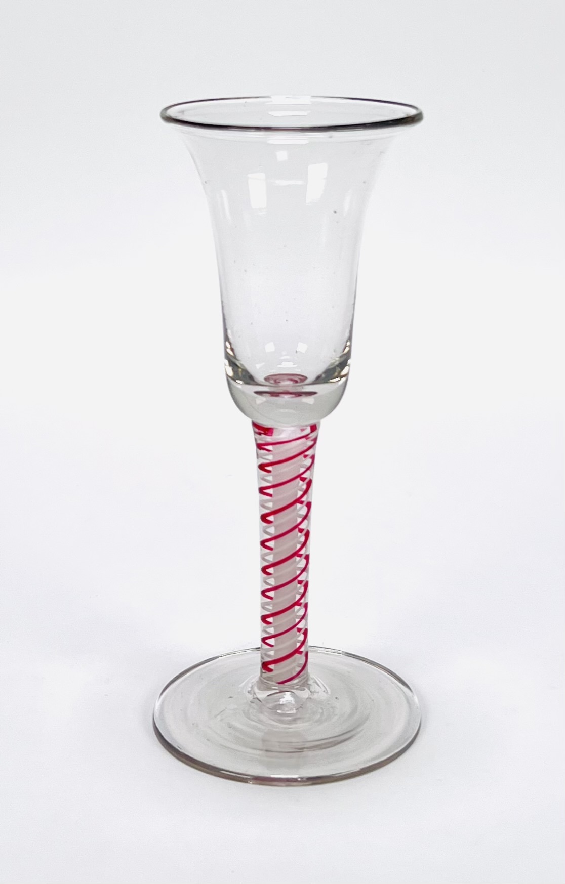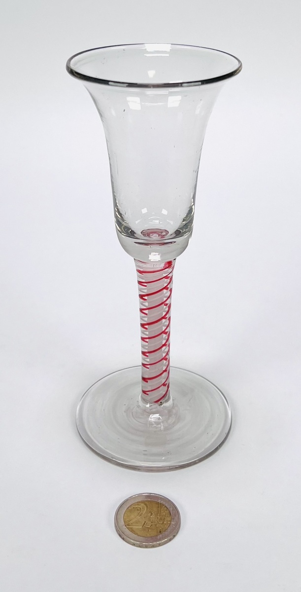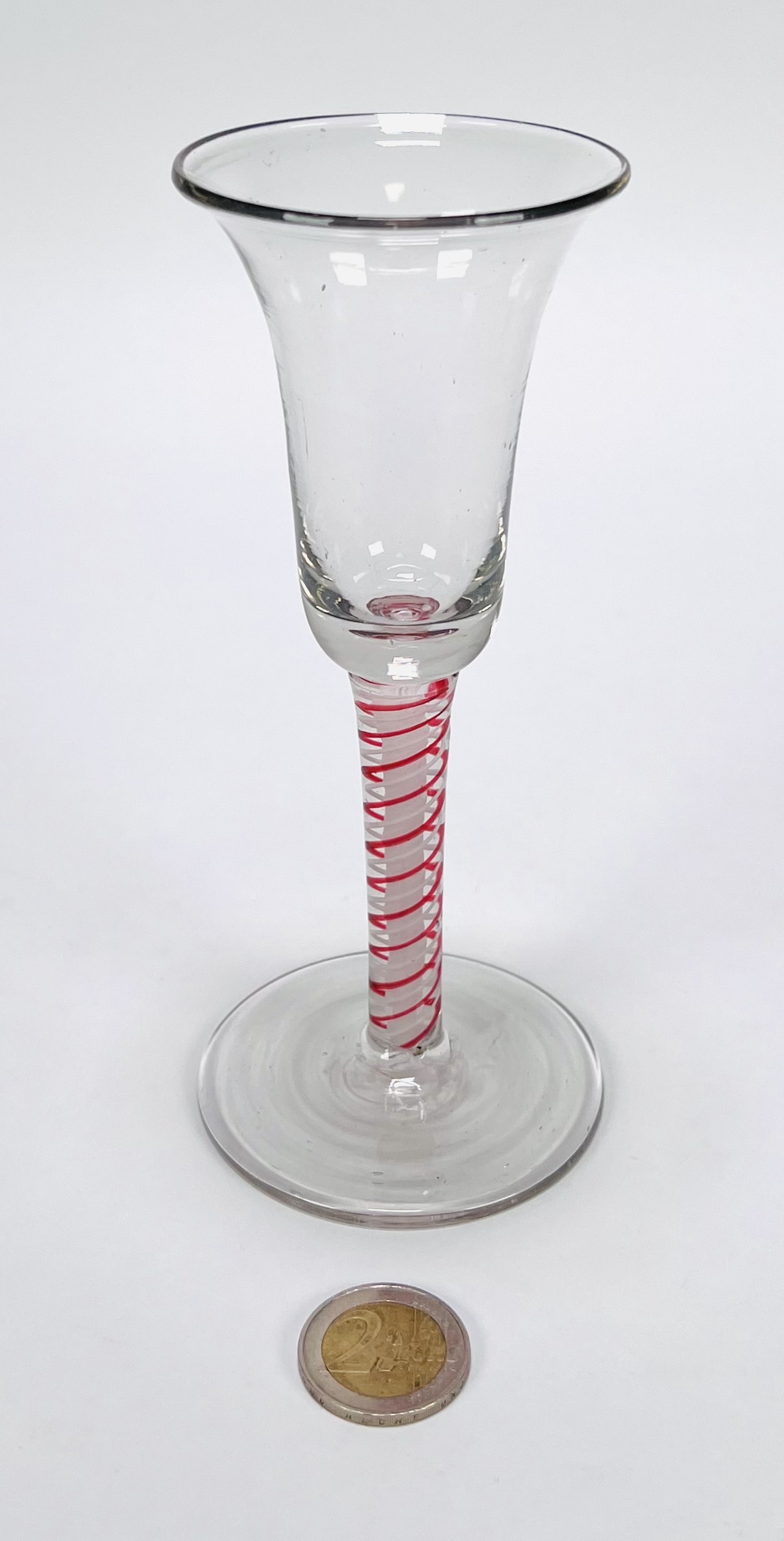 Slingerglas, 18e eeuw, met spiraalvormige luchtinsluiting en rode latticino-decoratie in de holle stam, vervaardigd uit helder mondgeblazen glas met tulpvormige kelk en ronde schijfvoet. Datering circa 1750–1780, Engeland. Het glas toont de kenmerkende air-twist-techniek van rococo-glasblazerijen en werd ambachtelijk gevormd met zichtbaar pontil aan de onderzijde, typerend voor vroeg handgemaakt tafelglas uit deze periode. Wil je direct deelnemen? Plaats vanaf 21 november alvast een schriftelijk bod via onze website! |