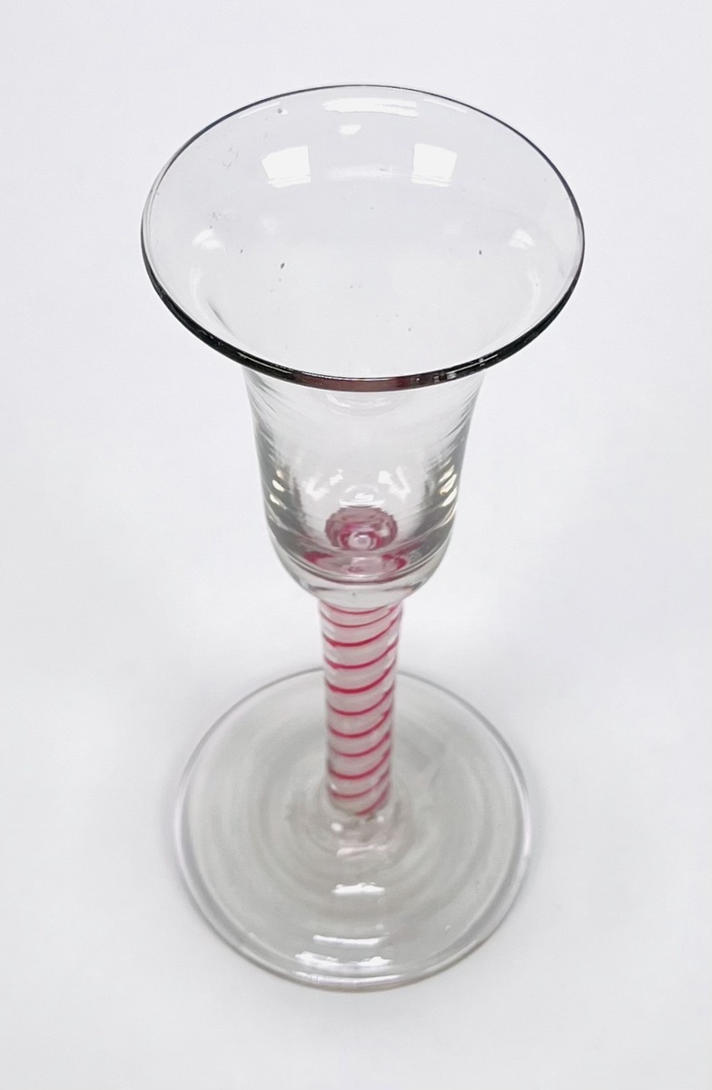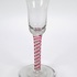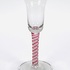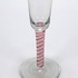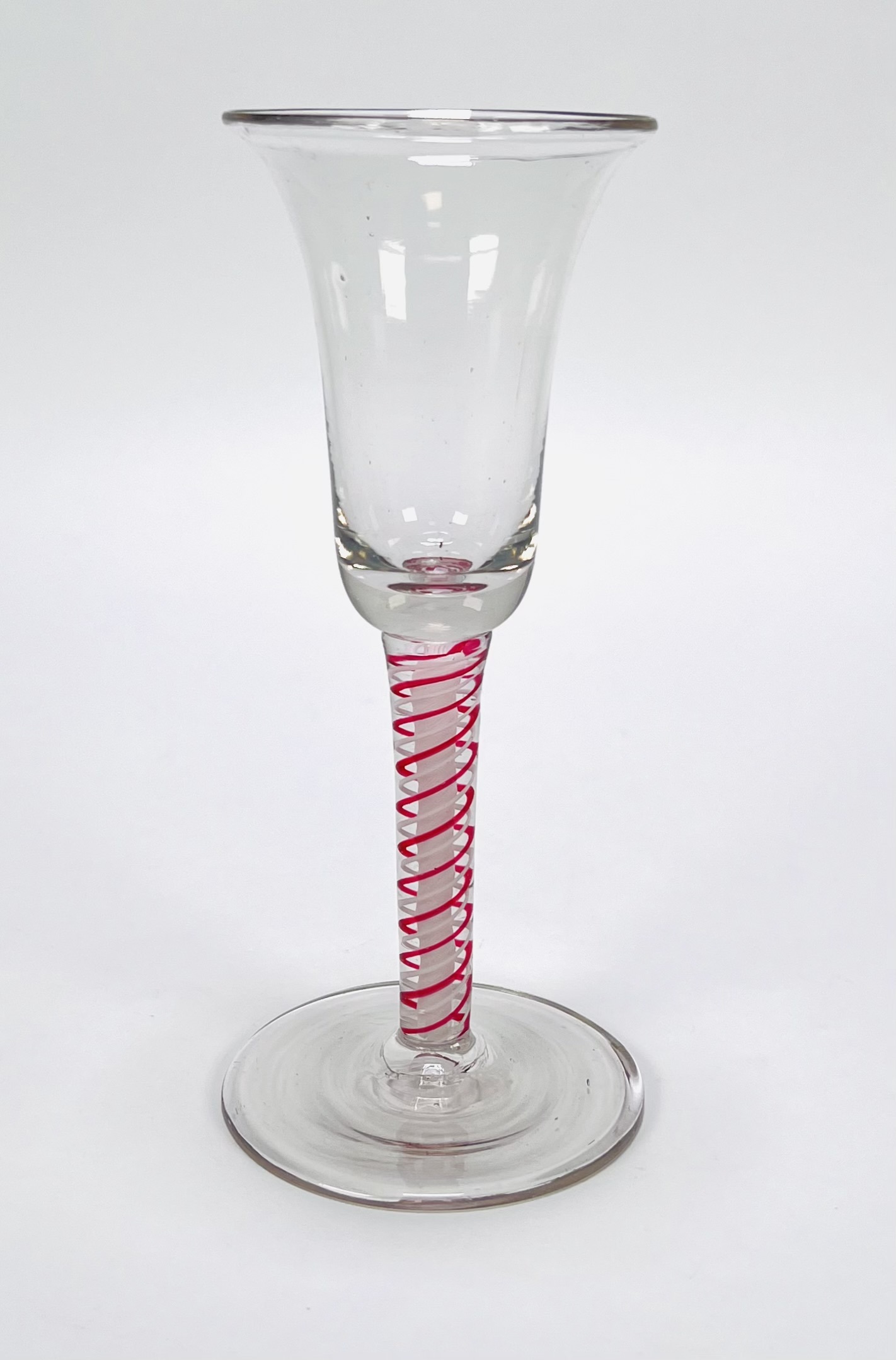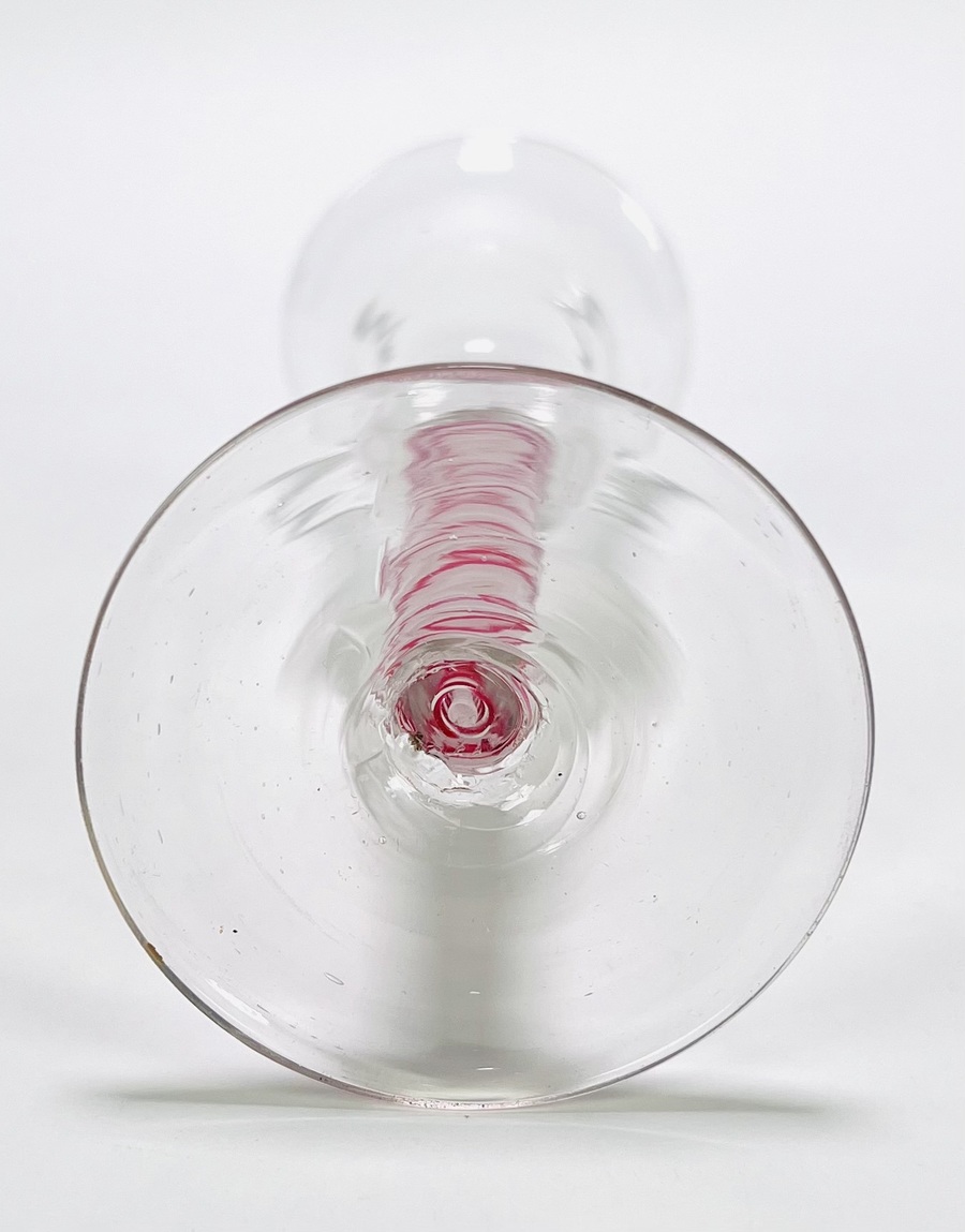 Slingerglas, 18e eeuw, met spiraalvormige luchtinsluiting en rode latticino-decoratie in de holle stam, vervaardigd uit helder mondgeblazen glas met tulpvormige kelk en ronde schijfvoet. Datering circa 1750–1780, Engeland. Het glas toont de kenmerkende air-twist-techniek van rococo-glasblazerijen en werd ambachtelijk gevormd met zichtbaar pontil aan de onderzijde, typerend voor vroeg handgemaakt tafelglas uit deze periode. Wil je direct deelnemen? Plaats vanaf 21 november alvast een schriftelijk bod via onze website! |