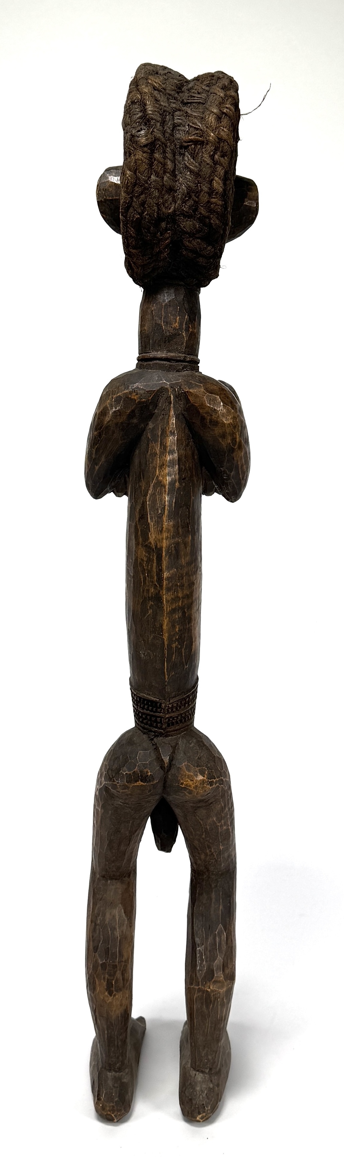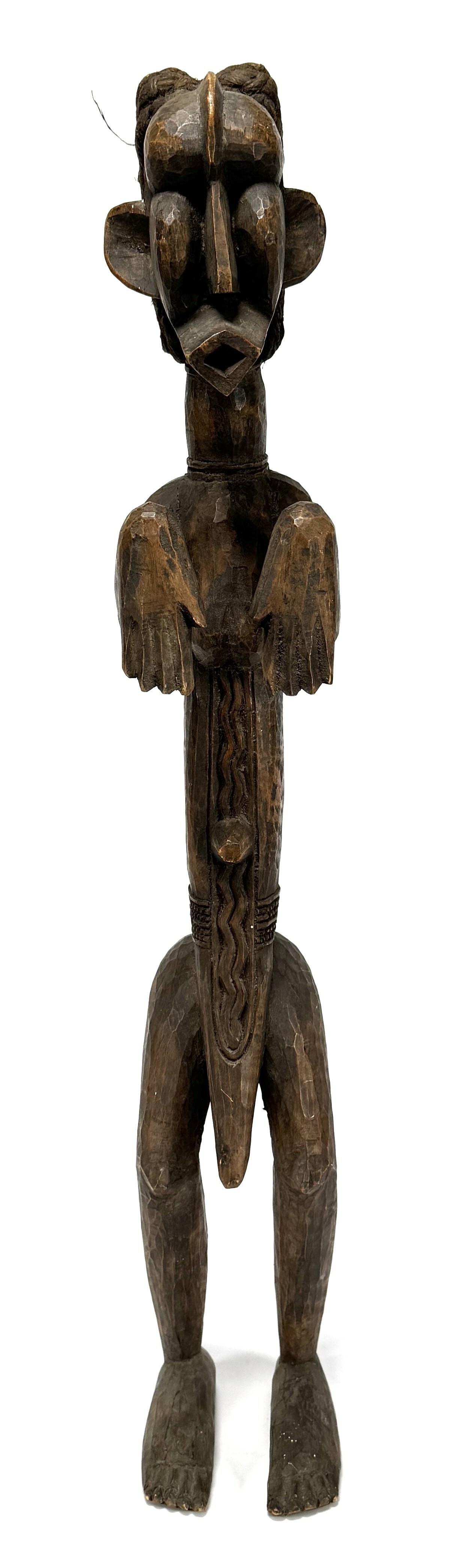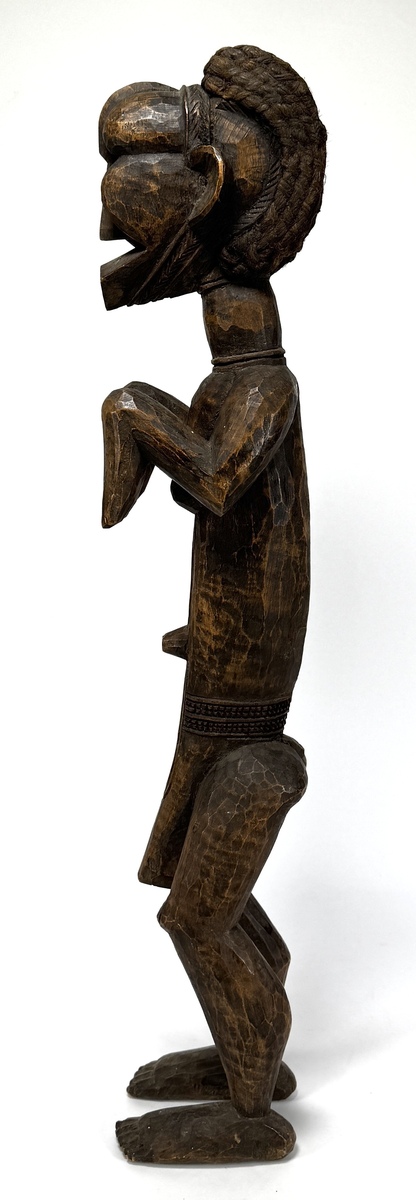 Songye Nkishi houten beeld van een gestileerde krachtfiguur uit de Democratische Republiek Congo. Het is vervaardigd door houtsnijwerk en kenmerkt zich door een cilindrische torso en een prominente hoge kuif. De houding met handen voor de torso is typisch voor dit rituele object voor bescherming. Het beeld vertoont een donkere gebruikspatina, daterend uit de eerste helft 20e eeuw. Dit beeld zelf beoordelen? Je bent welkom op onze kijkdagen op 28, 29 en 30 november! |