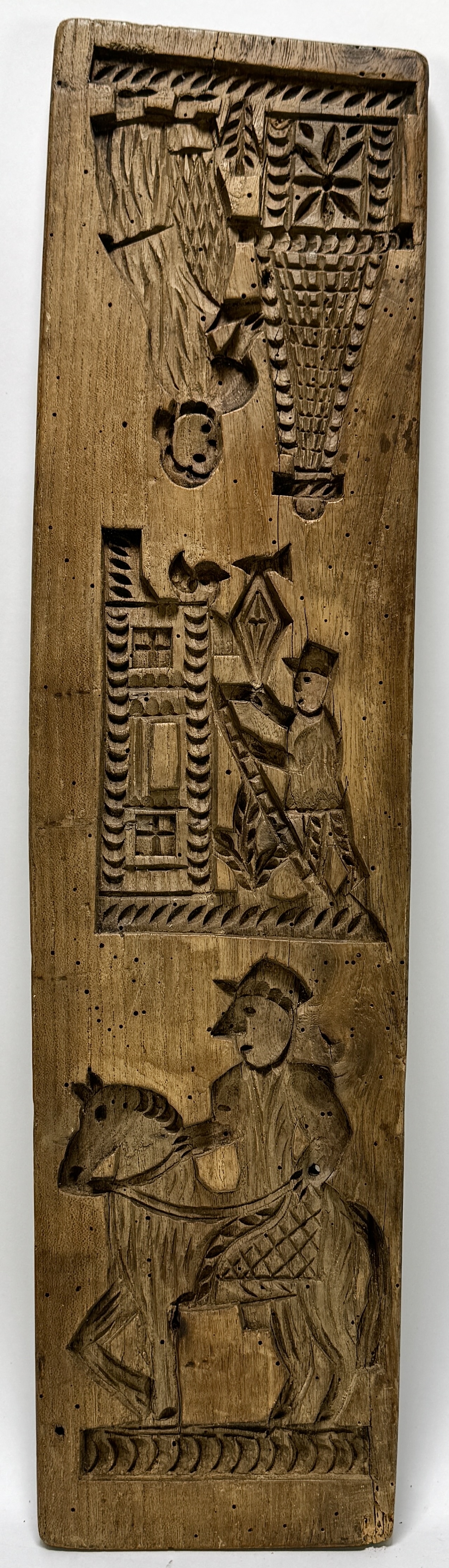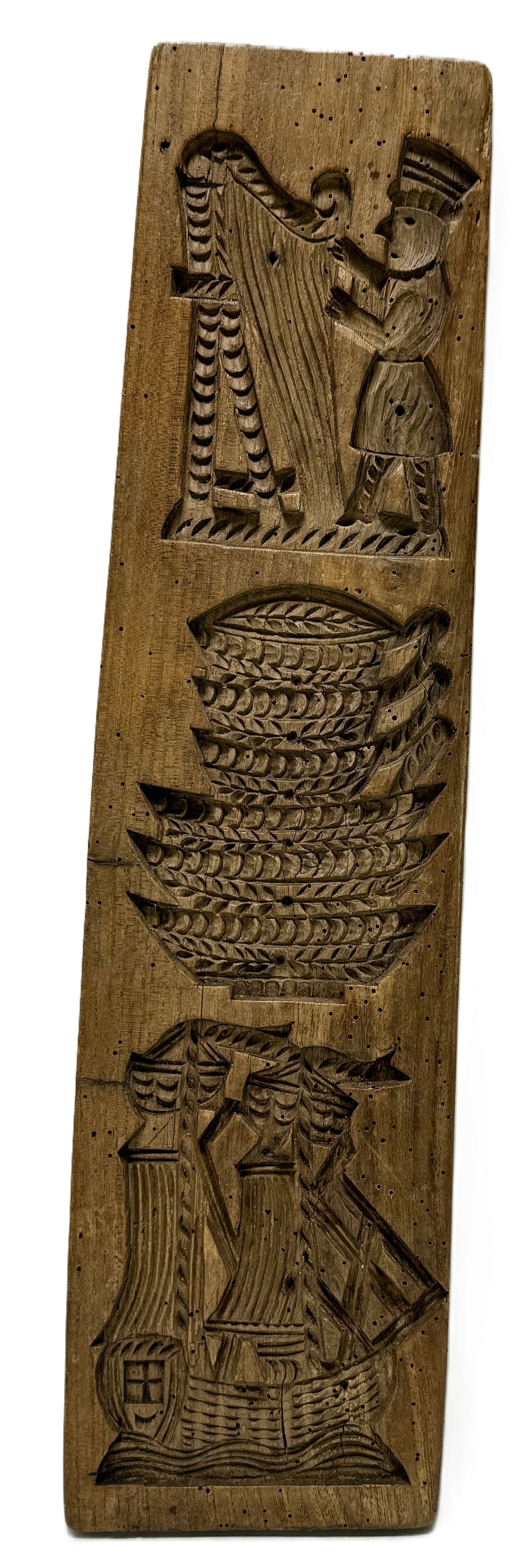 Tweezijdige houten speculaasplank, Nederland, eind 19e eeuw, uitgevoerd in beukenhout met handgesneden houtsnijwerk. Te zien zijn figuratieve voorstellingen van ruiter, huizen en fruitmanden aan de ene zijde en een harpist met zeilschepen aan de andere zijde. Deze speculaasplank zelf beoordelen? Je bent welkom op onze kijkdagen op 28, 29 en 30 november! |
