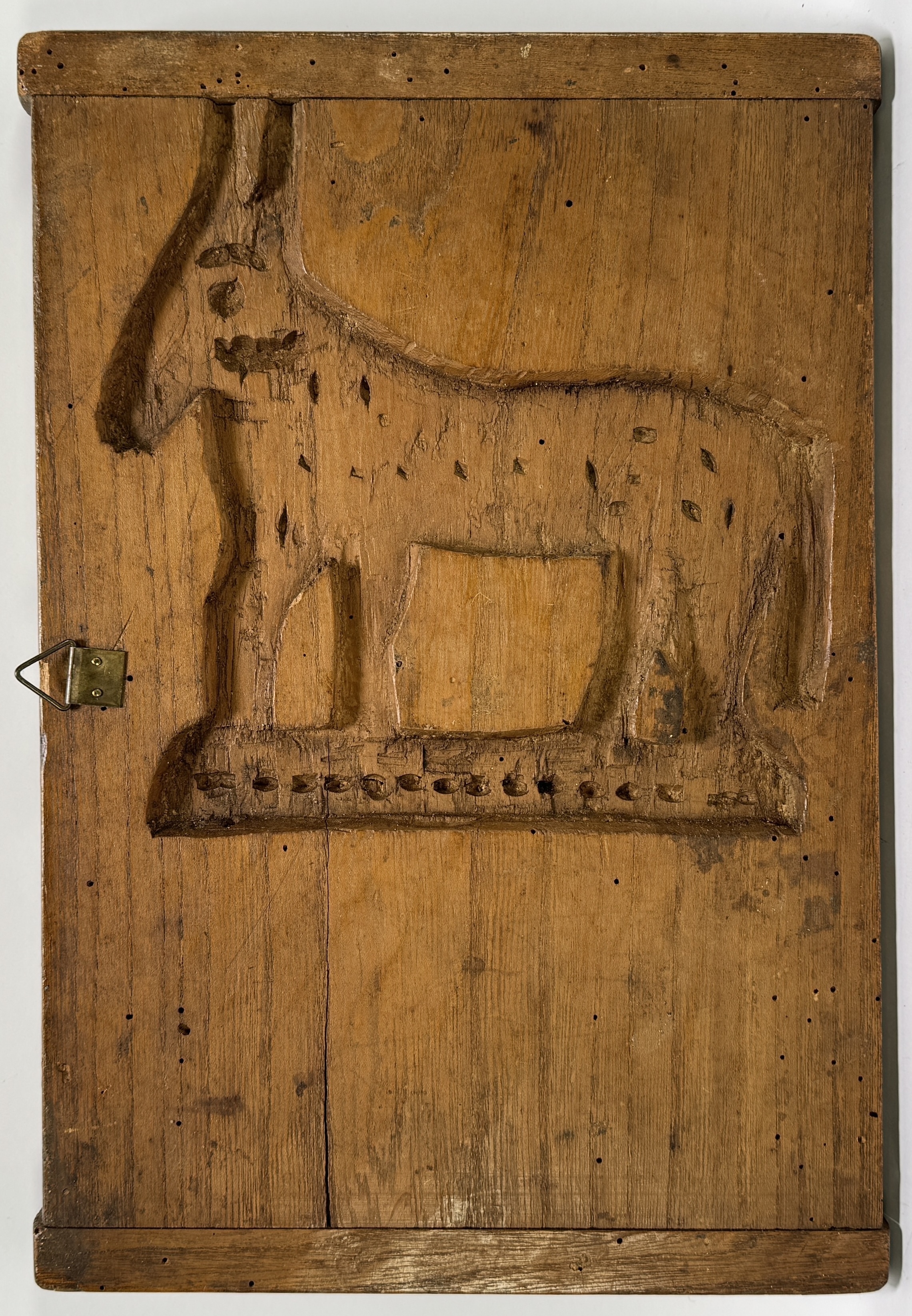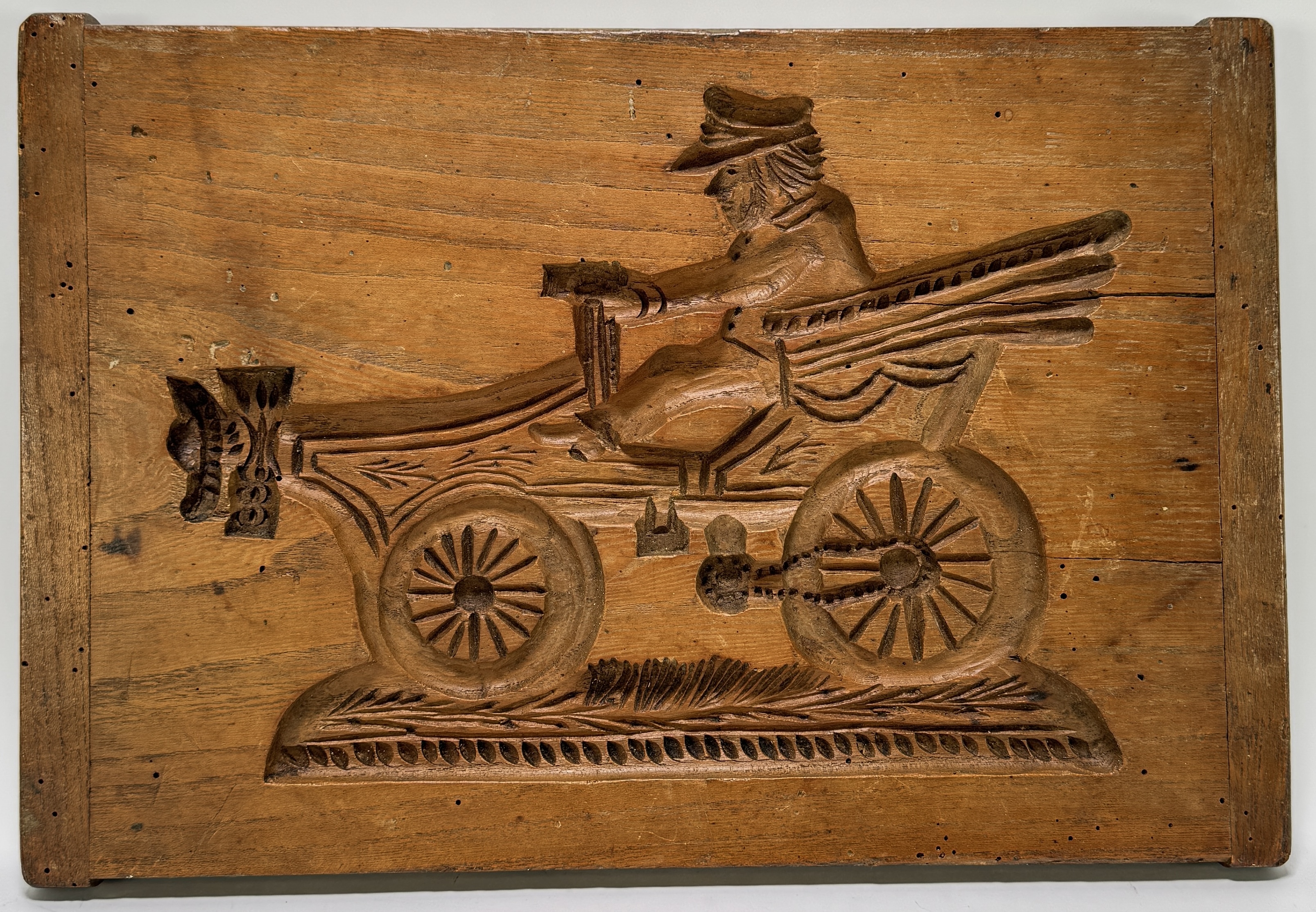 Tweezijdige houten speculaasplank uit Nederland, eerste helft 20e eeuw. Uitgevoerd in beukenhout met handgesneden voorstelling van een koetsier in wagen en een tweede eenvoudige voorstelling van een dier. Deze speculaasplank zelf beoordelen? Je bent welkom op onze kijkdagen op 28, 29 en 30 november! |