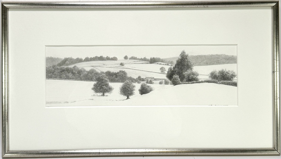 Potloodtekening op papier door Peter Durieux (1951) in realistische stijl, vervaardigd laatste kwart 20e eeuw. Het werk toont een panoramisch landschap met glooiende heuvels, bomen, akkers en een boerderij centraal in de compositie. De tekening bevindt zich in een zilverkleurige lijst met passe-partout. Signatuur gedeeltelijk onder de passe-partout. Klaar om te bieden? Registreer je nu en doe mee aan de veiling! |