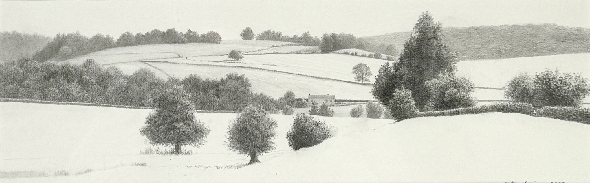 Tekening, Peter Durieux – panoramisch landschap met boerderij, ca. 1980