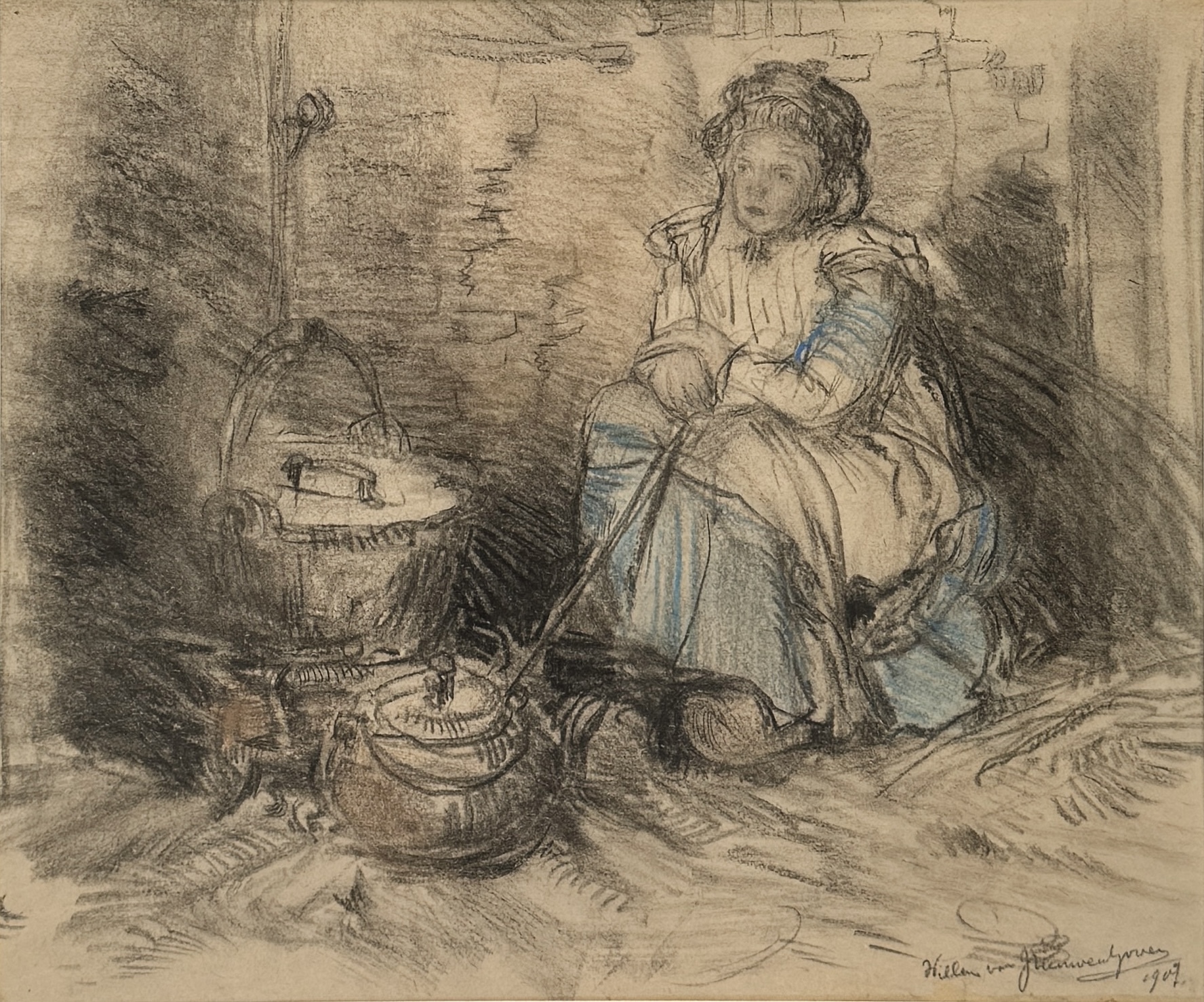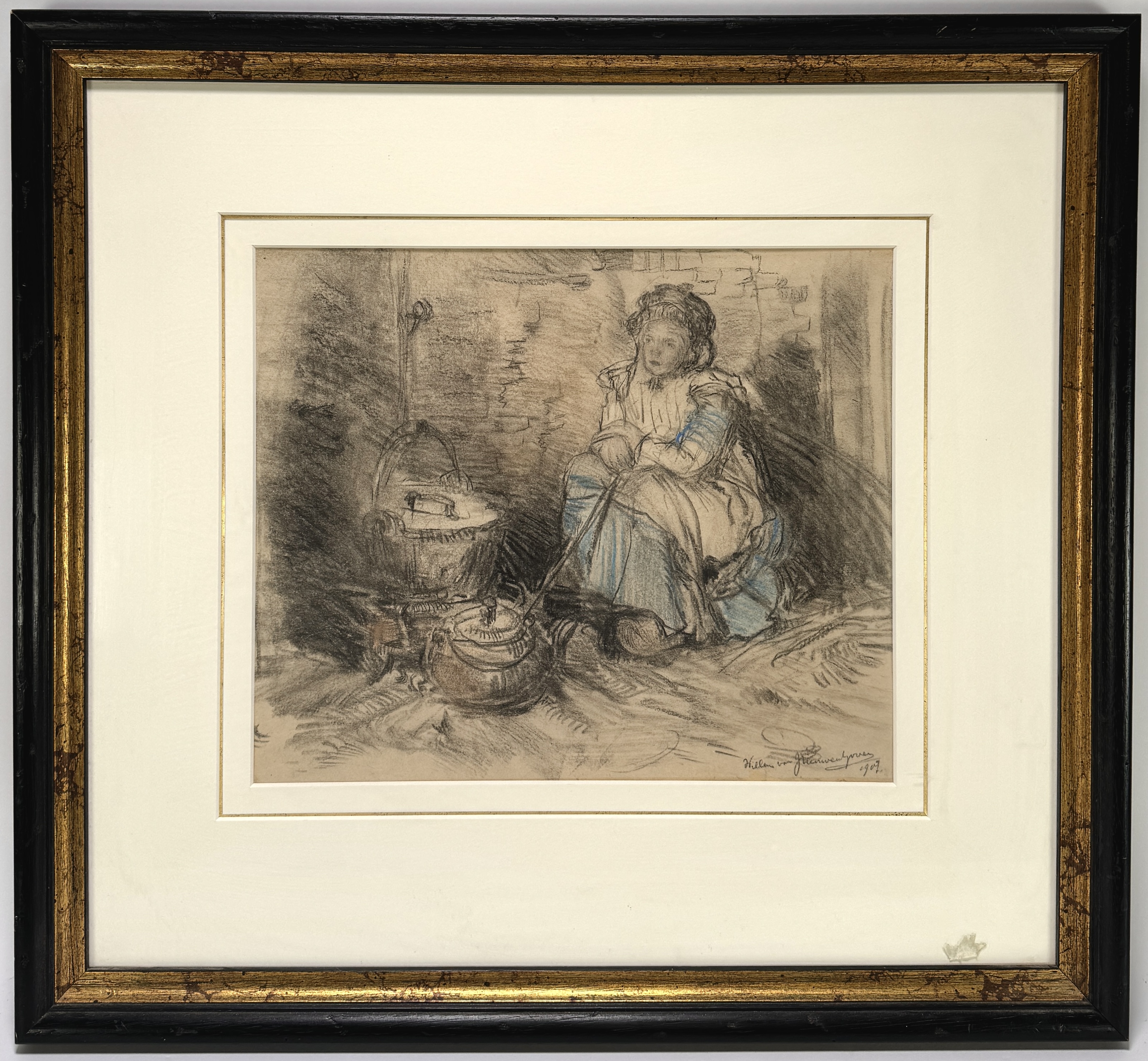 Potloodtekening op papier door Willem van Nieuwenhoven (1879–1973), gesigneerd en gedateerd 1909 rechtsonder. Afbeelding van een zittend meisje bij een kookpot en ketel. Uitgevoerd in realistische stijl, Nederlandse herkomst. Wil je direct deelnemen? Plaats vanaf 21 november alvast een schriftelijk bod via onze website! |