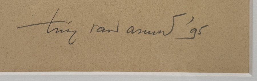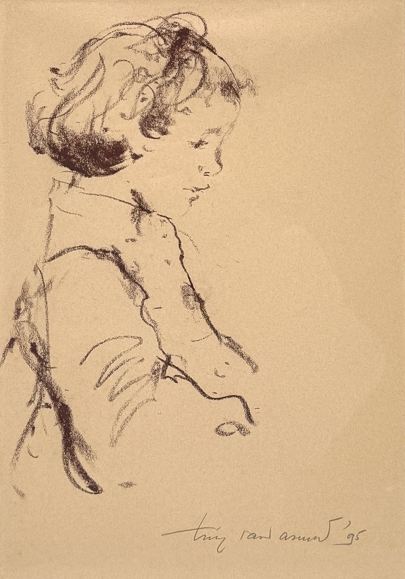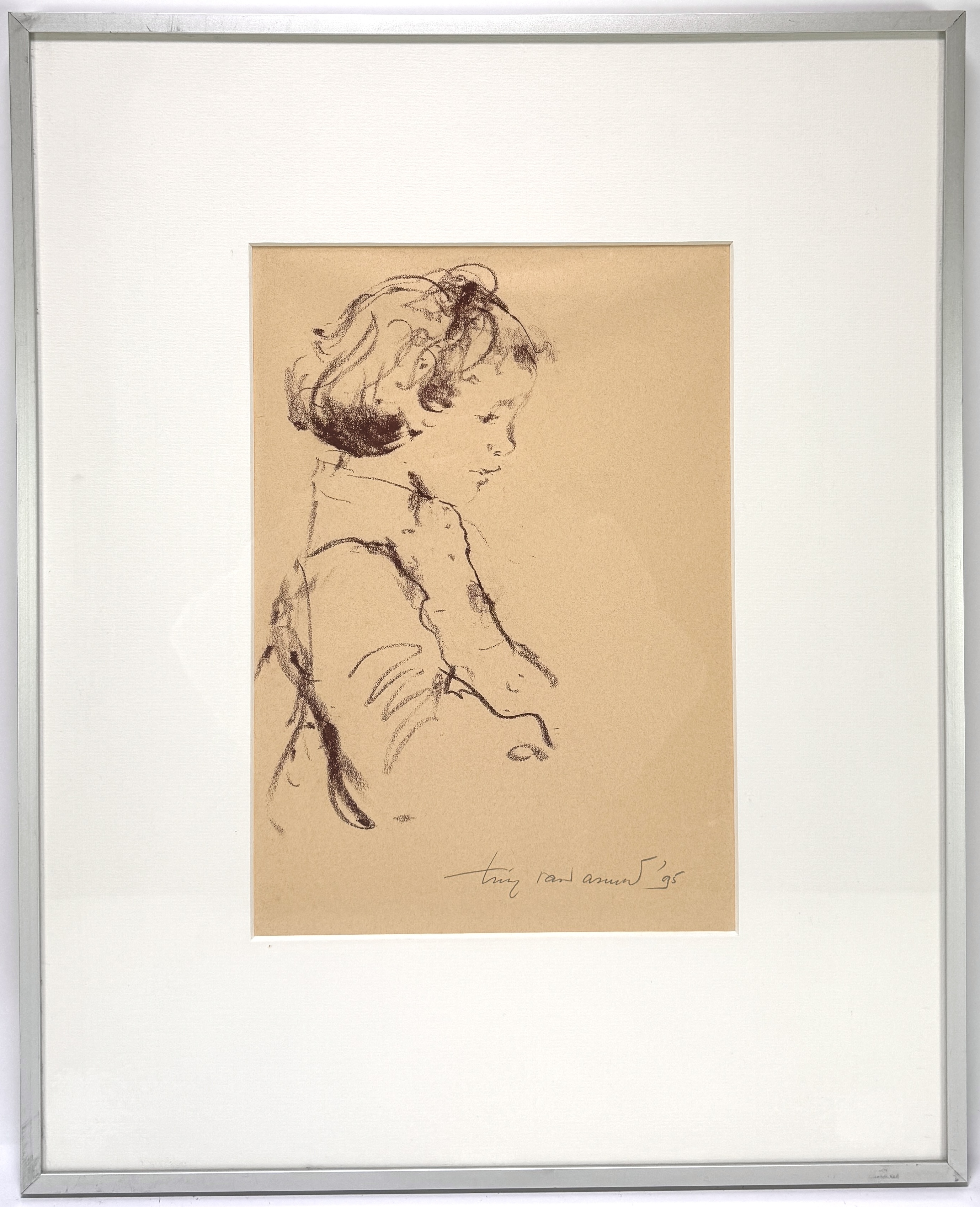 Tekening in houtskool op papier, gesigneerd en gedateerd rechtsonder “Tiny Rand Assunt ’95”. Voorstelling van een meisjesportret in profiel, met losse krullen en neergeslagen blik. Het werk is uitgevoerd in een impressionistische, schetsmatige stijl met vloeiende lijnen en sobere detaillering. Nederlandse herkomst. Ingelijst met een zilverkleurige lijst en passe-partout. Geïnteresseerd? Bezoek onze kijkdagen op 28, 29 of 30 november van 11:00 tot 17:00 uur! |