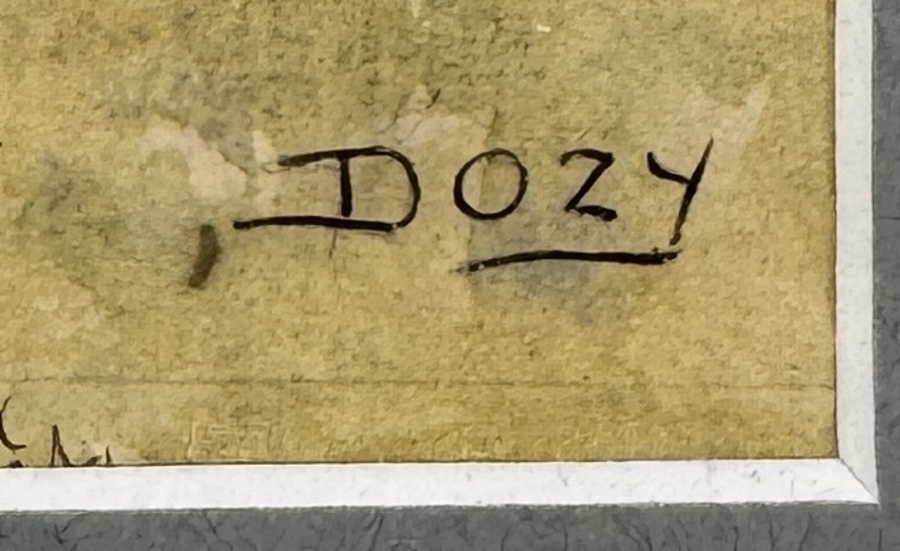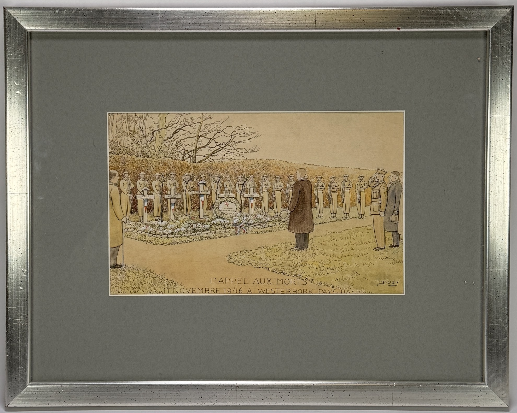Ingekleurde pentekening op papier door Reinhart Dozy (1880-1947), getiteld “L’Appel aux Morts 11 novembre 1946 à Westerbork (Pays-Bas)”. Het werk toont een stille herdenkingsceremonie bij Kamp Westerbork op 11 november 1946 waarin soldaten in linie staan bij houten kruisen en een centrale spreker. Rechtsonder gesigneerd DOZY.