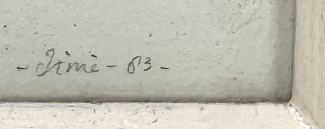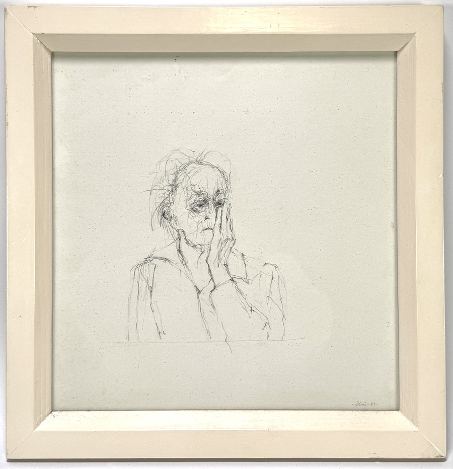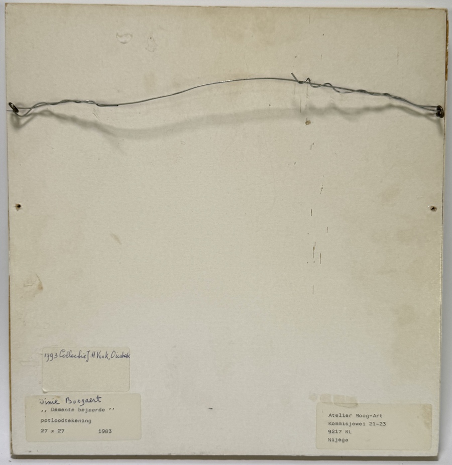 Potloodtekening op papier door Dinie Boogaart (1963), getiteld “Demente bejaarde”, gesigneerd en gedateerd ‘Dinie – 83’ rechtsonder. Figuratieve studie van een oudere vrouw in ingetogen houding, uitgevoerd in 1983, voorzien van atelier- en collectie-etiketten aan de achterzijde, in een crèmekleurige lijst. Geïnteresseerd? Bezoek onze kijkdagen op 28, 29 of 30 november van 11:00 tot 17:00 uur! |