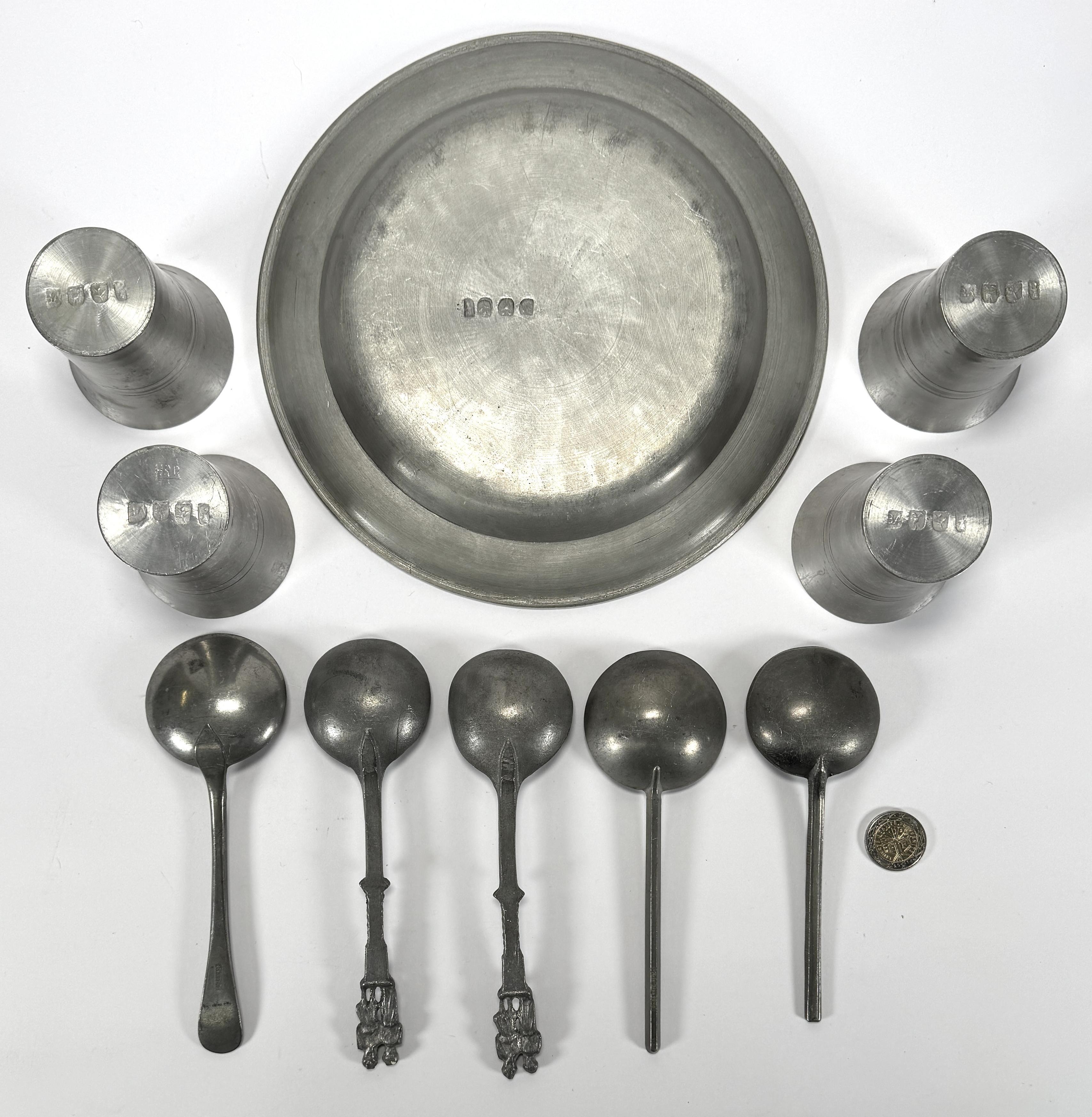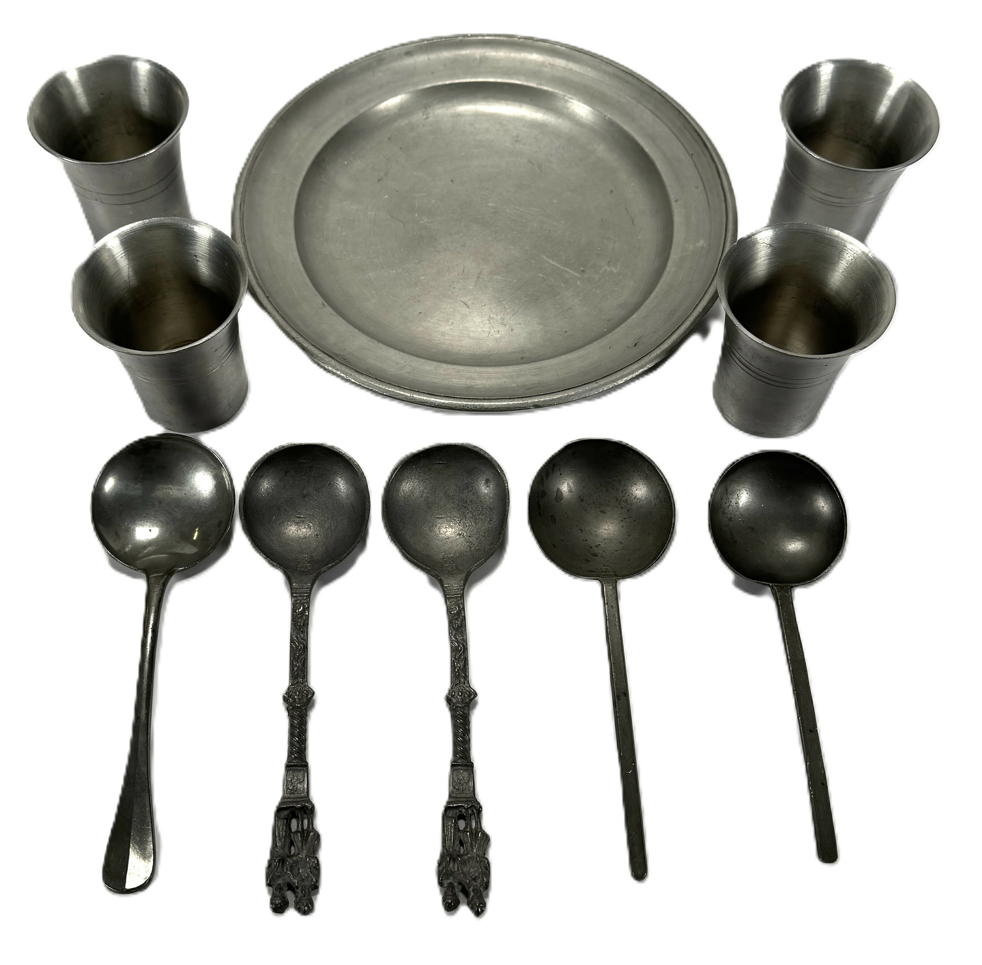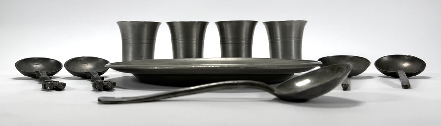 Tinnen servies – schaal, bekers en lepels, 20e eeuw