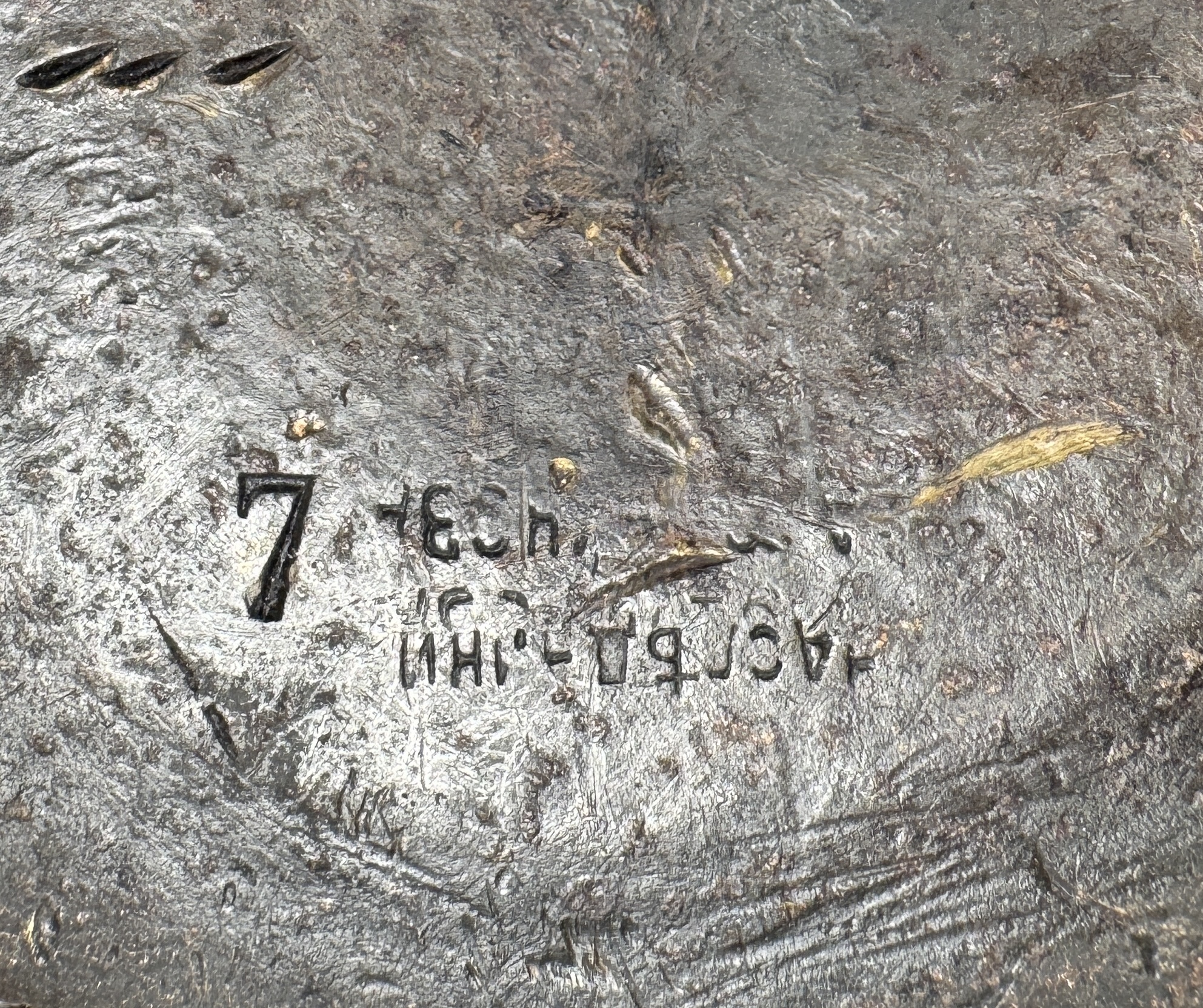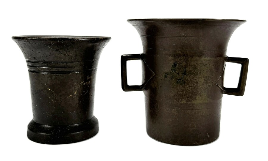 Twee ongelijke bronzen vijzels, vervaardigd door gieten en draaien uit een zware koperlegering. De kleinste vijzel heeft een Cyrillische inscriptie, inclusief het nummer "7", op de bodem. Daterend uit eind 19e eeuw/begin 20e eeuw. Geïnteresseerd? Bezoek onze kijkdagen op 28, 29 of 30 november van 11:00 tot 17:00 uur! |