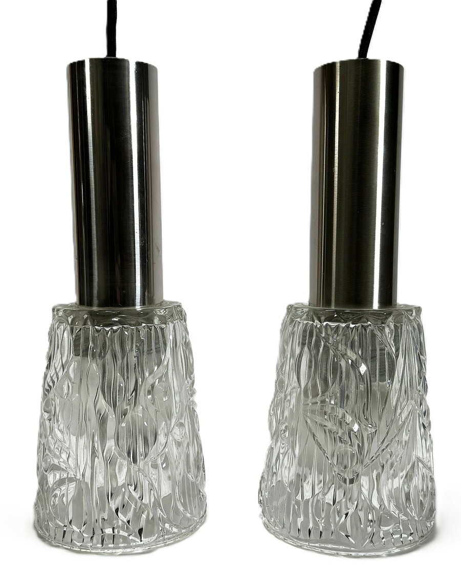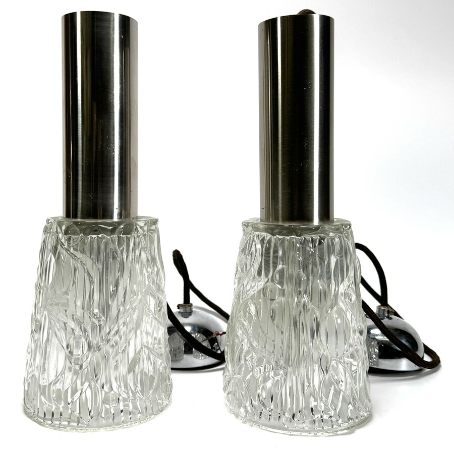 Twee Mid-century modern hanglampen, vervaardigd met persglas techniek en metaalbewerking. Het glas heeft een ruwe "ice glass"-textuur en is bevestigd aan een strakke cilindervormige metalen fitting. Daterend uit de periode ca. 1965–1975 en van West-Europese herkomst. Klaar om te bieden? Registreer je nu en doe mee aan de veiling! |
