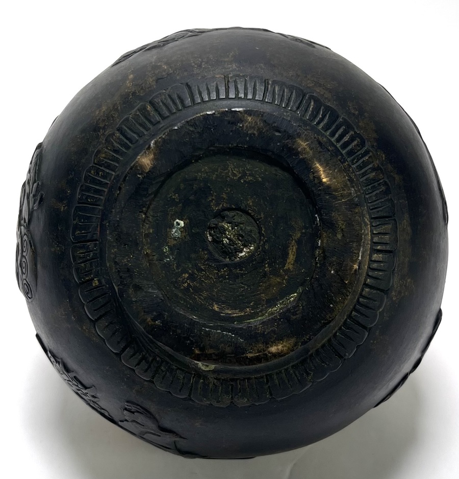 Brons gegoten vaas met reliëfdecoratie, Japan Meiji periode, begin 20e eeuw. De vaas toont rondom kindfiguren in dynamische poses, deels verguld, omringd door florale motieven en symbolische objecten. Kenmerkend zijn het bolvormige lichaam, de korte hals en voet, evenals de contrasterende combinatie van het donkere brons en vergulde details die de decoratie accentueren. Kom langs tijdens de kijkdagen (28 t/m 30 november) en ontdek deze vaas zelf! |