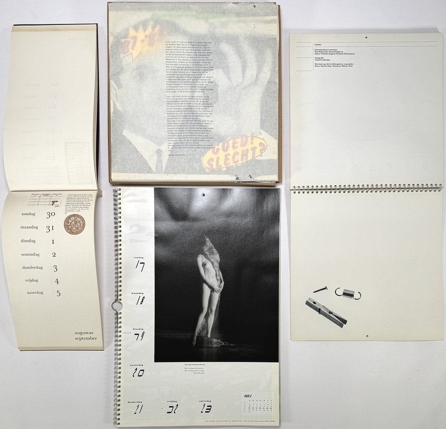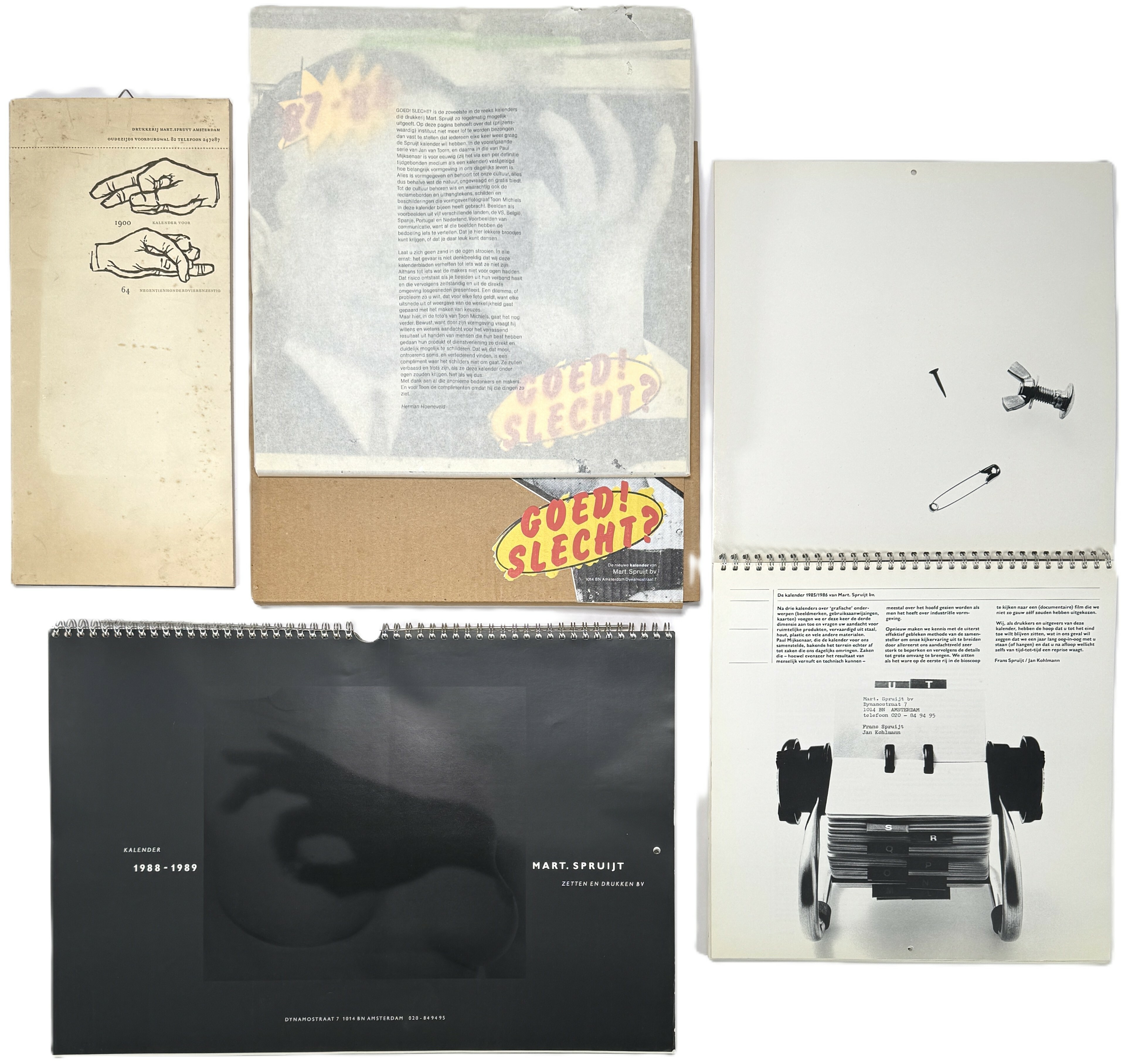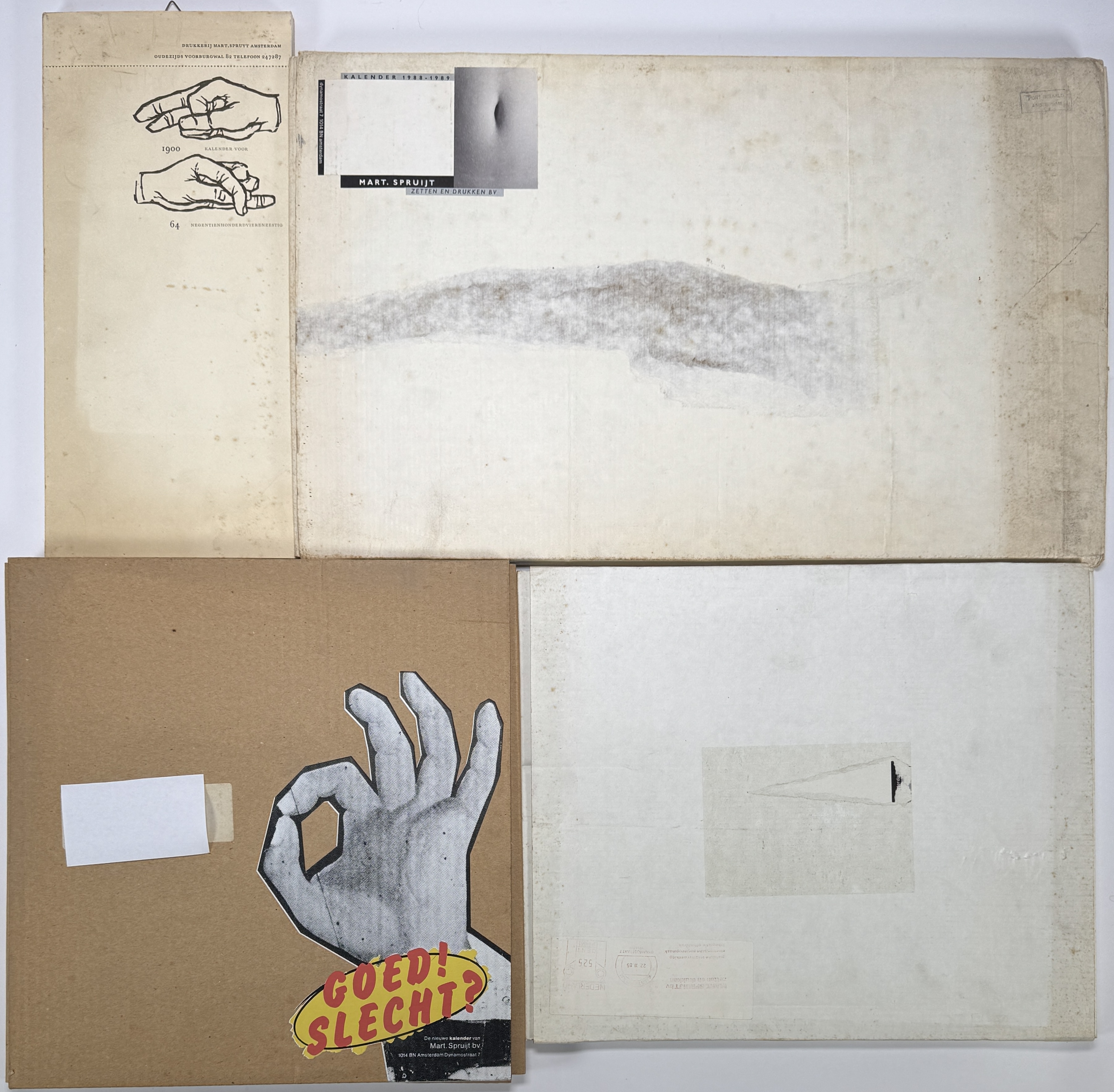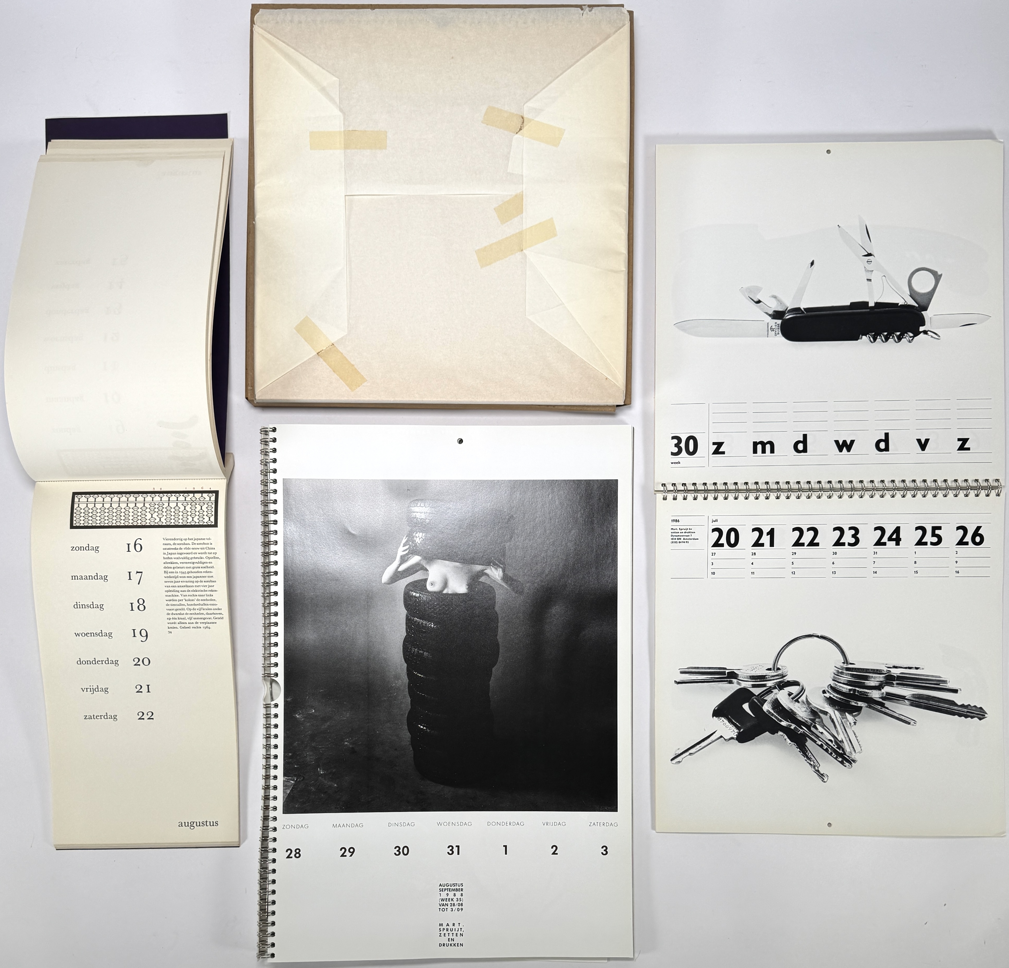 Vier kalenders van Drukkerij Mart. Spruijt bv, Amsterdam, uit de periode jaren 1960–1980, uitgevoerd in offsetdruk op papier en karton. De ontwerpen tonen conceptuele typografie en fotografische composities in modernistische stijl, waaronder de uitgave “GOED! SLECHT?” en de kalender 1988–1989 met kenmerkende grafische vormgeving. Dit kalanders zelf beoordelen? Je bent welkom op onze kijkdagen op 28, 29 en 30 november! |