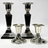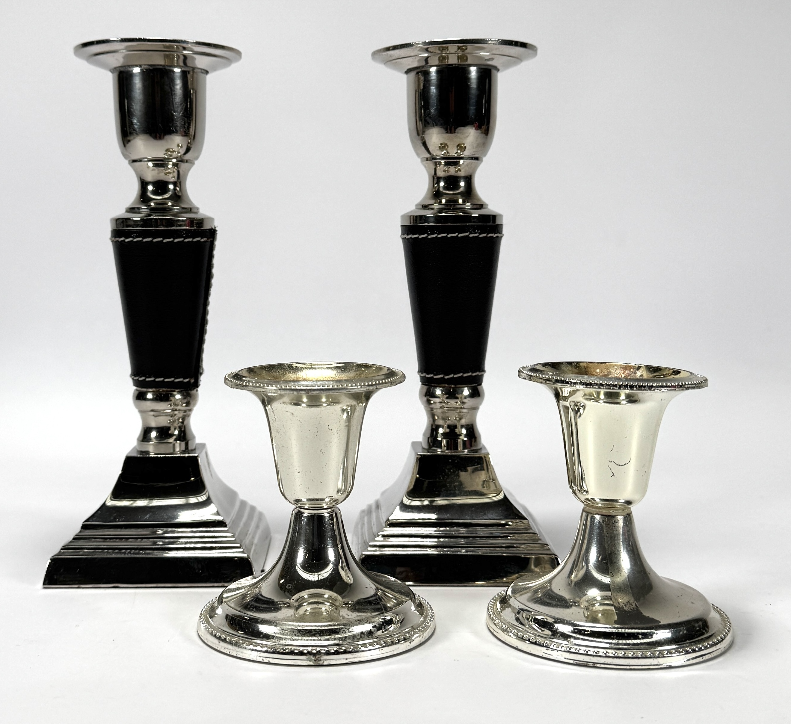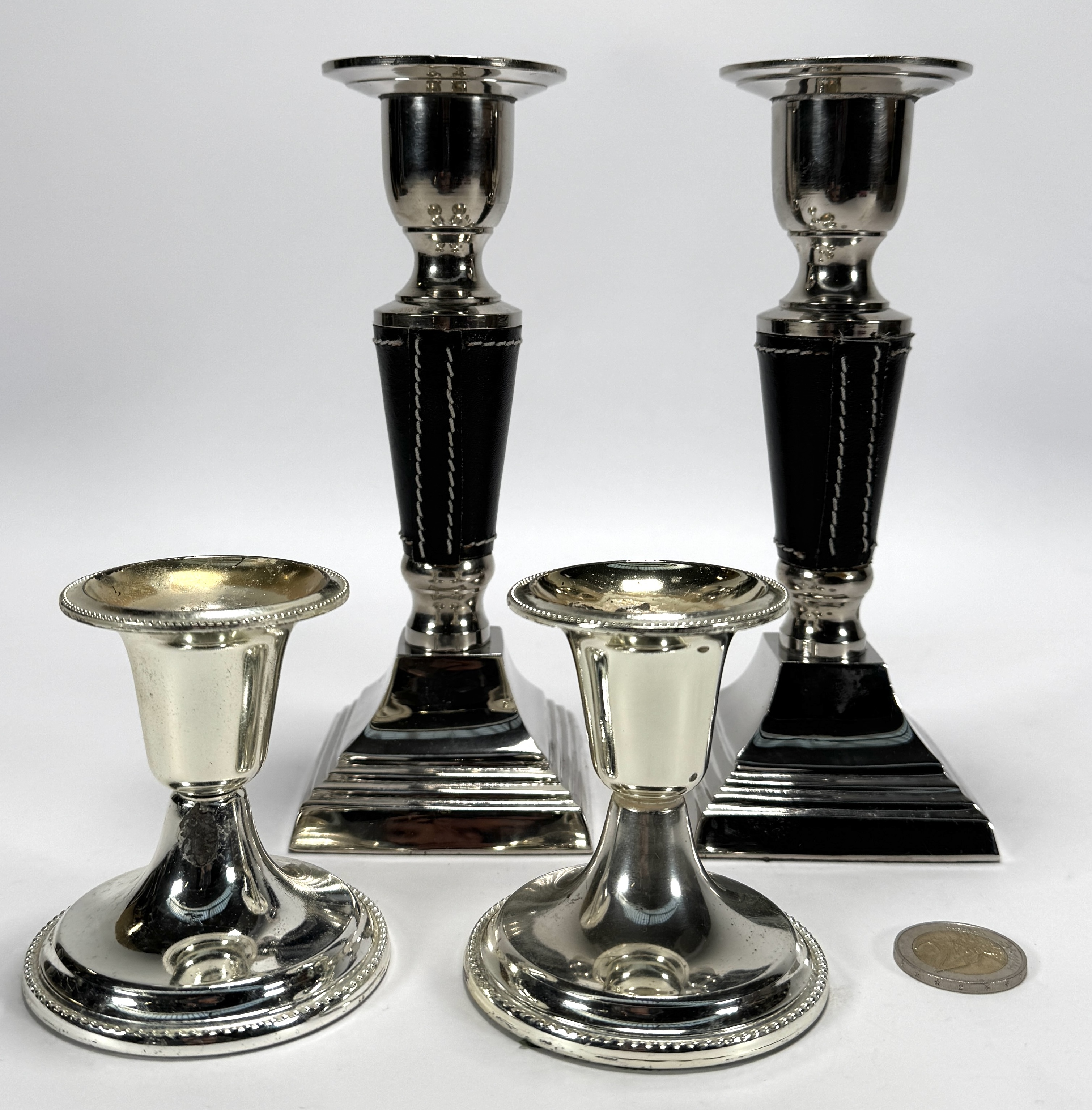 Vier kandelaren van verzilverd metaal, daterend uit de tweede helft 20e eeuw. Twee kleinere kandelaren zijn uitgevoerd in een traditionele stijl, terwijl de twee grotere kandelaren een Mid-century modern design hebben met zwarte bekleding en een vierkante voet. Klaar om te bieden? Registreer je nu en doe mee aan de veiling! |