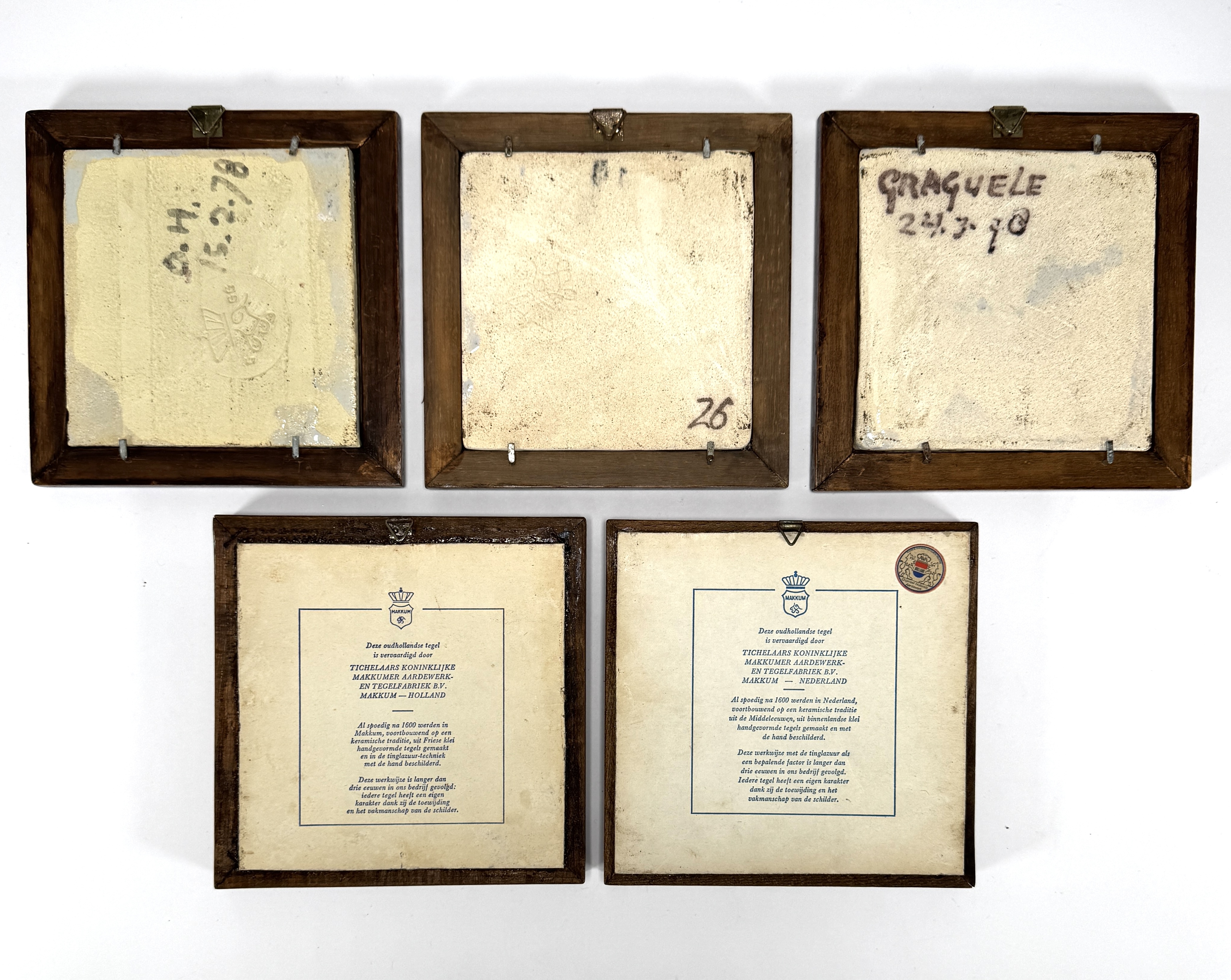 Vijf ingelijste aardewerktegels van Koninklijke Tichelaar Makkum, handbeschilderd in blauw-wit en polychroom decor, uitgevoerd in houten lijstjes, ca. midden twintigste eeuw, Nederland. Vervaardigd in tinglazuurtechniek op aardewerk. Eerst deze tegels zien voordat je biedt? Bezoek onze kijkdagen op 28, 29 en 30 november van 11:00 tot 17:00 uur! |