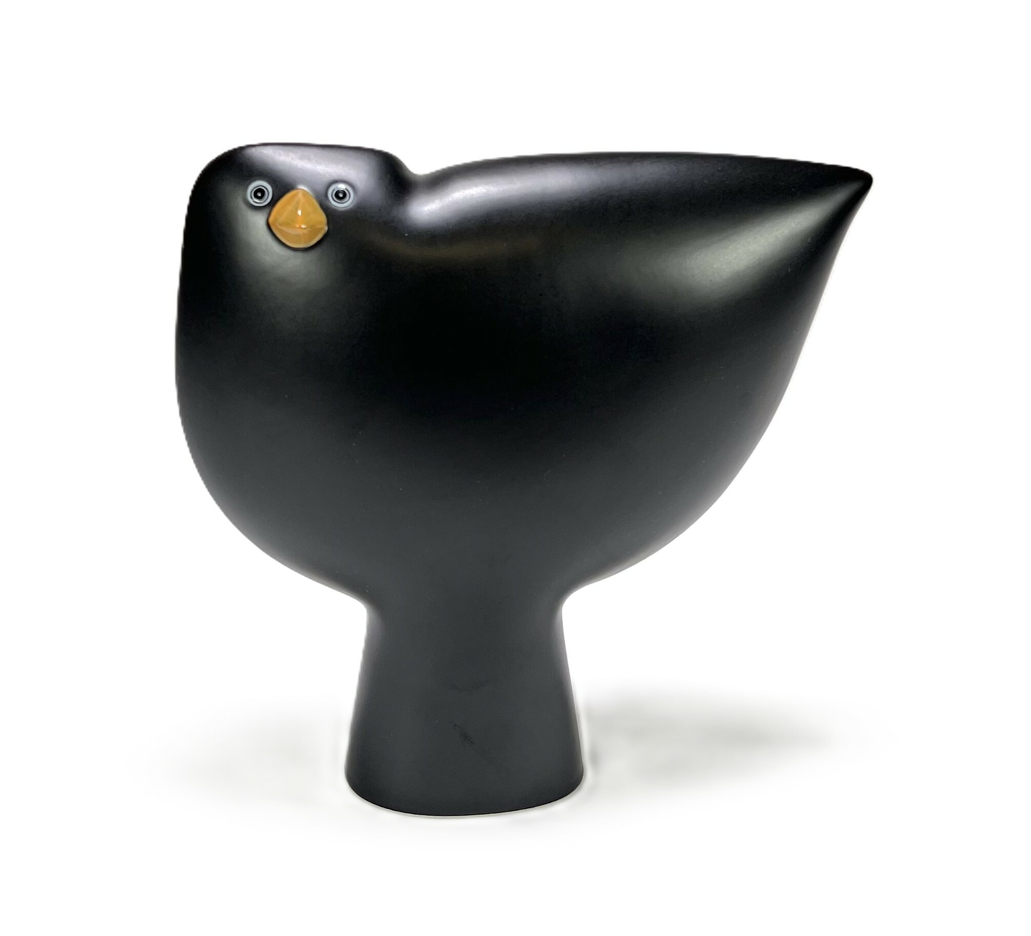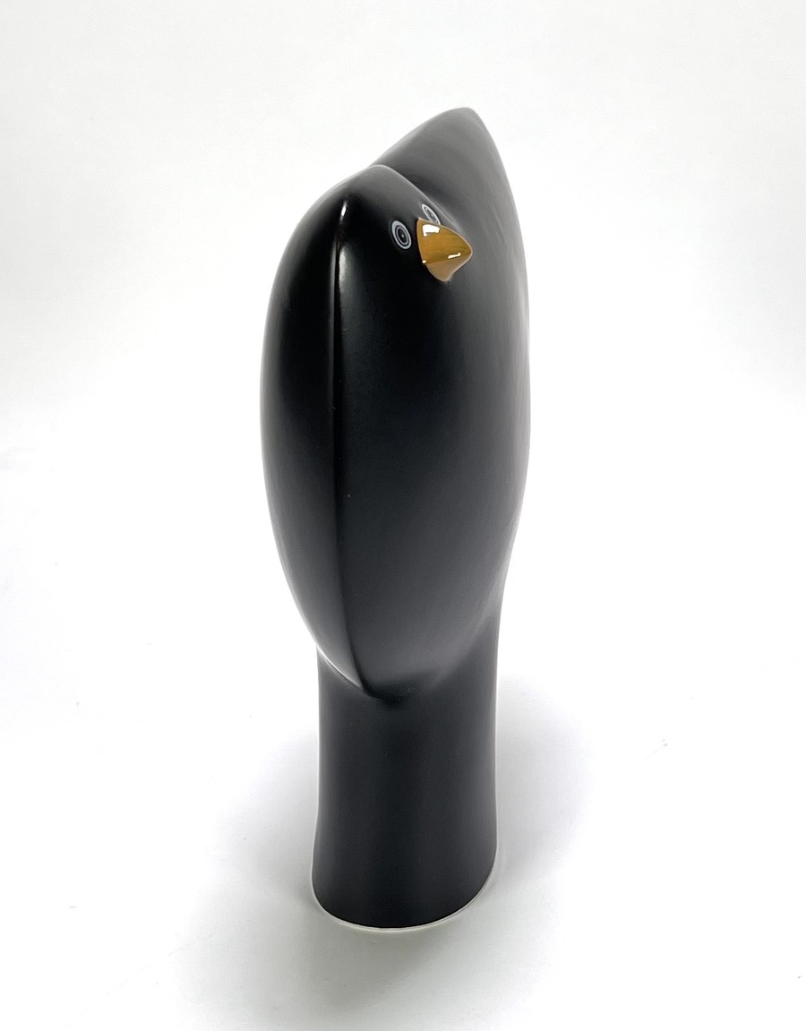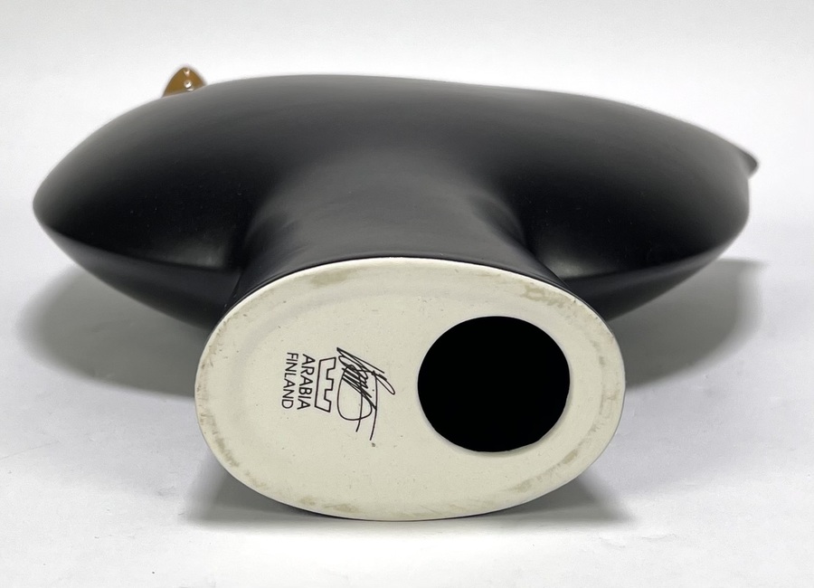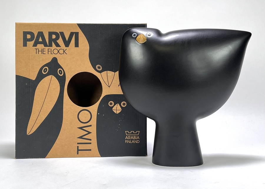 Keramische beeld in de vorm van een vogel, model "Timo" uit de "Parvi" (The Flock) collectie, ontworpen door Howard Smith (1928–2021) voor Arabia Finland. Het minimalistische object is uitgevoerd in mat zwart glazuur, met een gele snavel en gestileerde ogen, kenmerkend voor Scandinavisch design uit de jaren 1990. Onderzijde gemerkt en in de originele verpakking. Wil je dit object in het echt bekijken? Kom naar de kijkdagen op 28, 29 en 30 november! |
