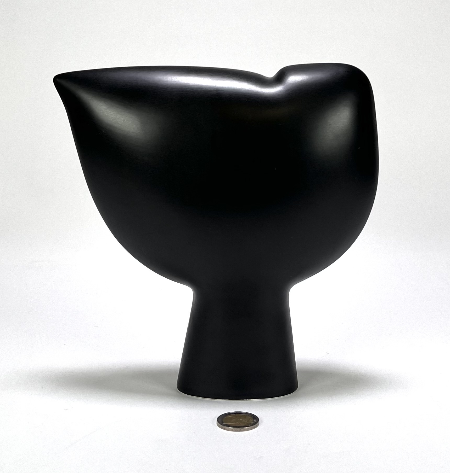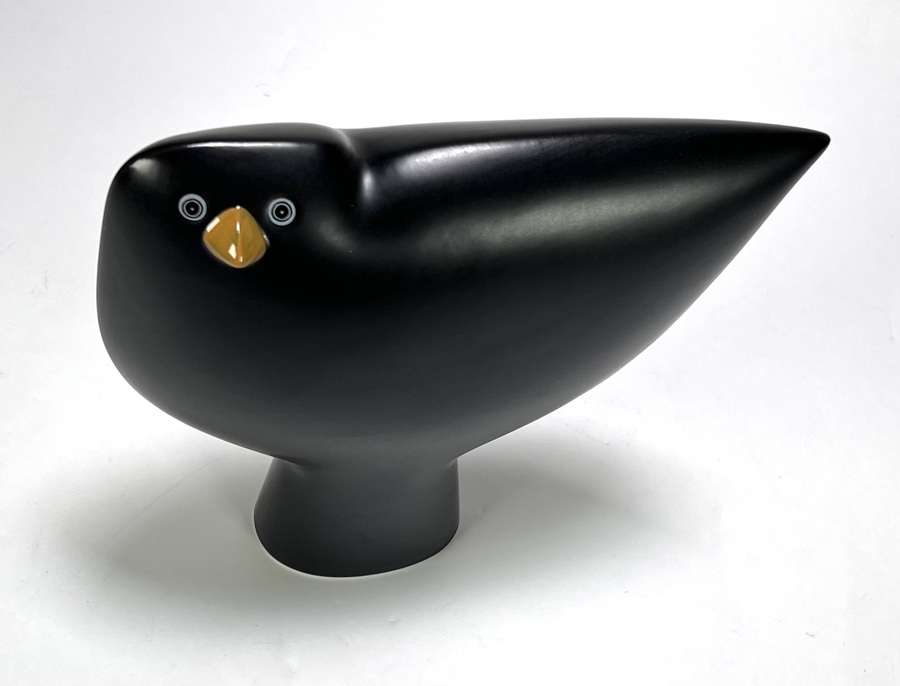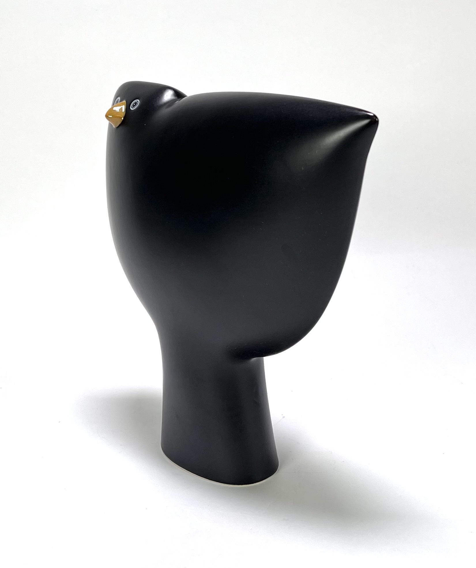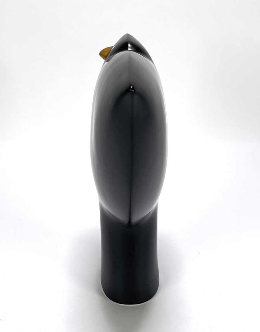 Keramische beeld in de vorm van een vogel, model "Timo" uit de "Parvi" (The Flock) collectie, ontworpen door Howard Smith (1928–2021) voor Arabia Finland. Het minimalistische object is uitgevoerd in mat zwart glazuur, met een gele snavel en gestileerde ogen, kenmerkend voor Scandinavisch design uit de jaren 1990. Onderzijde gemerkt en in de originele verpakking. Wil je dit object in het echt bekijken? Kom naar de kijkdagen op 28, 29 en 30 november! |