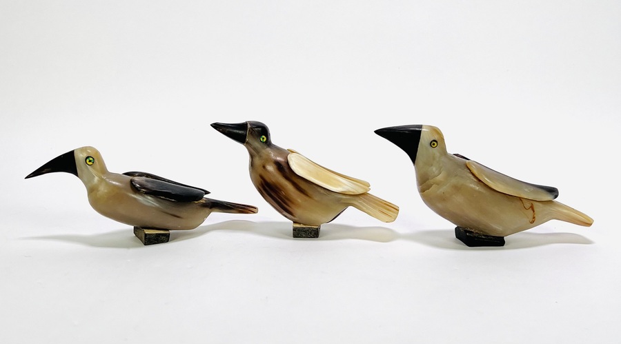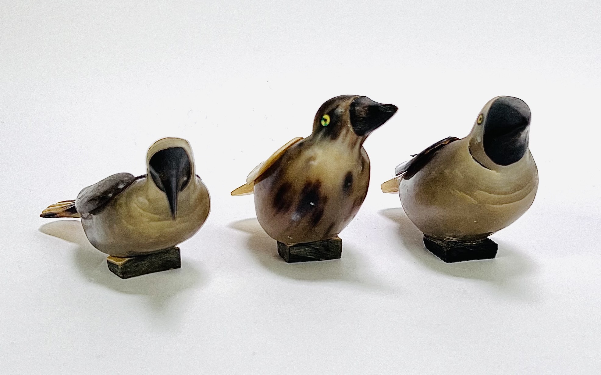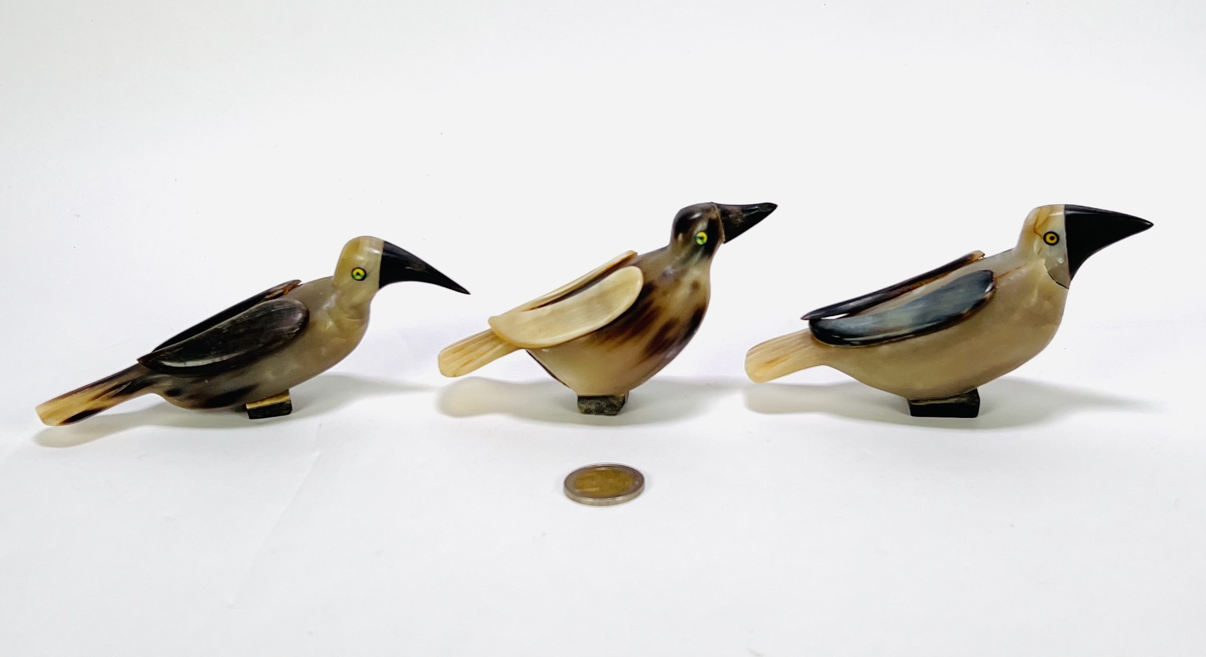 Drie figuratieve vogelbeeldjes gemaakt van gesneden en gevormde hoorn, circa 1950–1970. De beelden kenmerken zich door de natuurlijke, doorschijnende bruine kleur van het hoorn en de gestileerde vorm. De details, zoals de scherpe snavels en de opvallend gele ingelegde ogen, zijn handgemaakt. Geïnteresseerd? Bezoek onze kijkdagen op 28, 29 of 30 november van 11:00 tot 17:00 uur! |