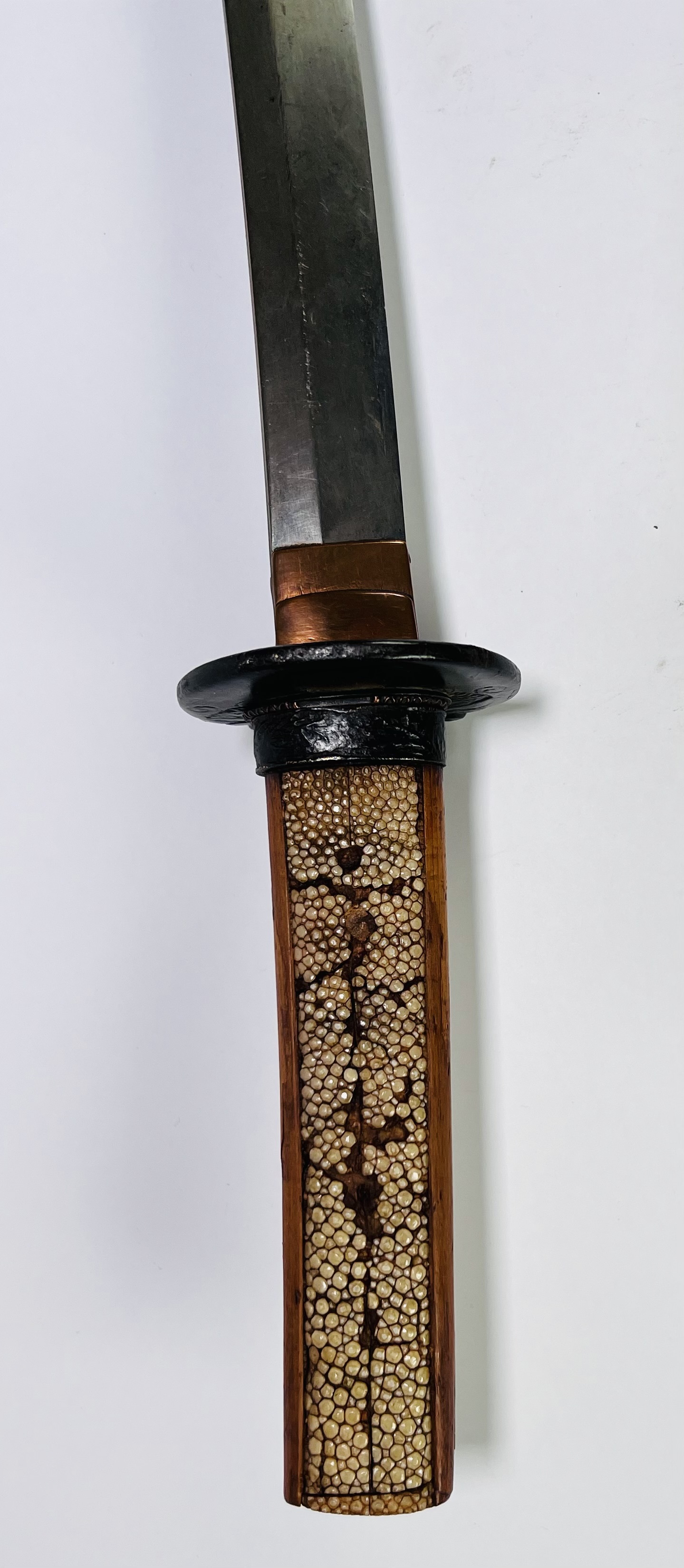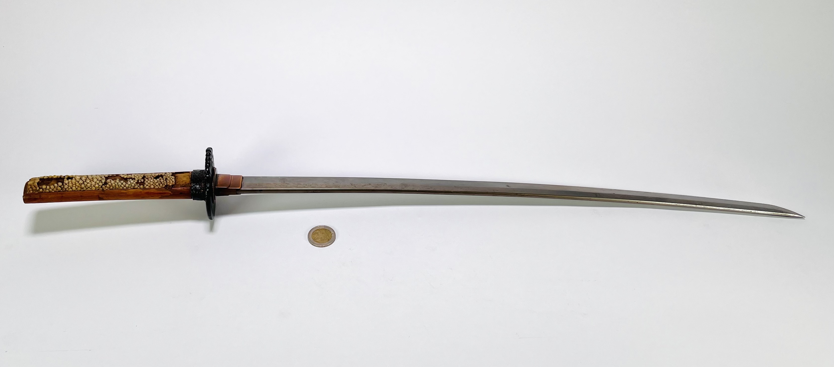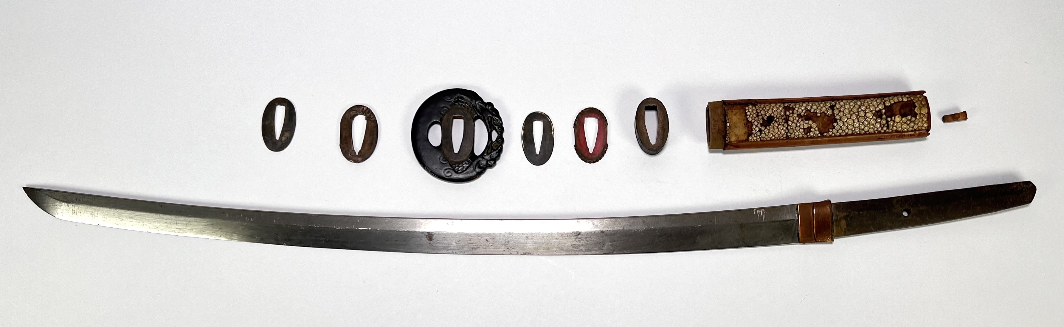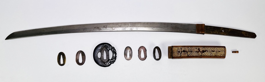 Japans wakizashi met ijzeren tsuba, vervaardigd in traditionele Edo stijl door smid Kamimasa, tweede helft 18e eeuw, Japan (Hizen). Gesmeed en gehard staal met gegraveerde signatuur 上正作, tsuba gemerkt 肥前国住. Lemmet, beslag en montuur tonen de kenmerkende techniek van de Hizen-school, met gebruik van staal, ijzer, messing en roggehuid in zorgvuldig samengestelde configuratie. Jouw kans op dit object begint met registreren – bied live of online mee! |