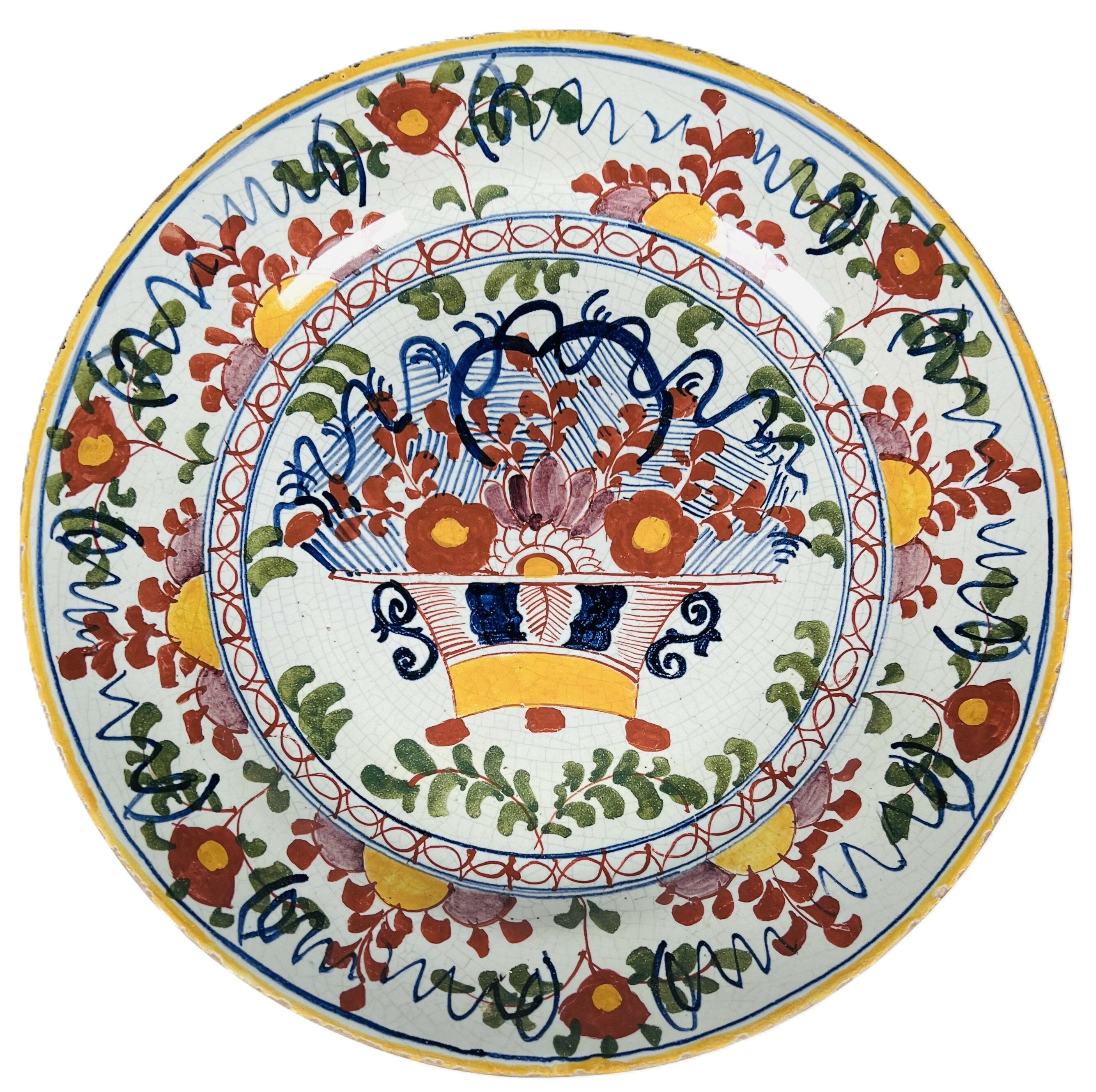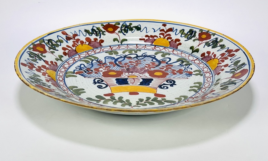 Delfts faïence schaal, 18e eeuw – bloemenmand en Rococo-decoratie